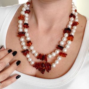 Collana Perle E Ambra Naturale A Due Fili