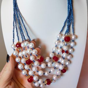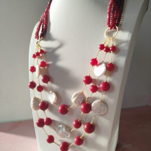 Collana Rubino Agata E Perle Multifilo Con Dettagli Dorati