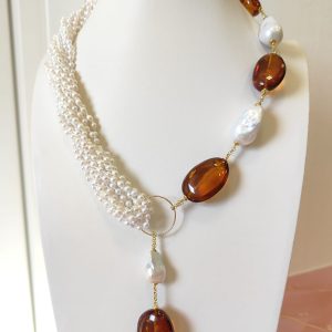 Collana Ambra E Perle Con Ciondolo Lungo In Argento Dorato