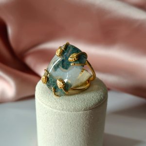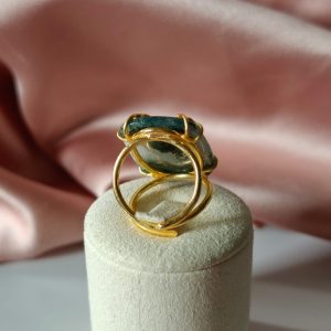 La montatura in ottone dorato è realizzata artigianalmente e studiata per valorizzare la pietra senza sovrastarla. I dettagli decorativi che la circondano aggiungono eleganza e carattere, mentre la struttura regolabile garantisce comfort e adattabilità, permettendo di indossare l’anello su diverse misure mantenendo stabilità e armonia estetica.
