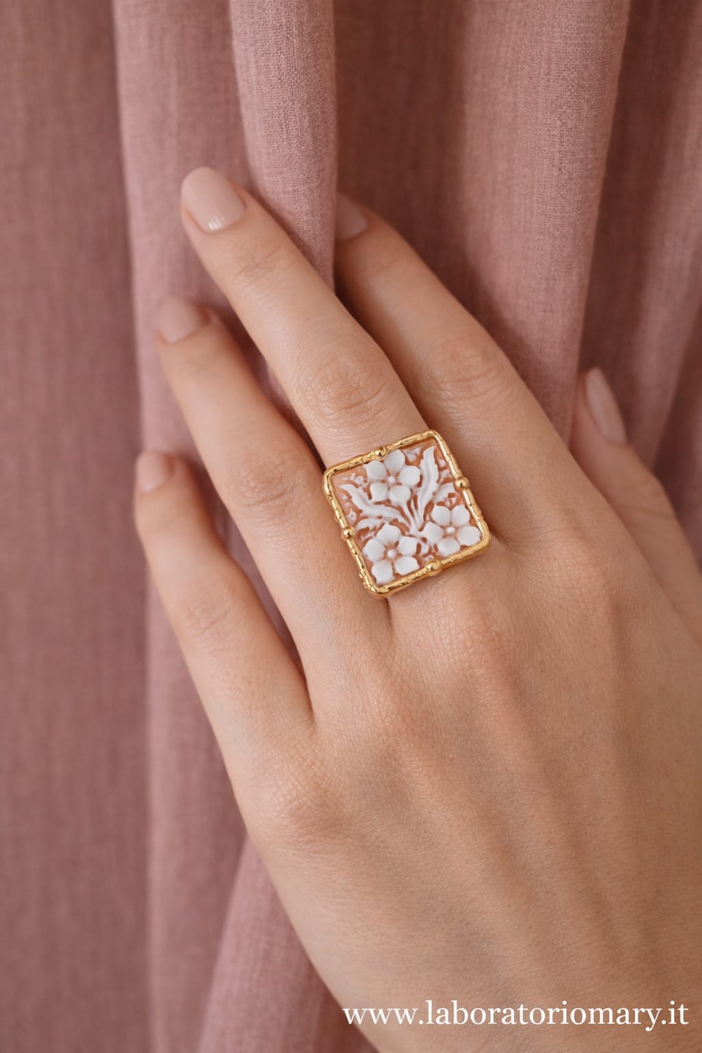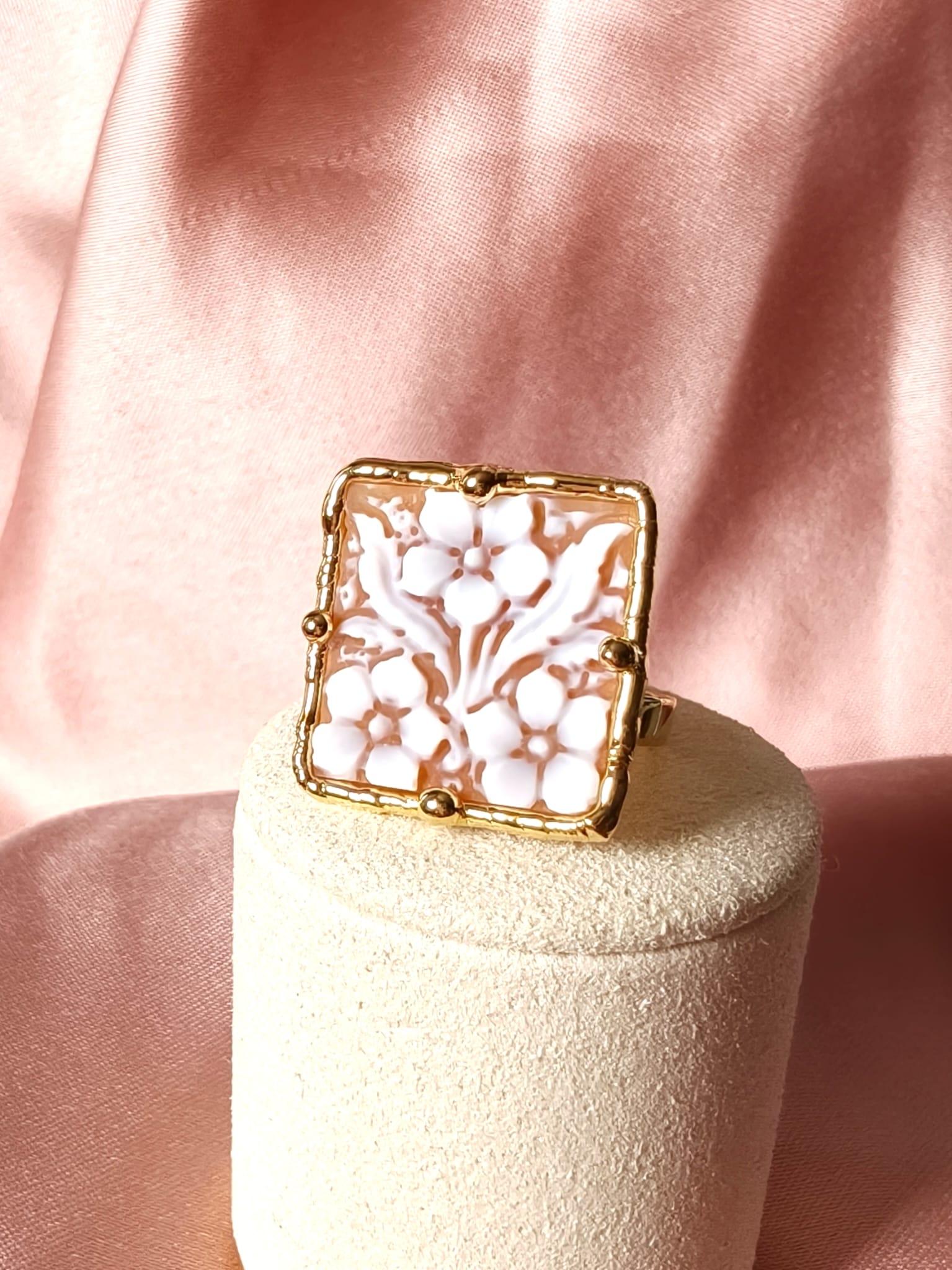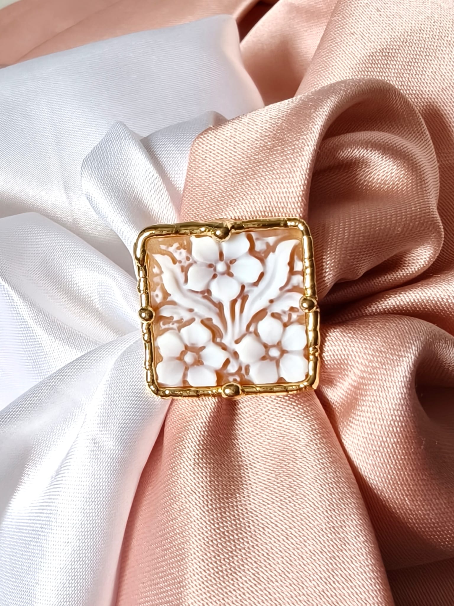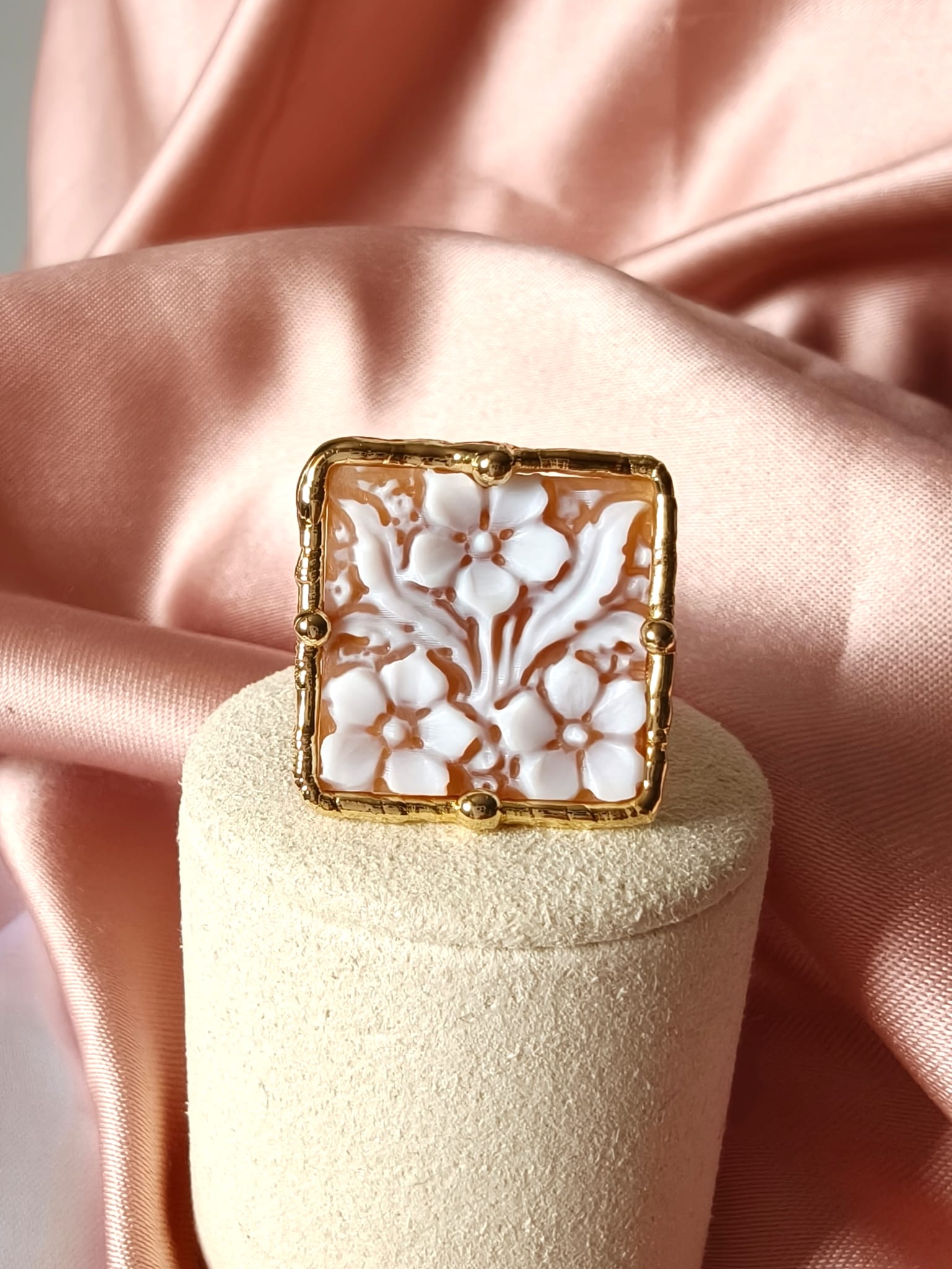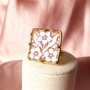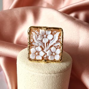 Il protagonista dell’anello è il cammeo quadrato, inciso interamente a mano con un motivo floreale armonioso e delicato. I fiori emergono con eleganza dal fondo, creando un raffinato gioco di rilievi e chiaroscuri che valorizza la superficie e rende il cammeo una piccola opera d’arte. Ogni linea, infatti, è frutto di un gesto sapiente, che rende il disegno equilibrato e ricco di profondità.