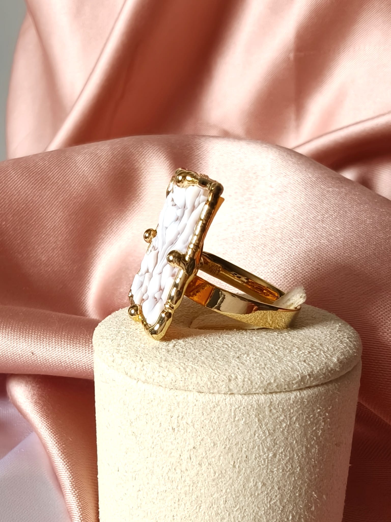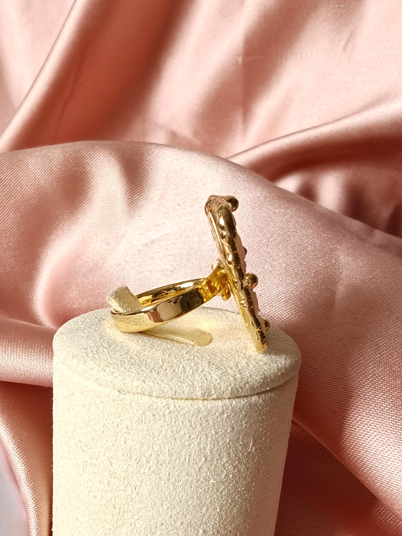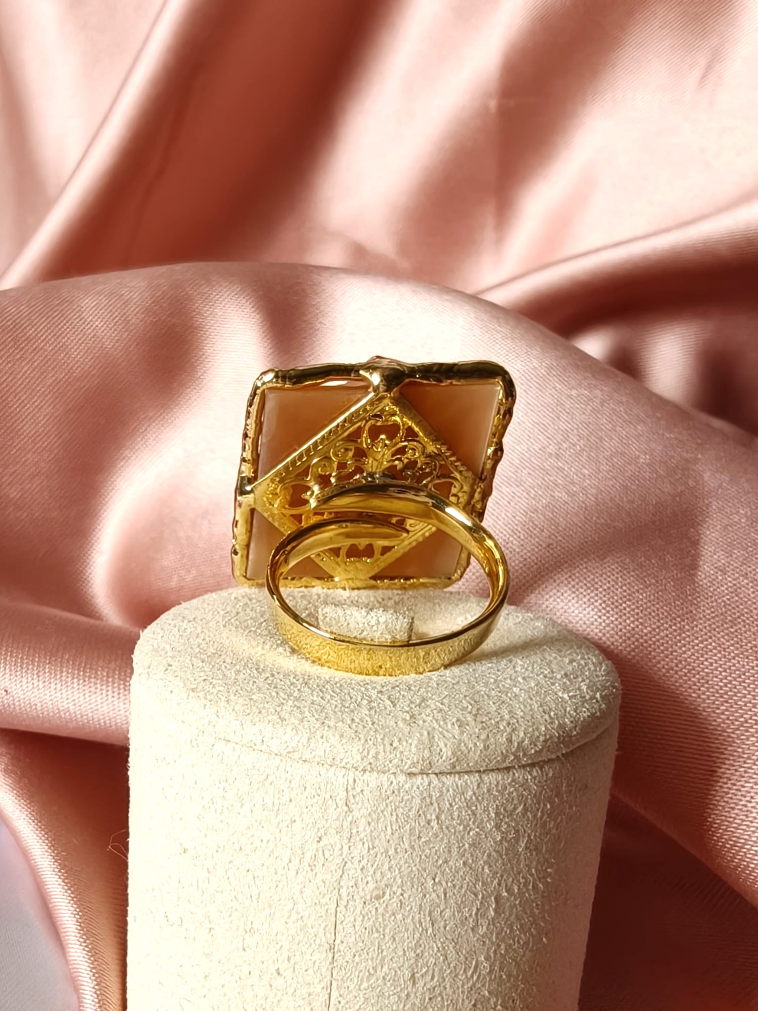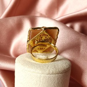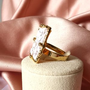 La montatura è realizzata in argento placcato oro, scelta per conferire luminosità e calore al gioiello. Inoltre, la finitura dorata incornicia il cammeo con discrezione, esaltandone i toni chiari e la raffinatezza dell’incisione. L’anello è regolabile, caratteristica che lo rende pratico e confortevole, adattandosi facilmente a diverse misure senza rinunciare all’estetica.