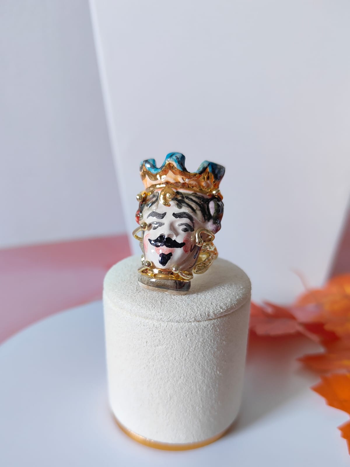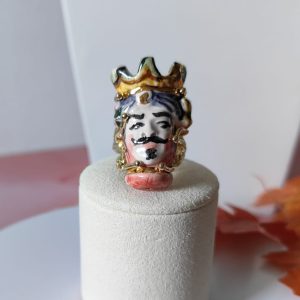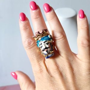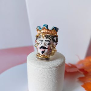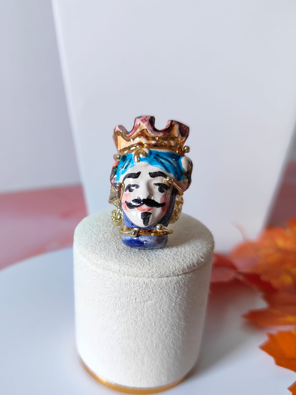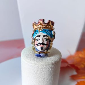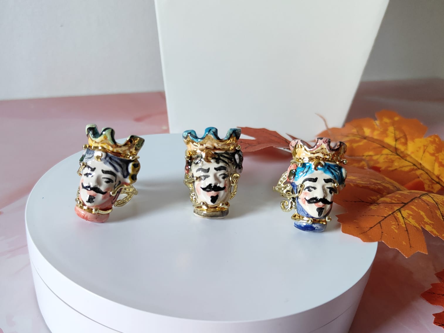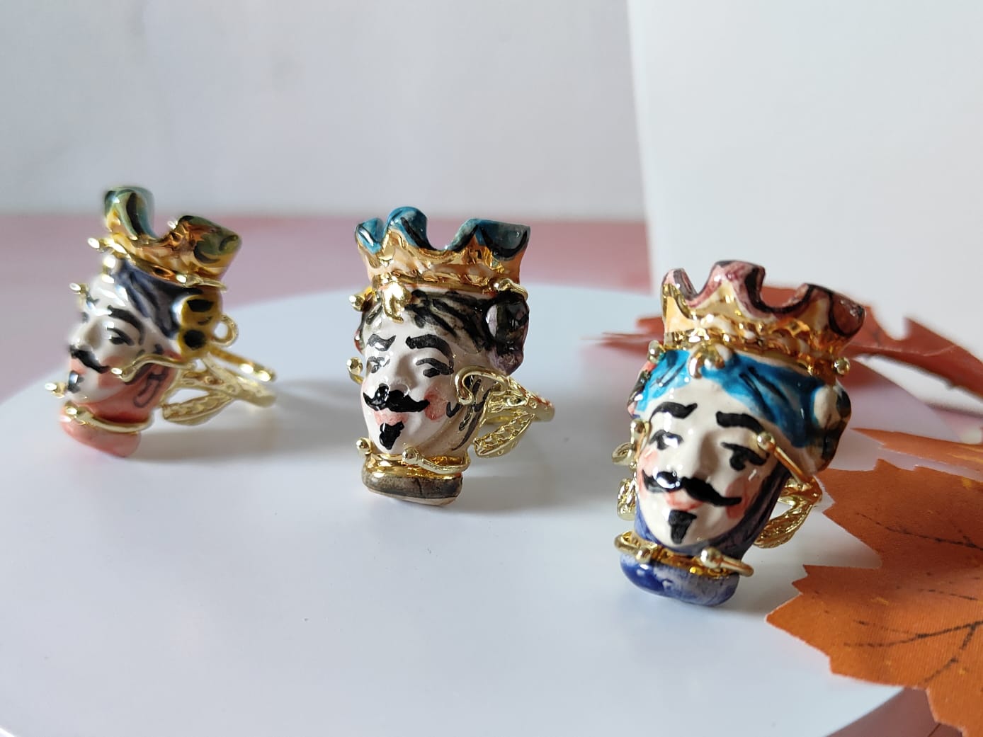 Ogni anello raffigura una testa di moro maschile, realizzata con cura e dipinta a mano. Le corone dorate, i tratti espressivi e i dettagli policromi raccontano la storia e le leggende legate alla Sicilia, trasformando il gioiello in un simbolo di cultura e tradizione. La brillantezza dell’ottone dorato si sposa perfettamente con i colori della ceramica, creando un contrasto armonioso e ricco di fascino.