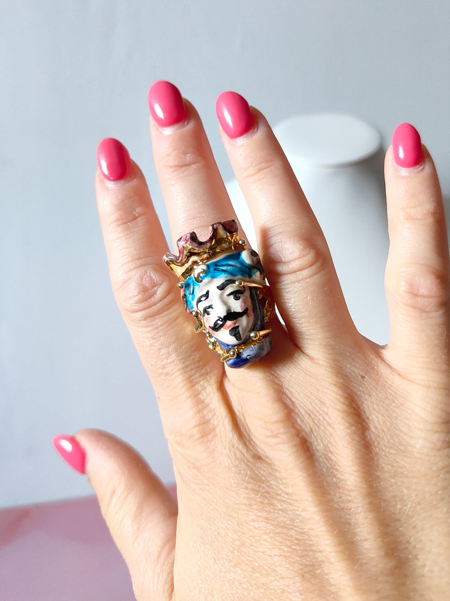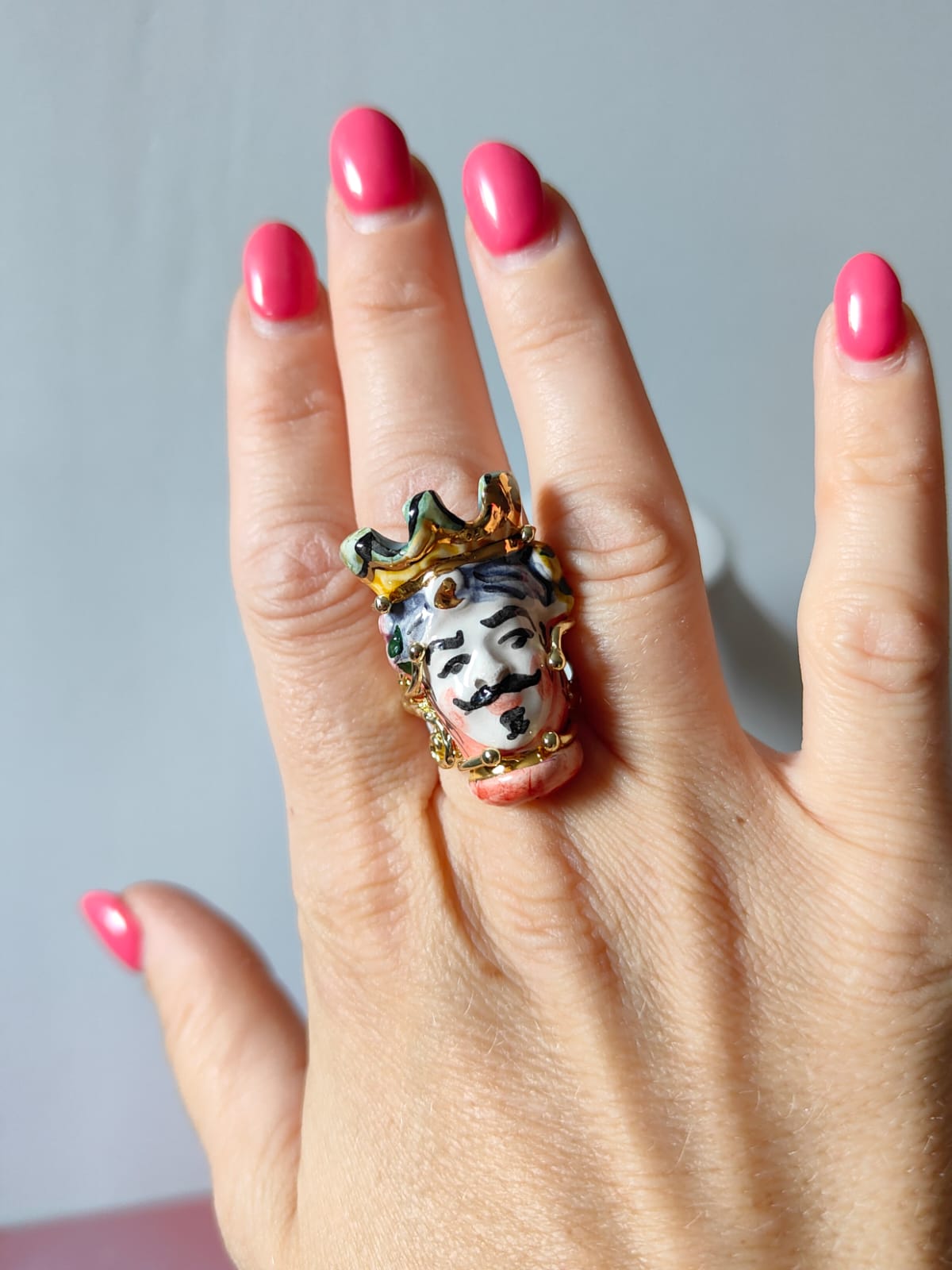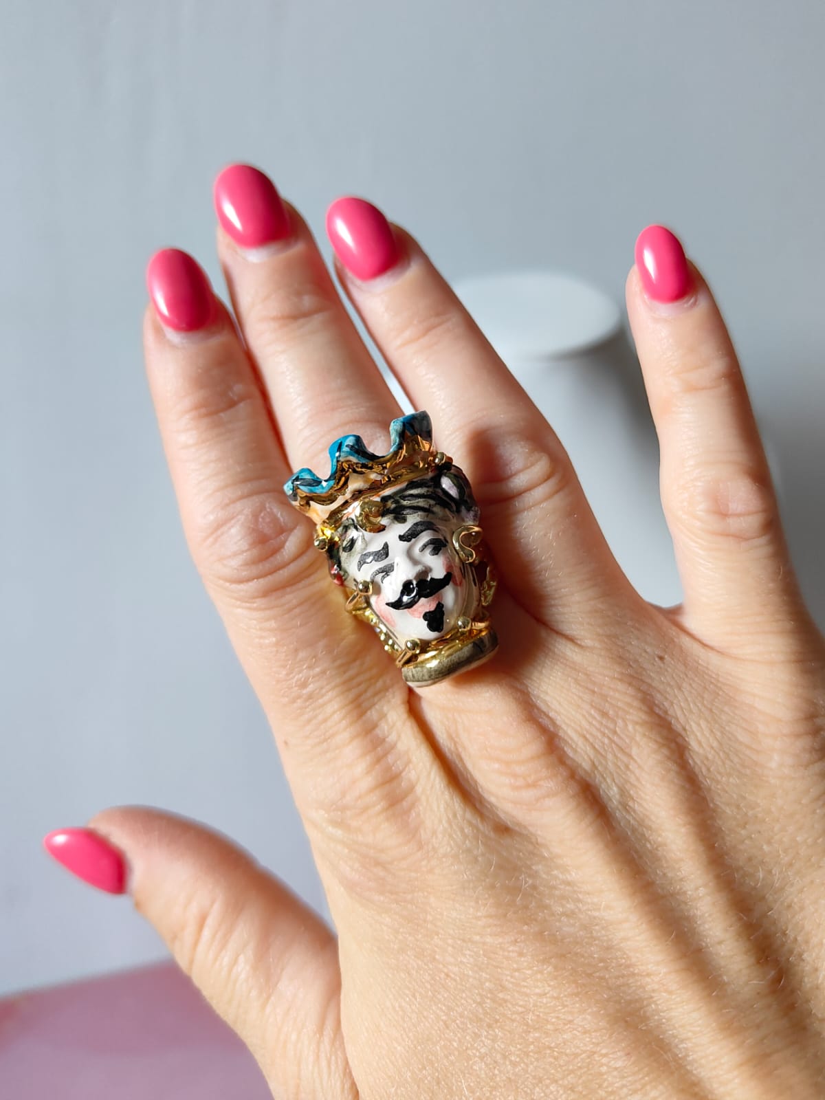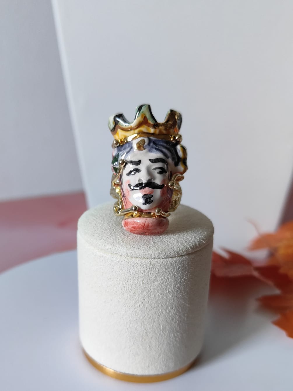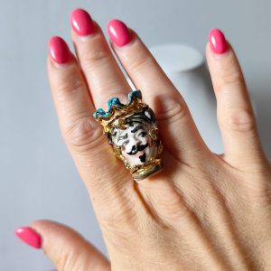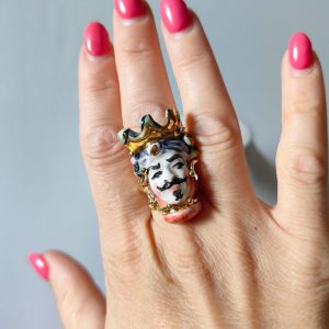 Ogni anello raffigura una testa di moro maschile, realizzata con cura e dipinta a mano. Le corone dorate, i tratti espressivi e i dettagli policromi raccontano la storia e le leggende legate alla Sicilia, trasformando il gioiello in un simbolo di cultura e tradizione. La brillantezza dell’ottone dorato si sposa perfettamente con i colori della ceramica, creando un contrasto armonioso e ricco di fascino.
