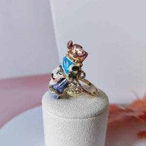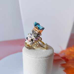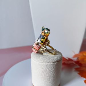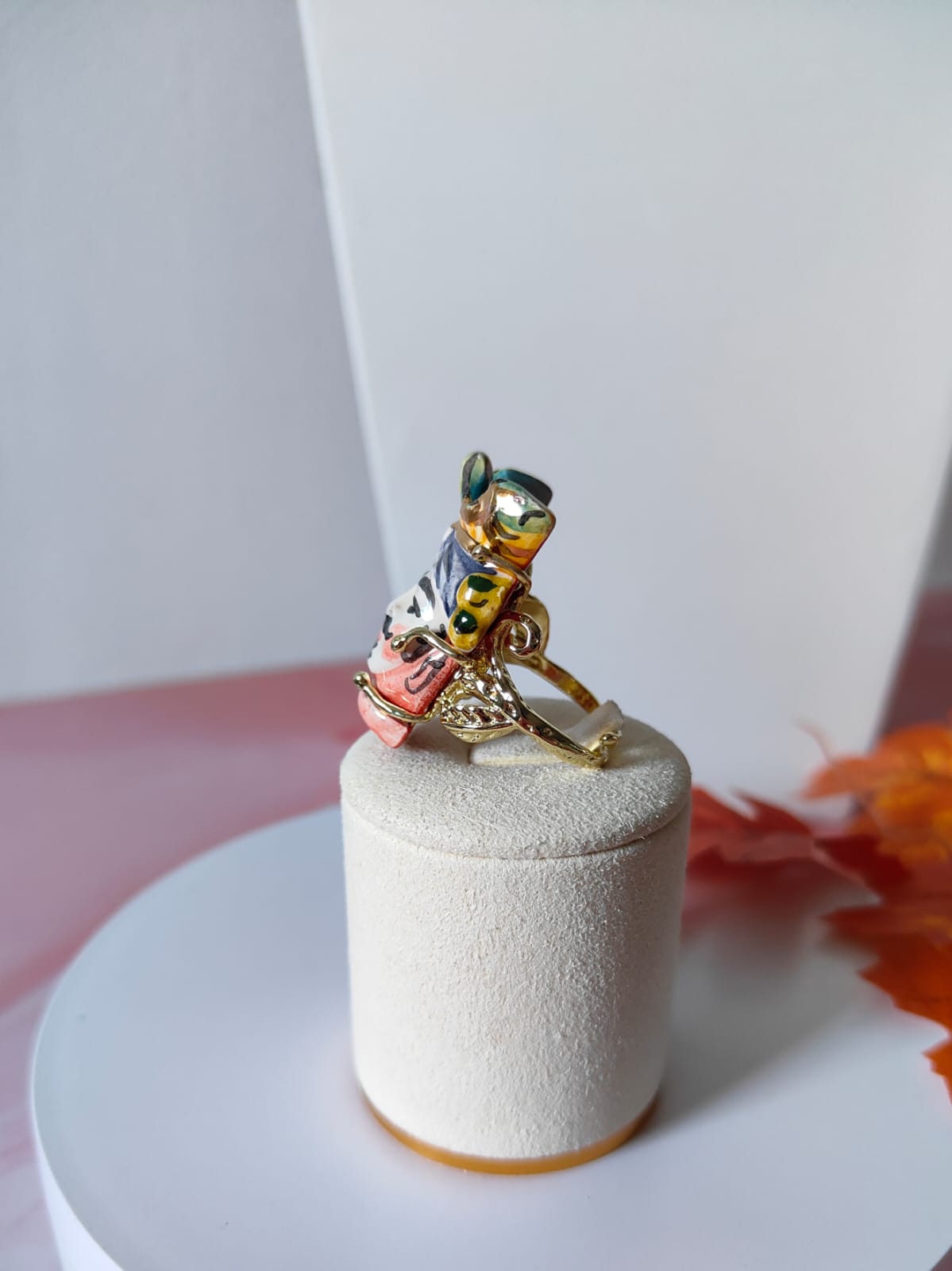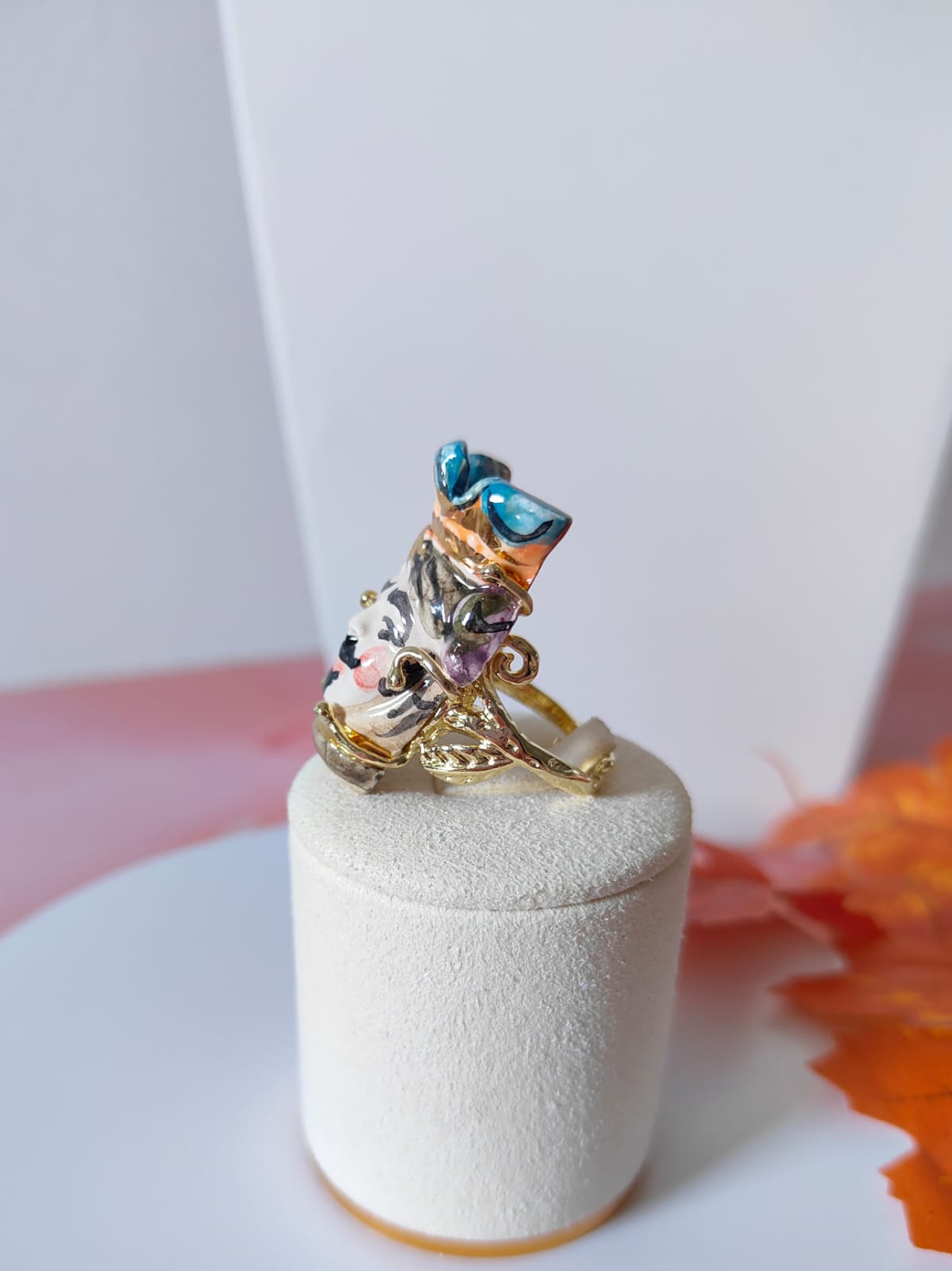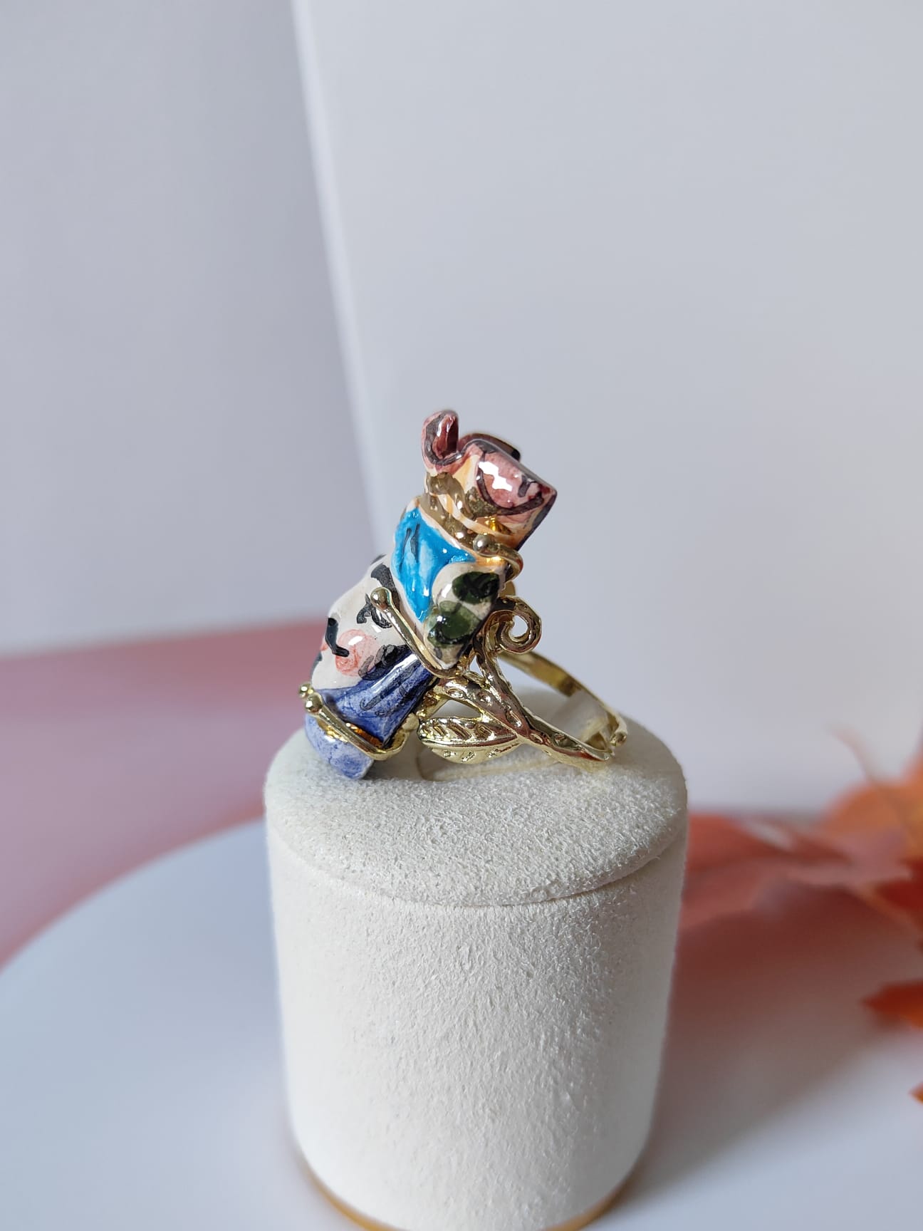 La montatura regolabile in ottone dorato avvolge con eleganza la scultura in ceramica, permettendo di adattare l’anello a diverse misure. Questo dettaglio lo rende confortevole e versatile, adatto a chi desidera indossare un gioiello unico che si distingua per carattere e personalità.
