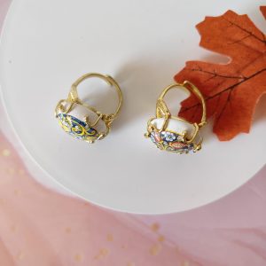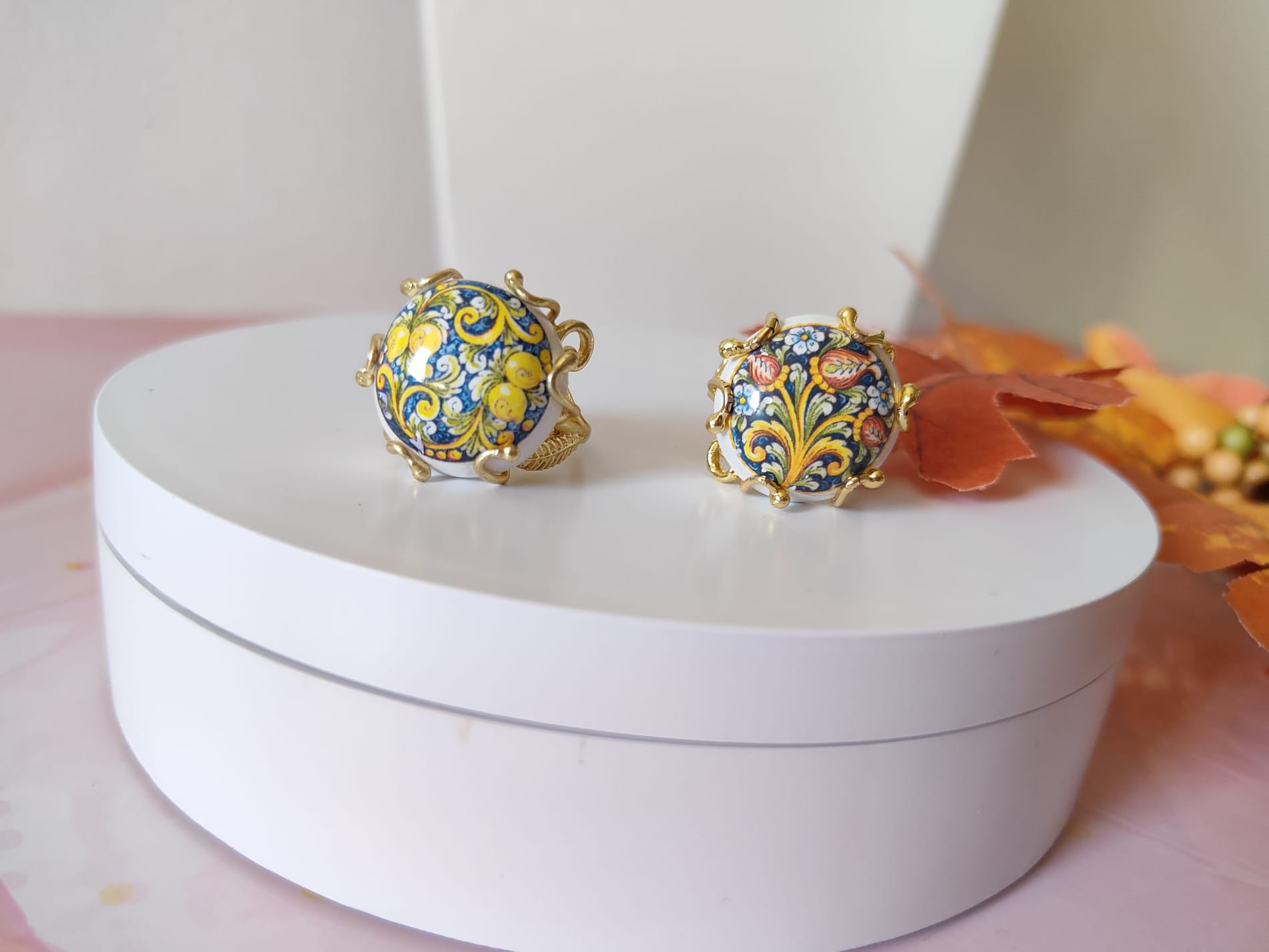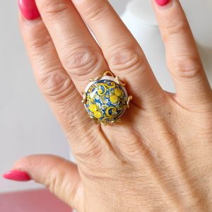L’anello ceramica siciliana è una creazione che racchiude il calore e l’autenticità della tradizione artigianale dell’isola. Ogni pezzo nasce dall’incontro tra la ceramica di Caltagirone, famosa in tutto il mondo per le sue decorazioni ricche di colori e dettagli, e l’ottone dorato che ne sostiene la forma con eleganza.