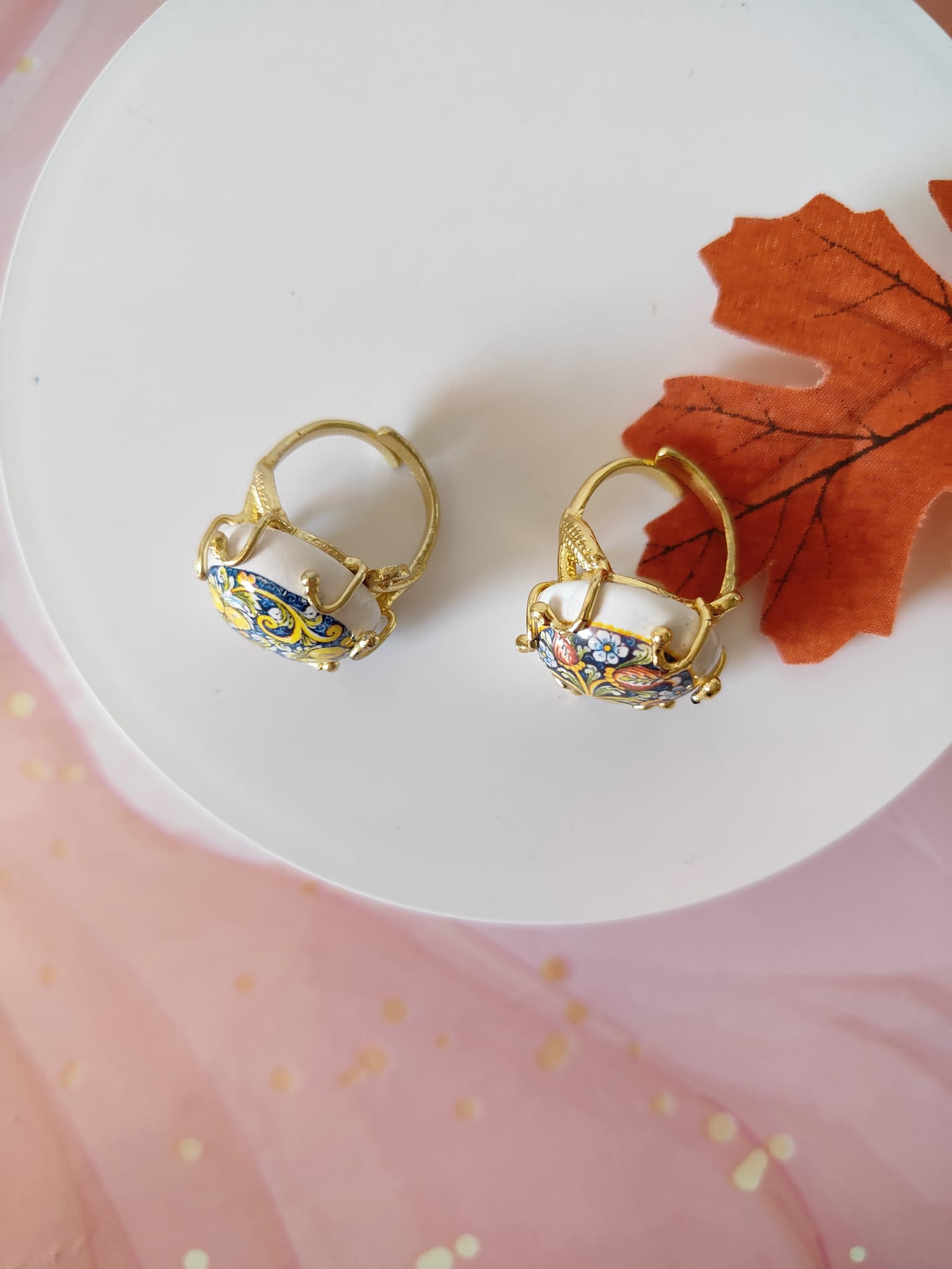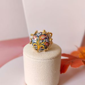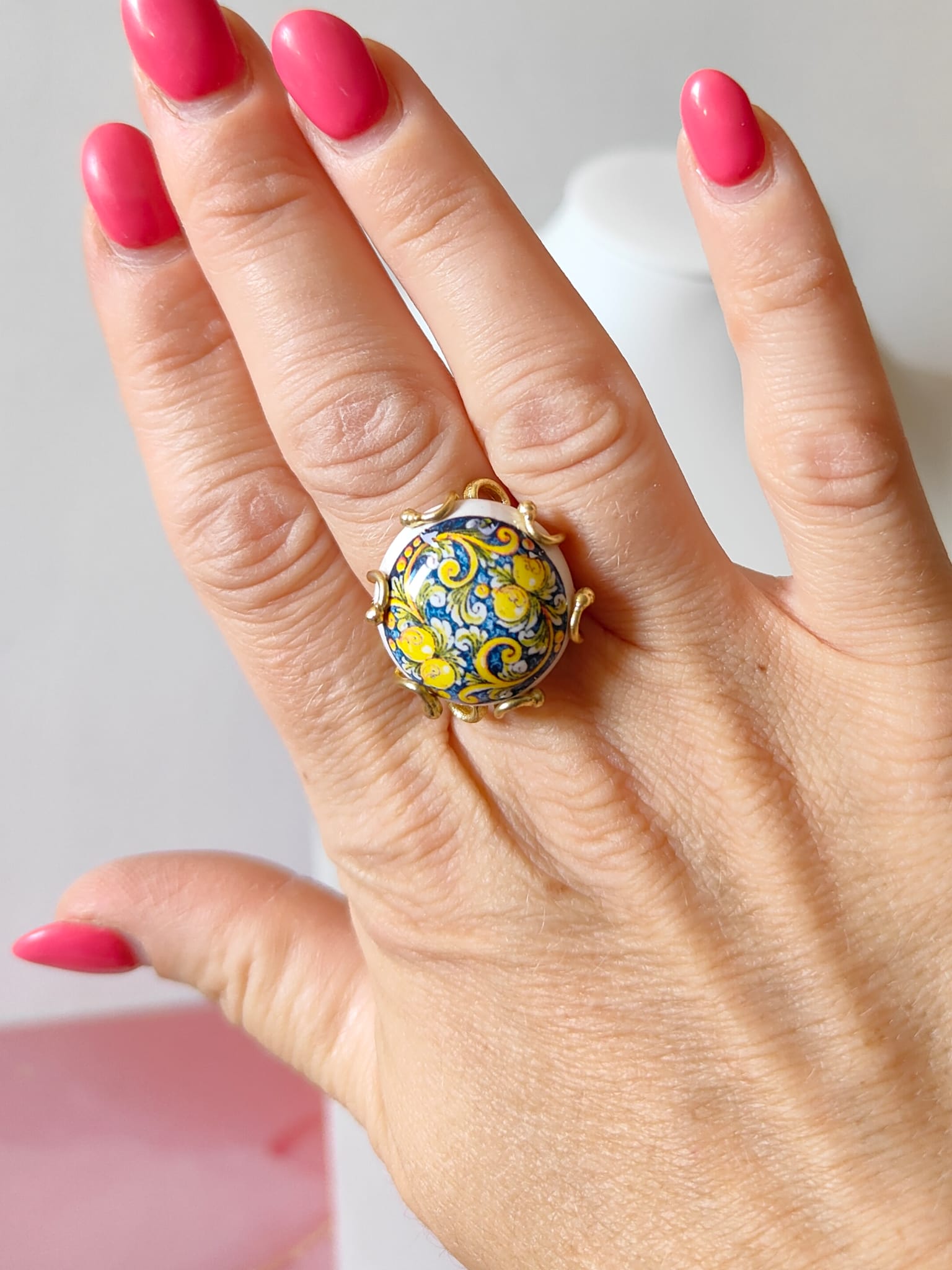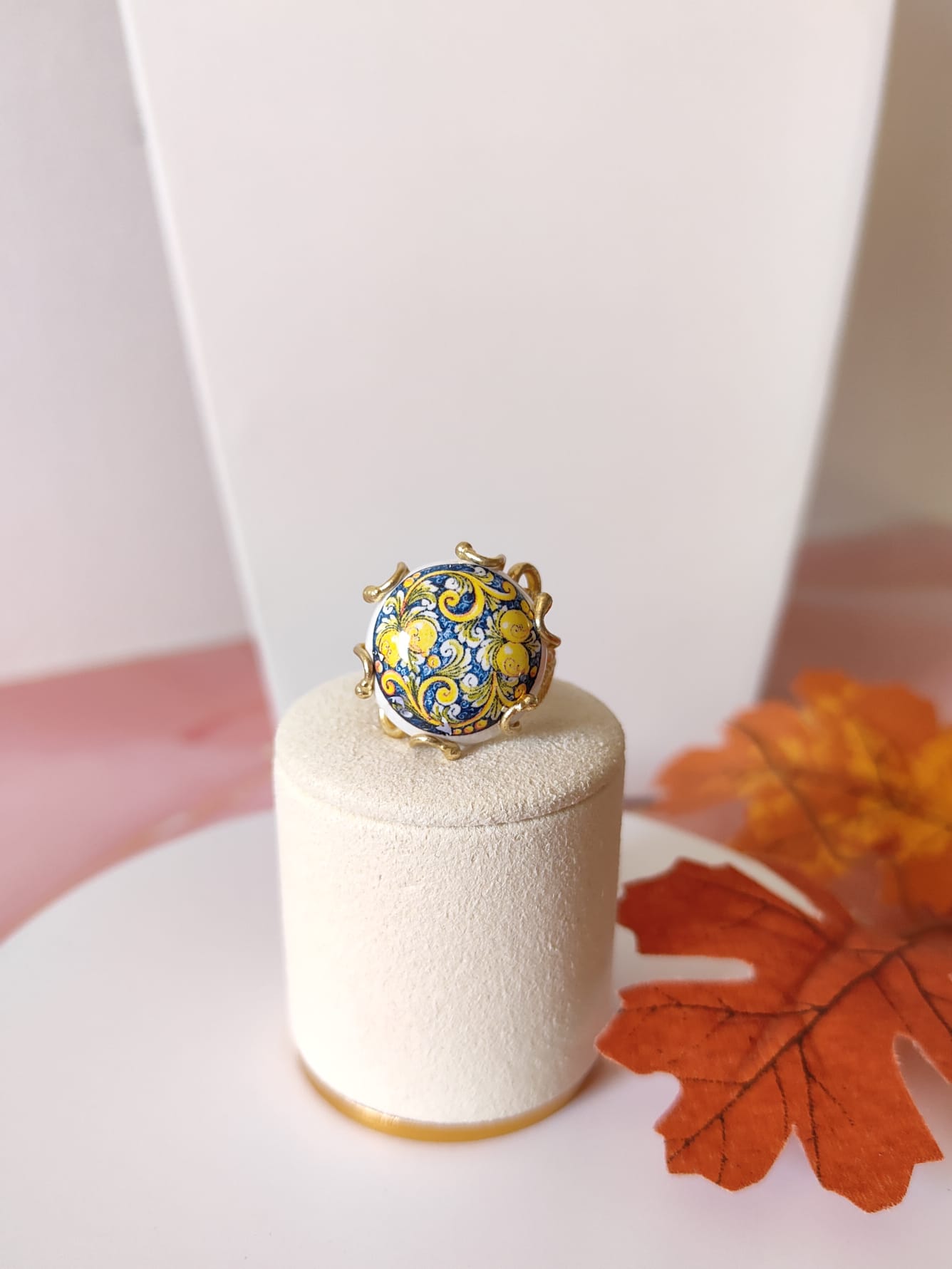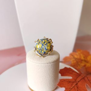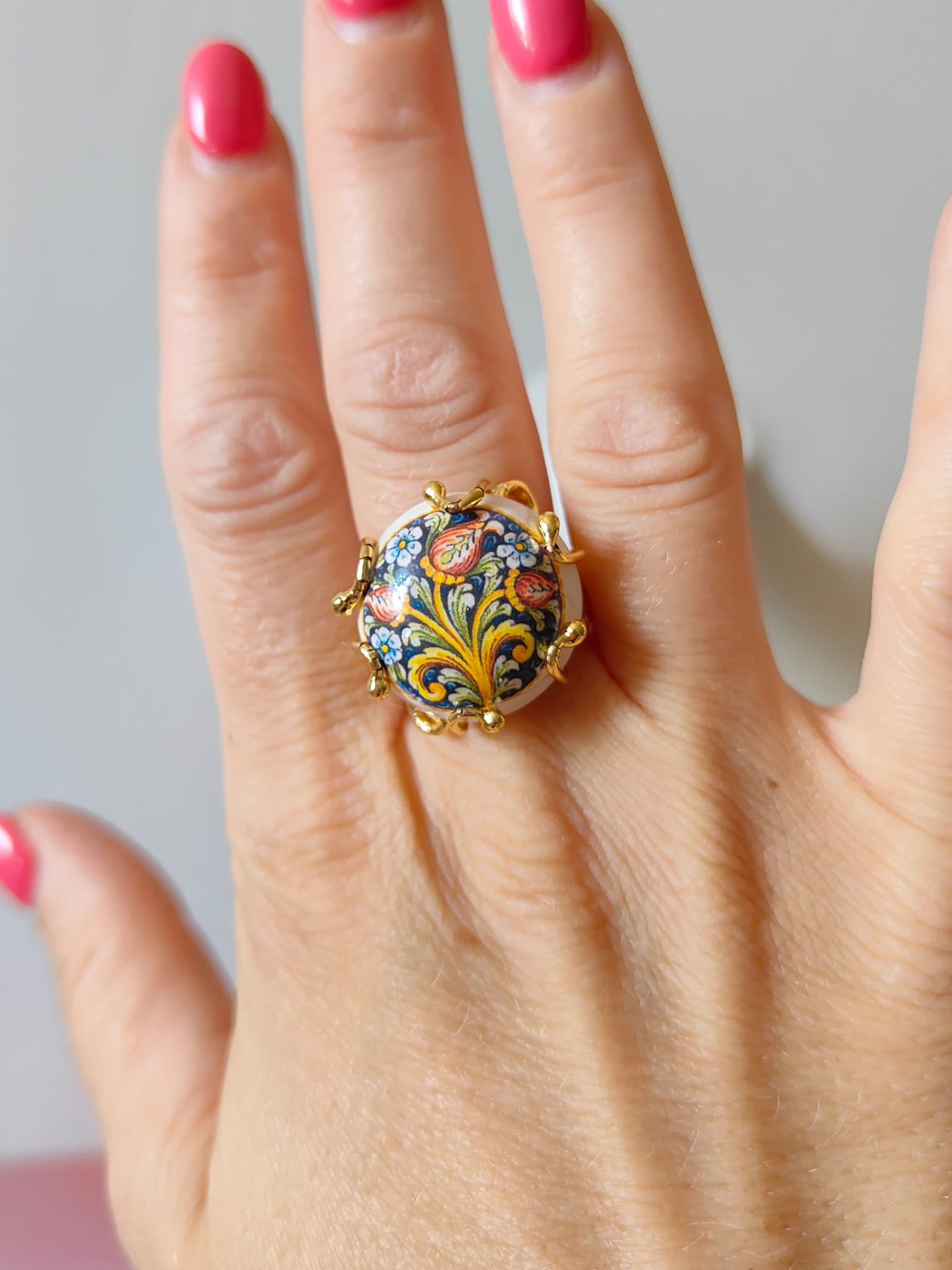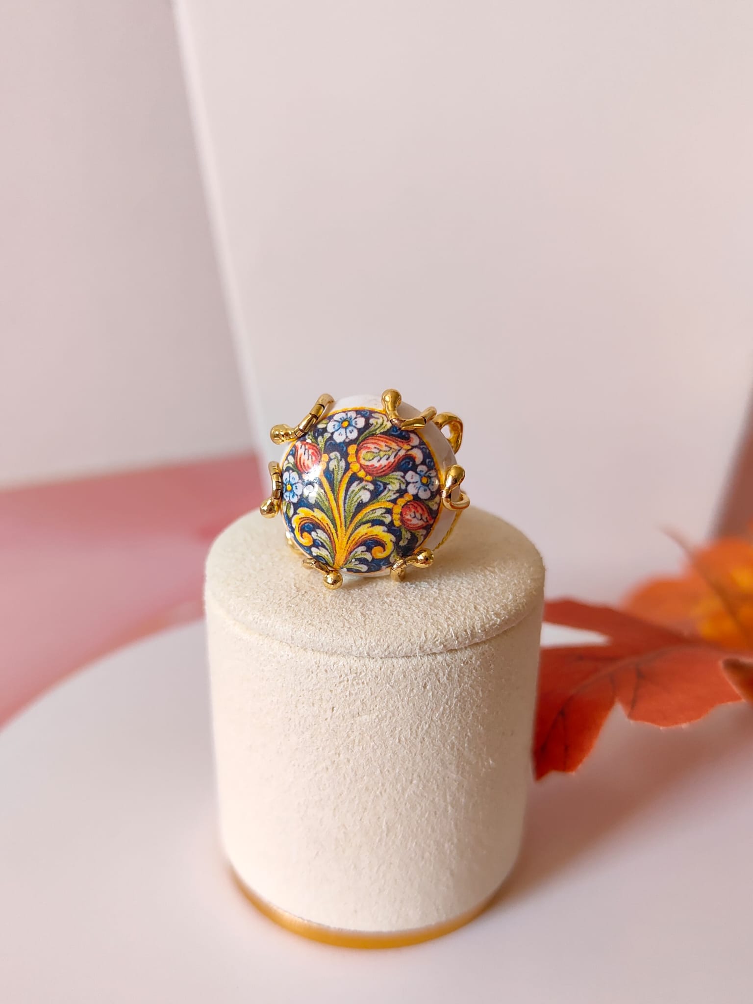 La superficie dell’anello è impreziosita da una ceramica incastonata, decorata a mano con motivi floreali e arabeschi che evocano il fascino del Mediterraneo. Le tonalità intense del blu, del giallo e del rosso si fondono in disegni armoniosi, capaci di raccontare una storia di bellezza senza tempo.