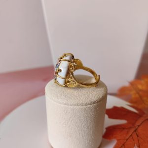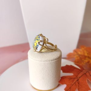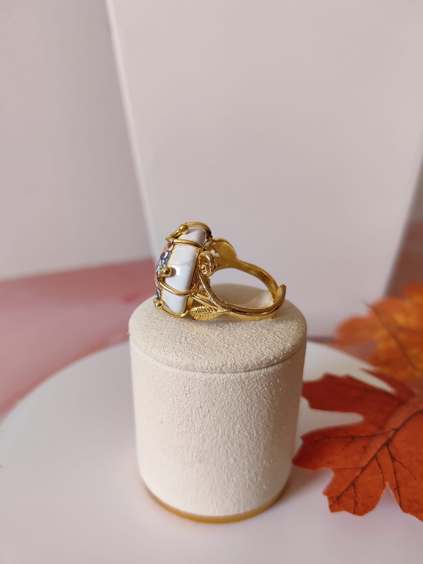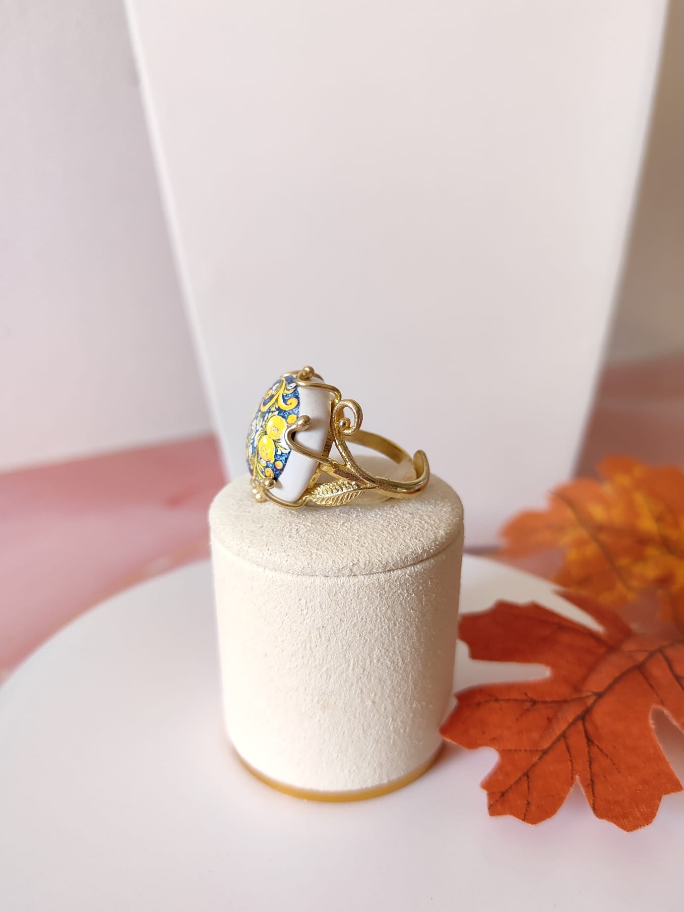 La montatura in ottone, lavorata con cura artigianale, presenta dettagli raffinati e una finitura dorata che esalta i colori della ceramica. La struttura è regolabile, permettendo a chi lo indossa di adattarlo facilmente a diverse misure di dito, senza rinunciare al comfort.