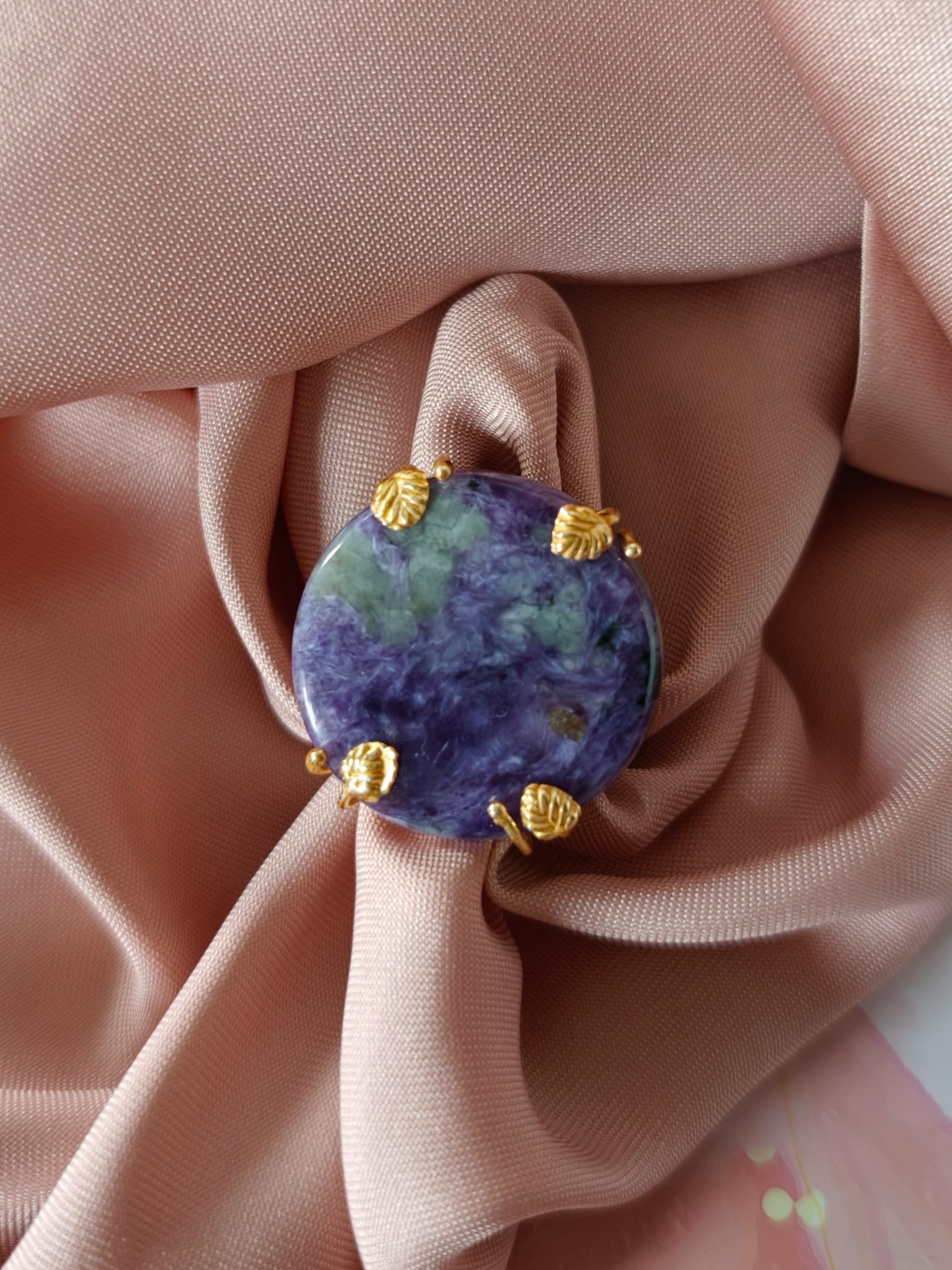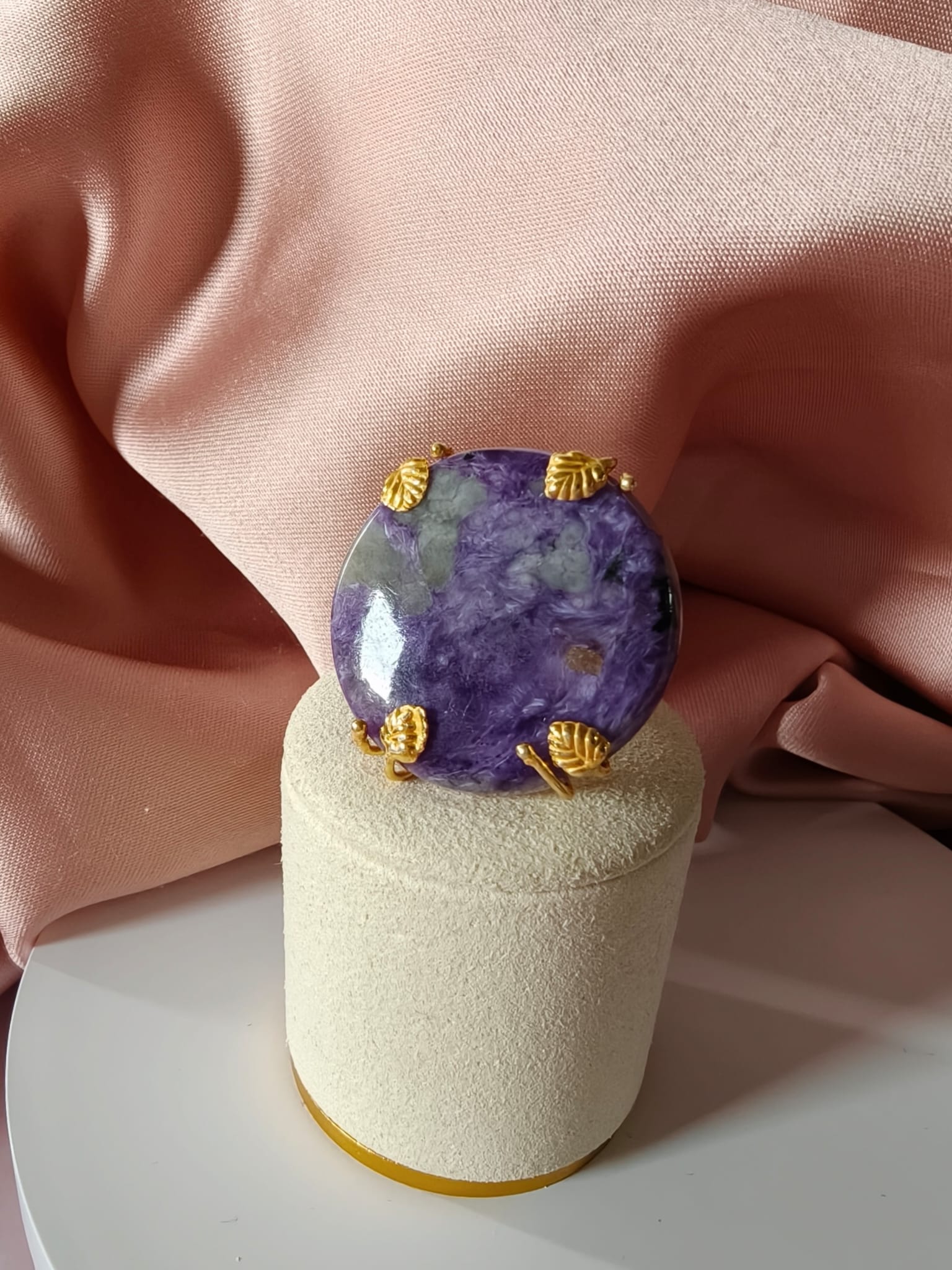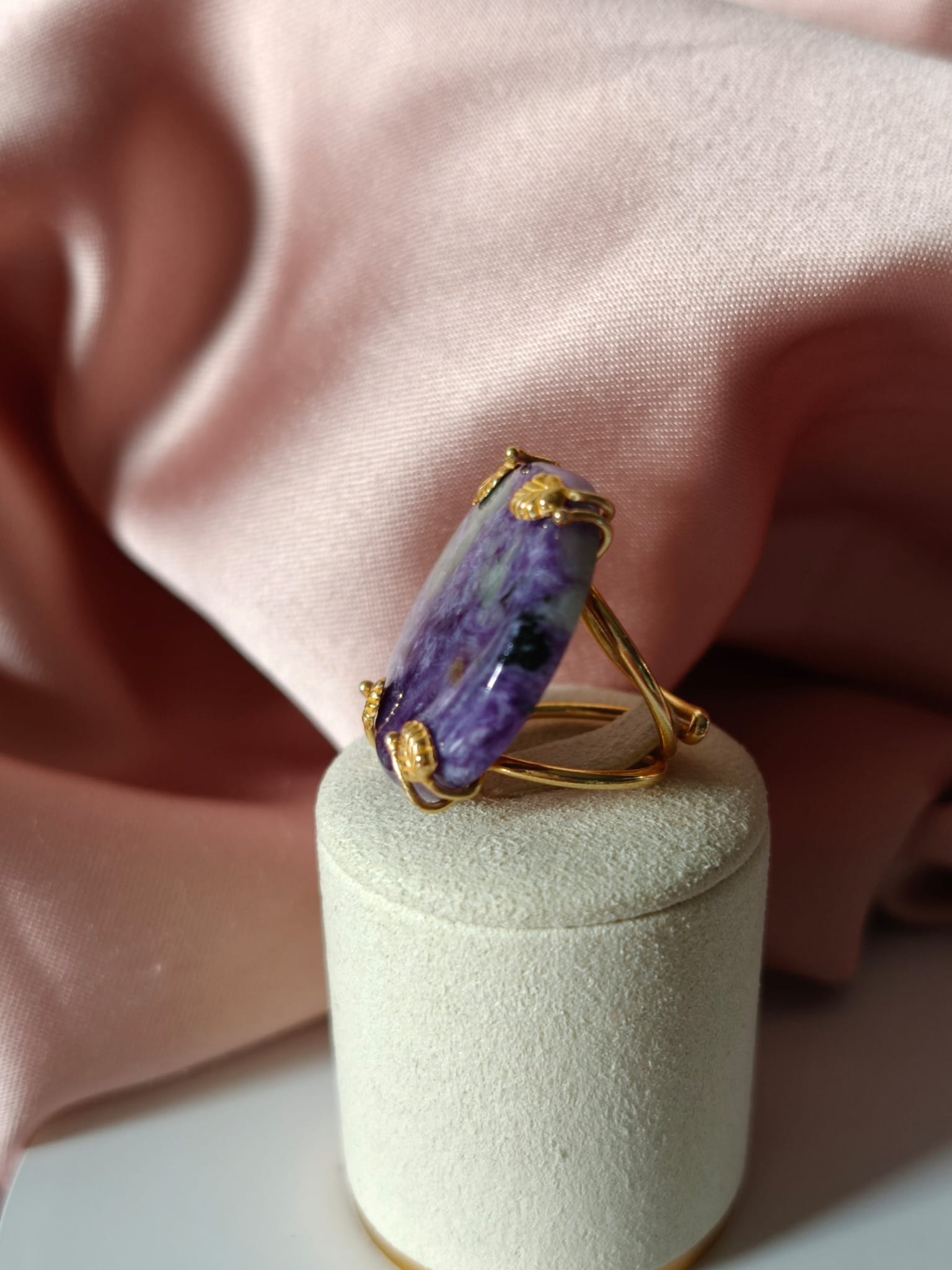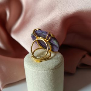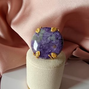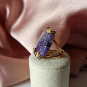 Oltre alla sua innegabile bellezza estetica, la charoite è conosciuta anche per le sue proprietà energetiche. Tradizionalmente viene considerata una pietra legata alla trasformazione interiore e alla serenità. Infatti si ritiene che favorisca la calma mentale, aiuti a superare momenti di stress e incoraggi l’equilibrio emotivo. Inoltre è spesso associata alla creatività e alla crescita spirituale, rendendo questo anello non solo un accessorio elegante, ma anche un piccolo talismano personale.