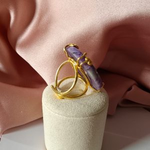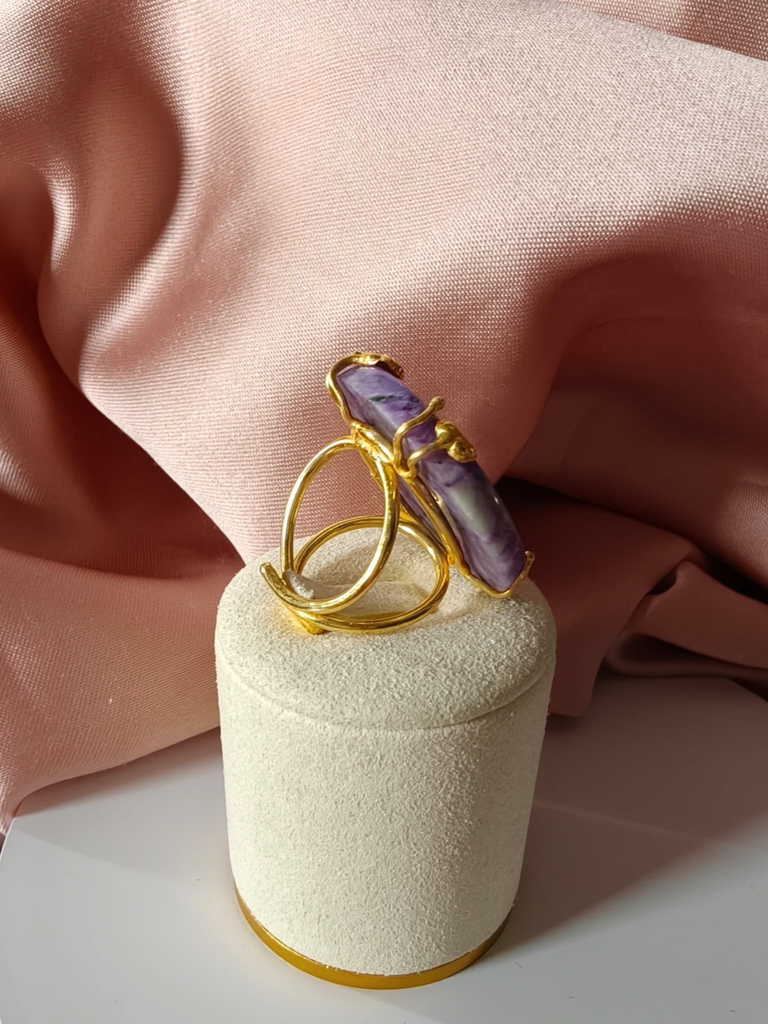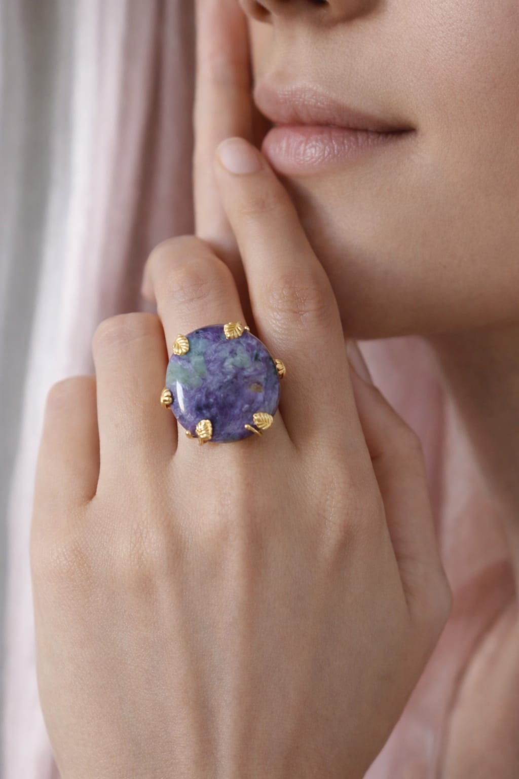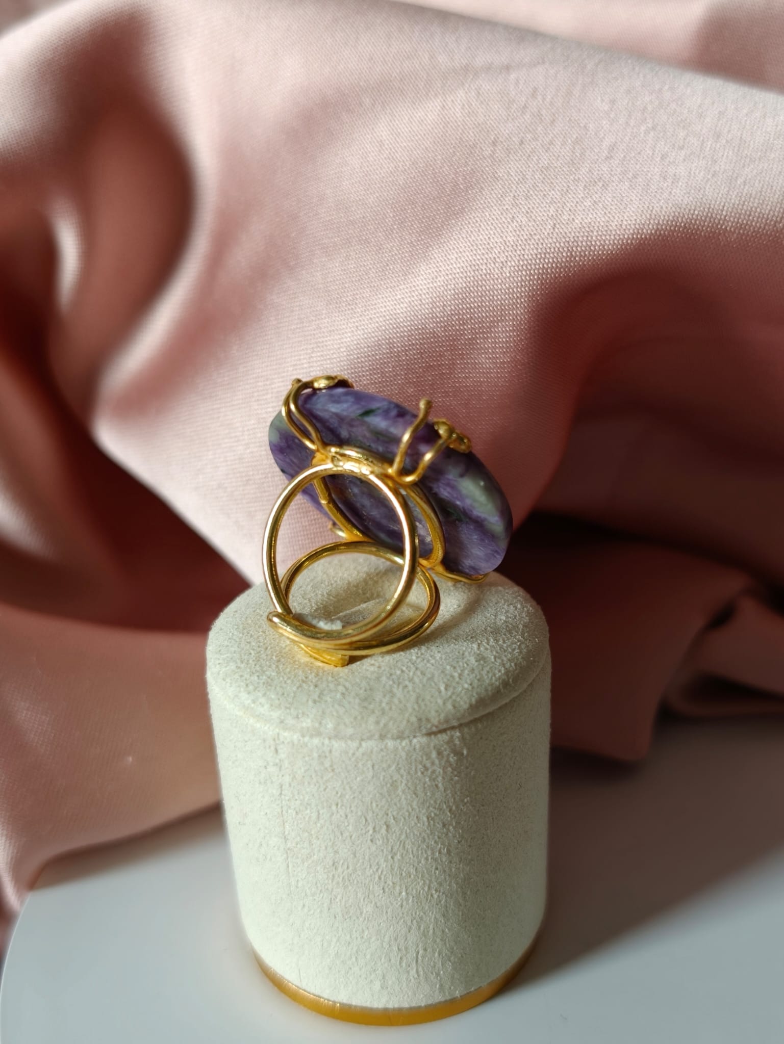Oltre alla sua innegabile bellezza estetica, la charoite è conosciuta anche per le sue proprietà energetiche. Tradizionalmente viene considerata una pietra legata alla trasformazione interiore e alla serenità. Infatti si ritiene che favorisca la calma mentale, aiuti a superare momenti di stress e incoraggi l’equilibrio emotivo. Inoltre è spesso associata alla creatività e alla crescita spirituale, rendendo questo anello non solo un accessorio elegante, ma anche un piccolo talismano personale.
