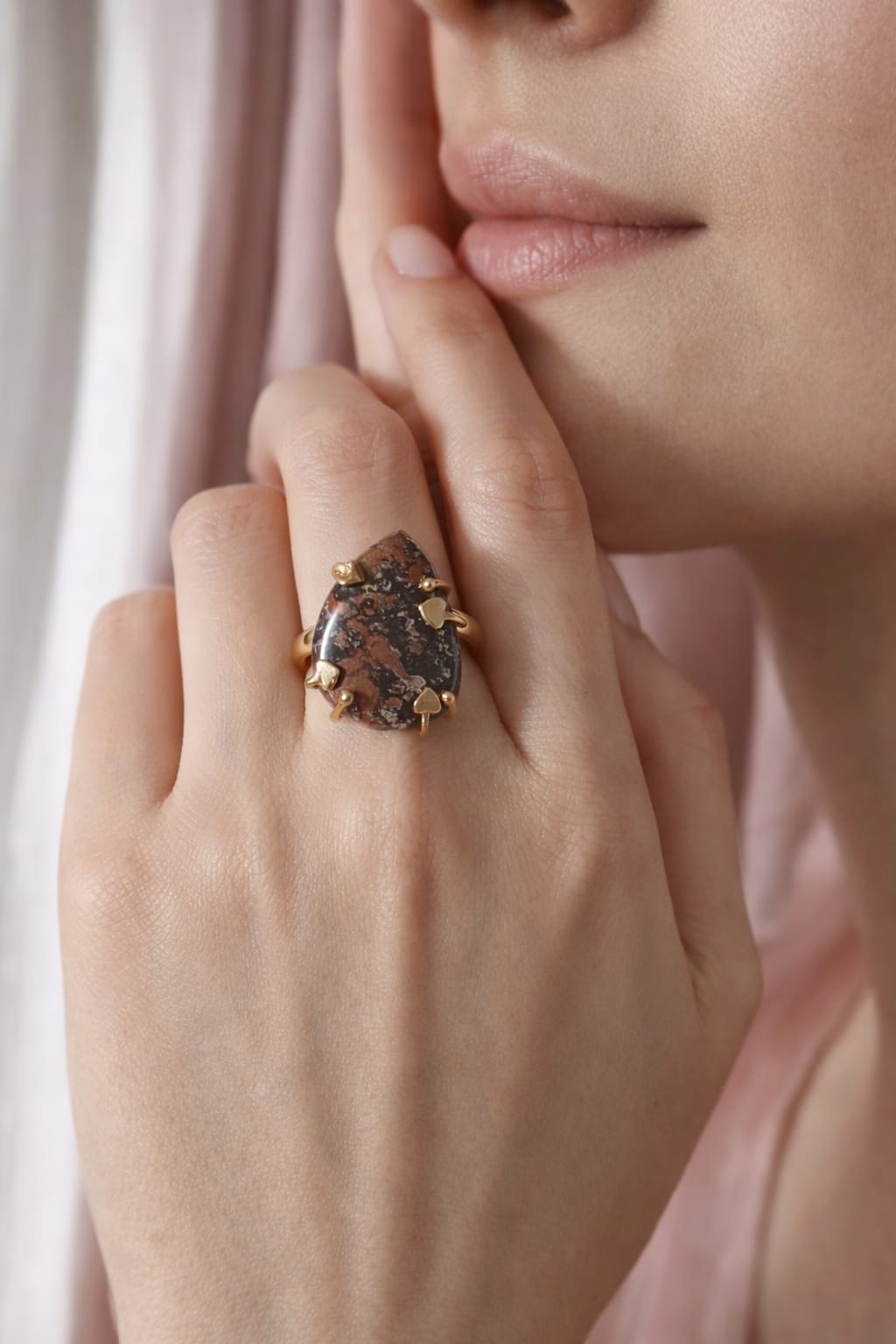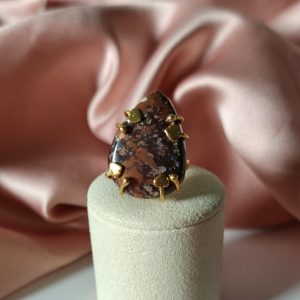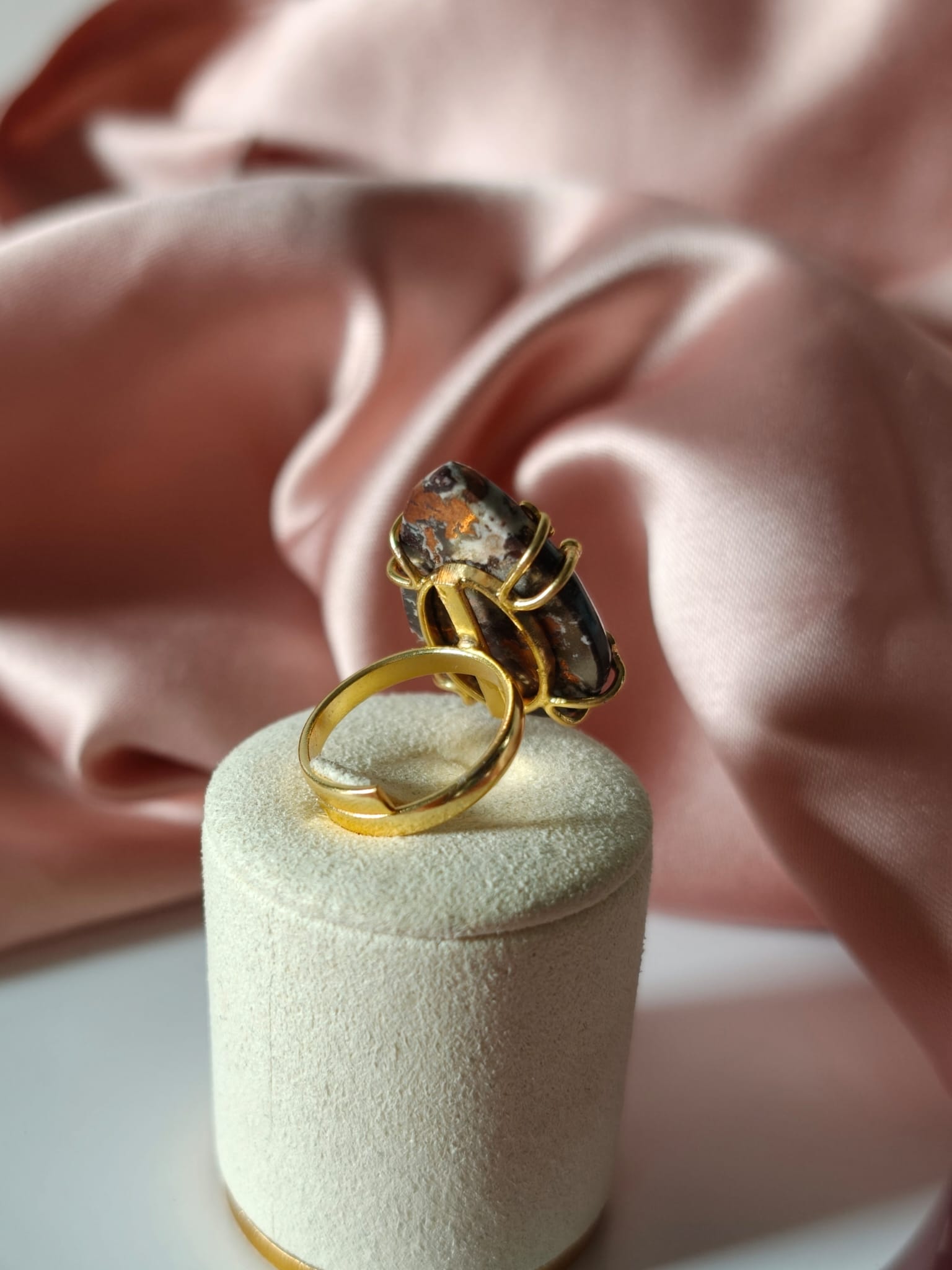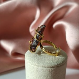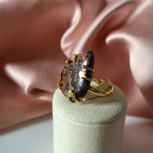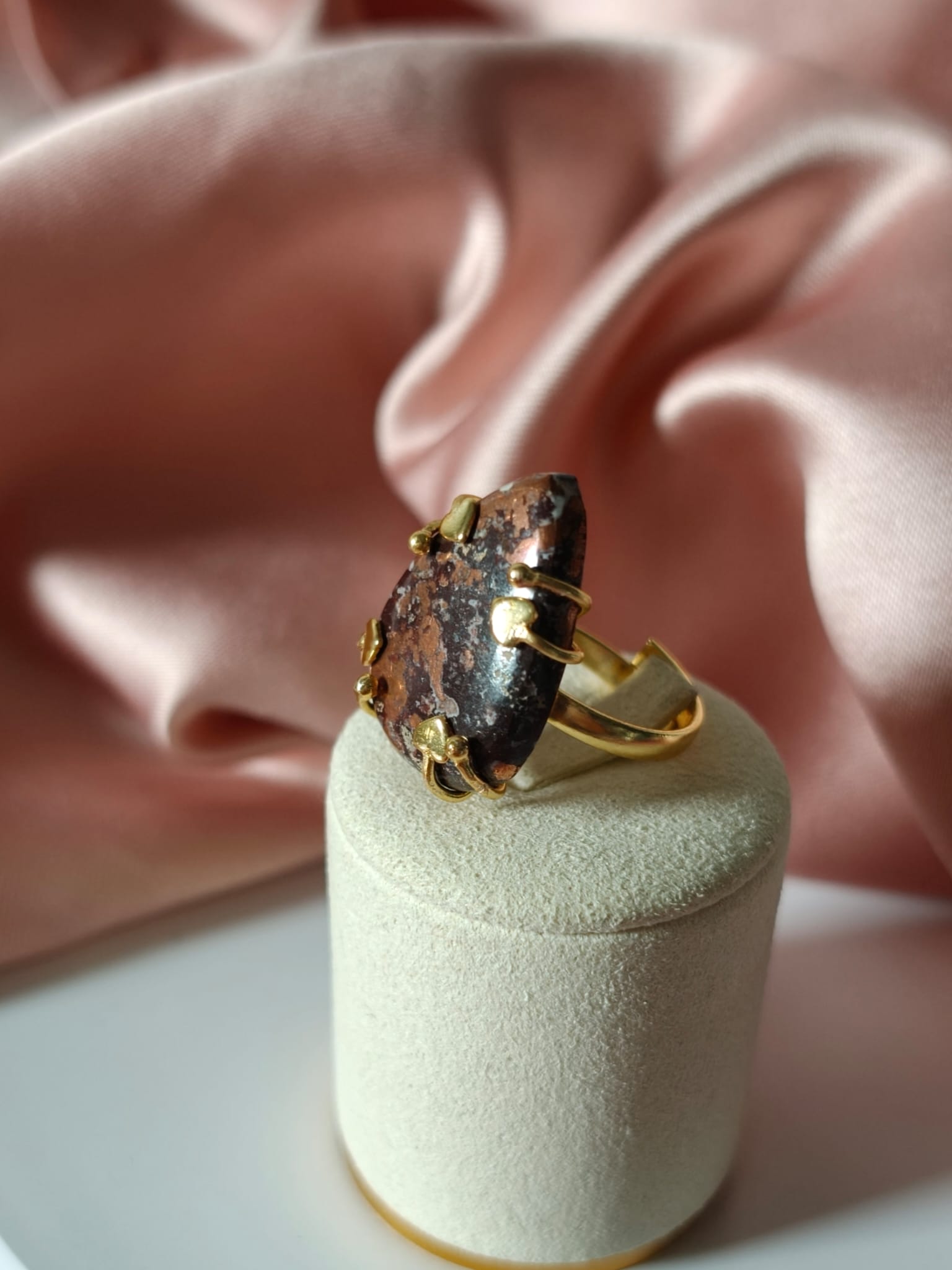 La montatura in ottone dorato, realizzata interamente a mano, è studiata per valorizzare la pietra senza sovrastarla. I punti di incastonatura, armoniosi e ben bilanciati, garantiscono stabilità e allo stesso tempo lasciano emergere tutta la bellezza materica della superficie. Inoltre, la struttura regolabile rende l’anello comodo da indossare e facilmente adattabile a diverse misure.
