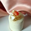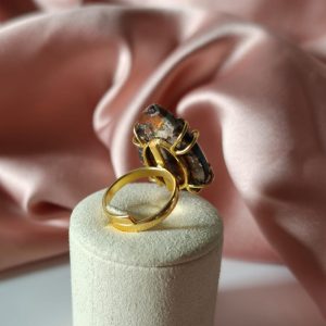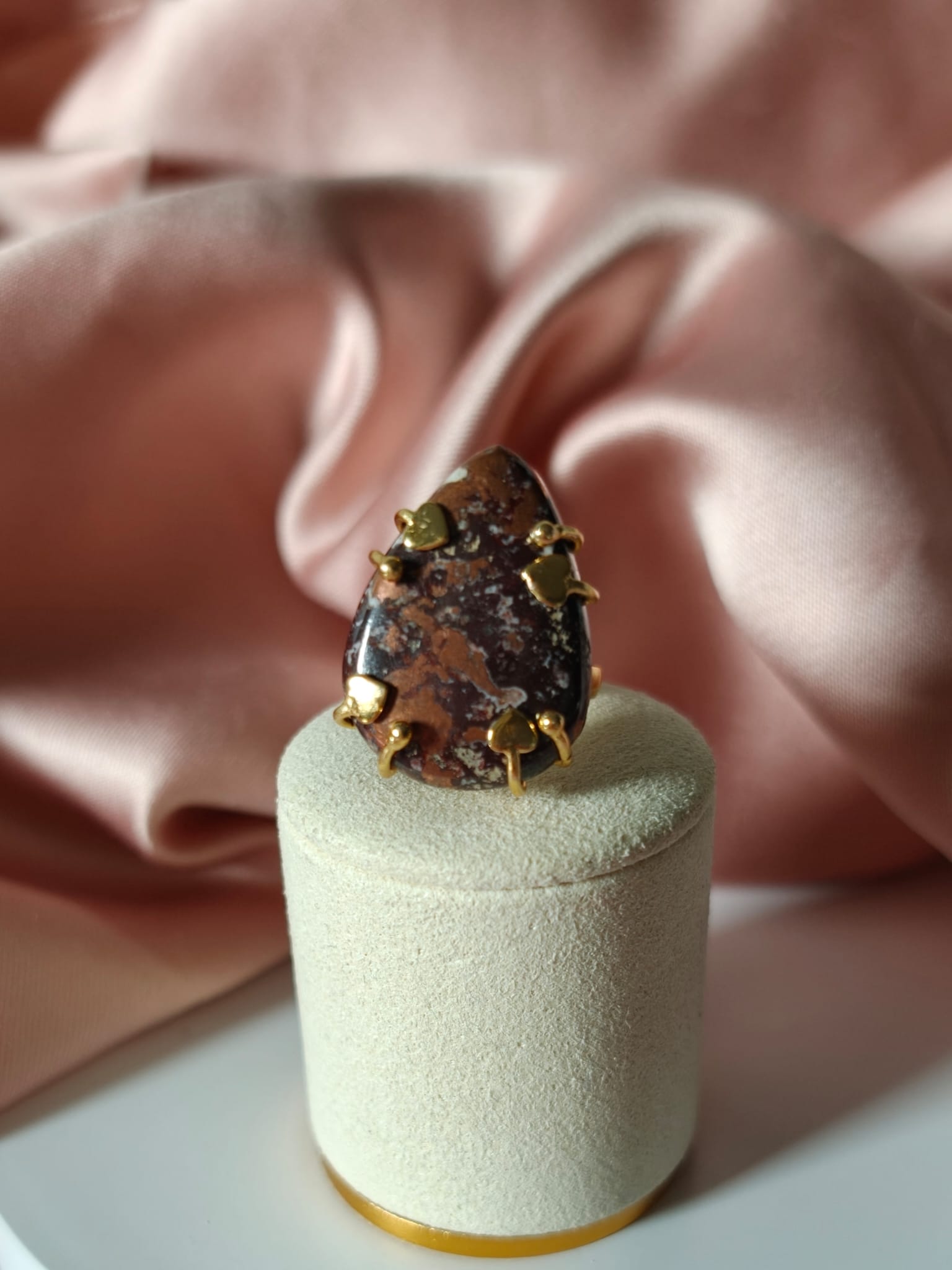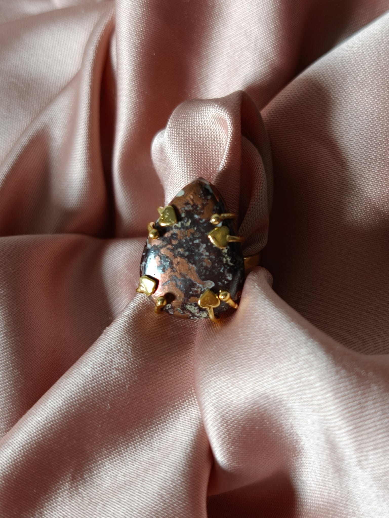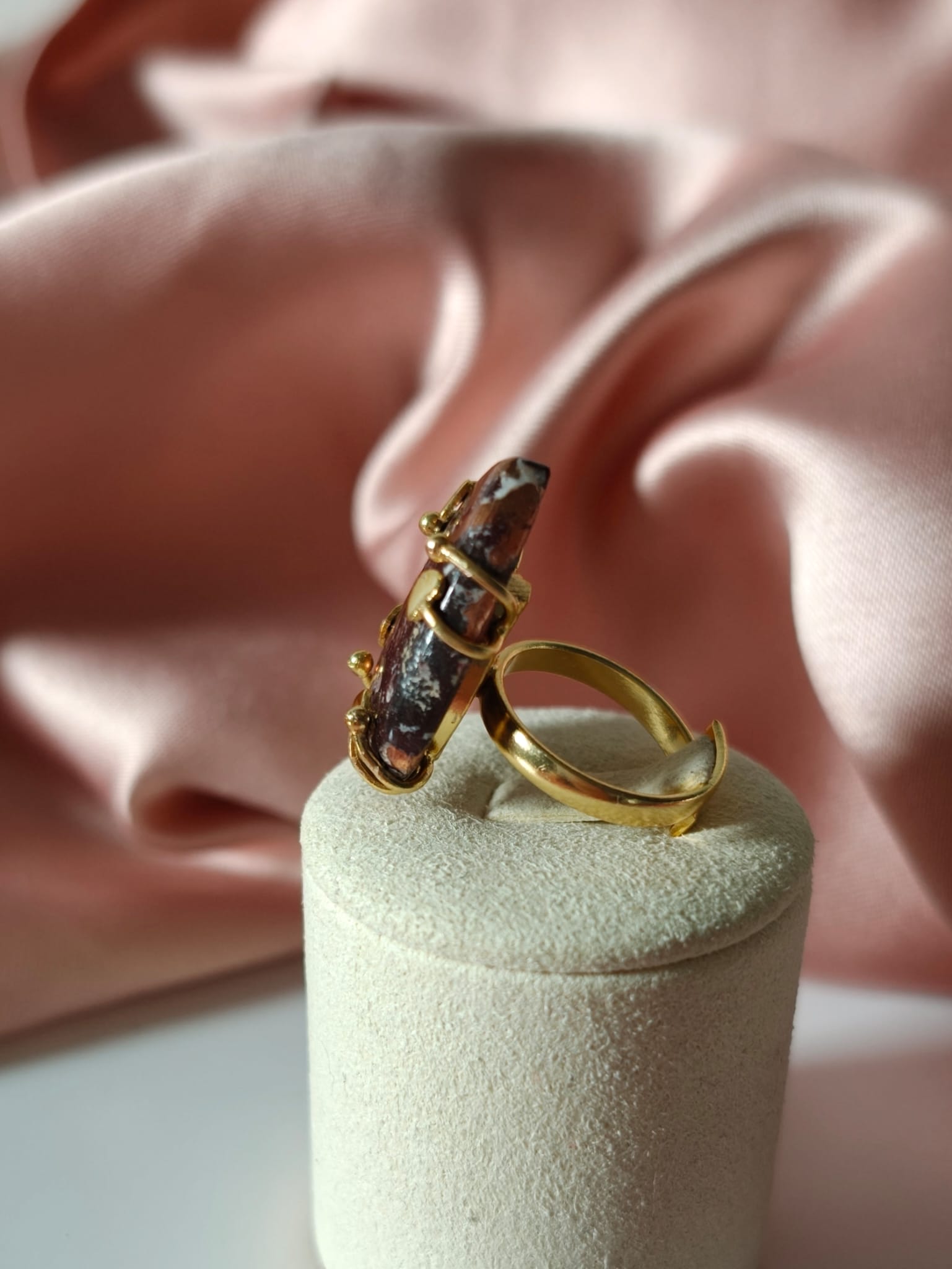 La montatura in ottone dorato, realizzata interamente a mano, è studiata per valorizzare la pietra senza sovrastarla. I punti di incastonatura, armoniosi e ben bilanciati, garantiscono stabilità e allo stesso tempo lasciano emergere tutta la bellezza materica della superficie. Inoltre, la struttura regolabile rende l’anello comodo da indossare e facilmente adattabile a diverse misure.
