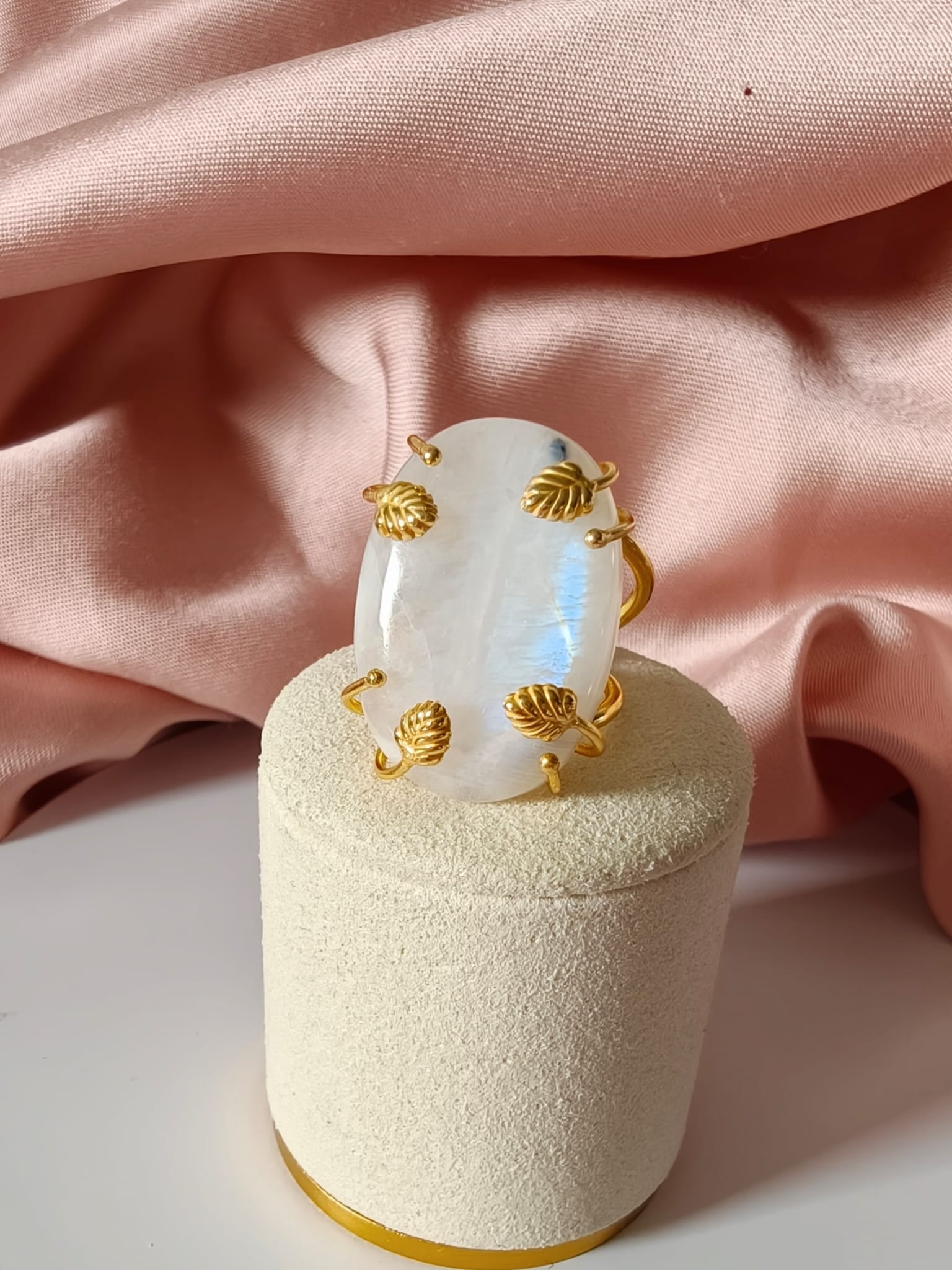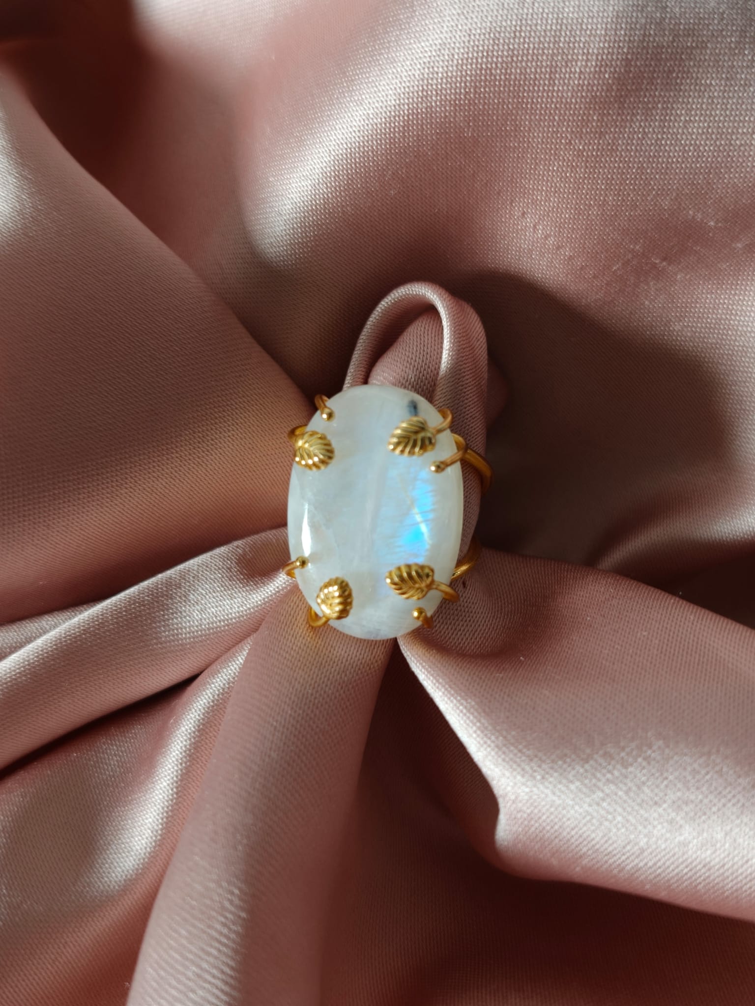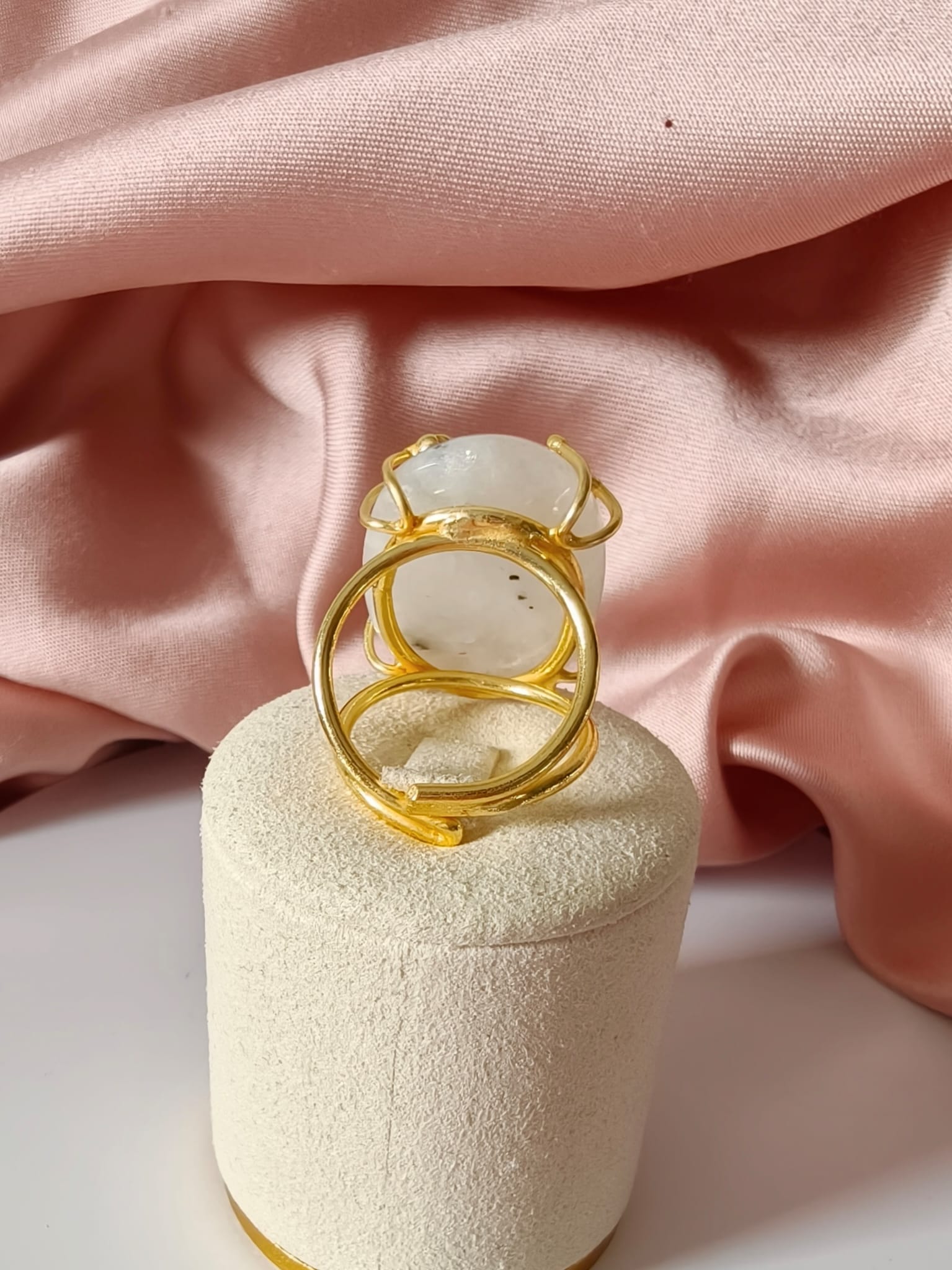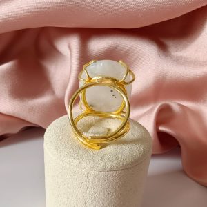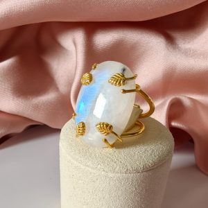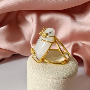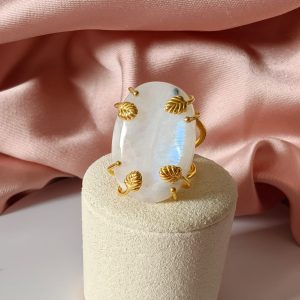 Anello regolabile in ottone dorato con cabochon in labradorite bianca naturale. Un anello con labradorite bianca luminoso e raffinato, caratterizzato da delicati riflessi iridescenti.