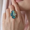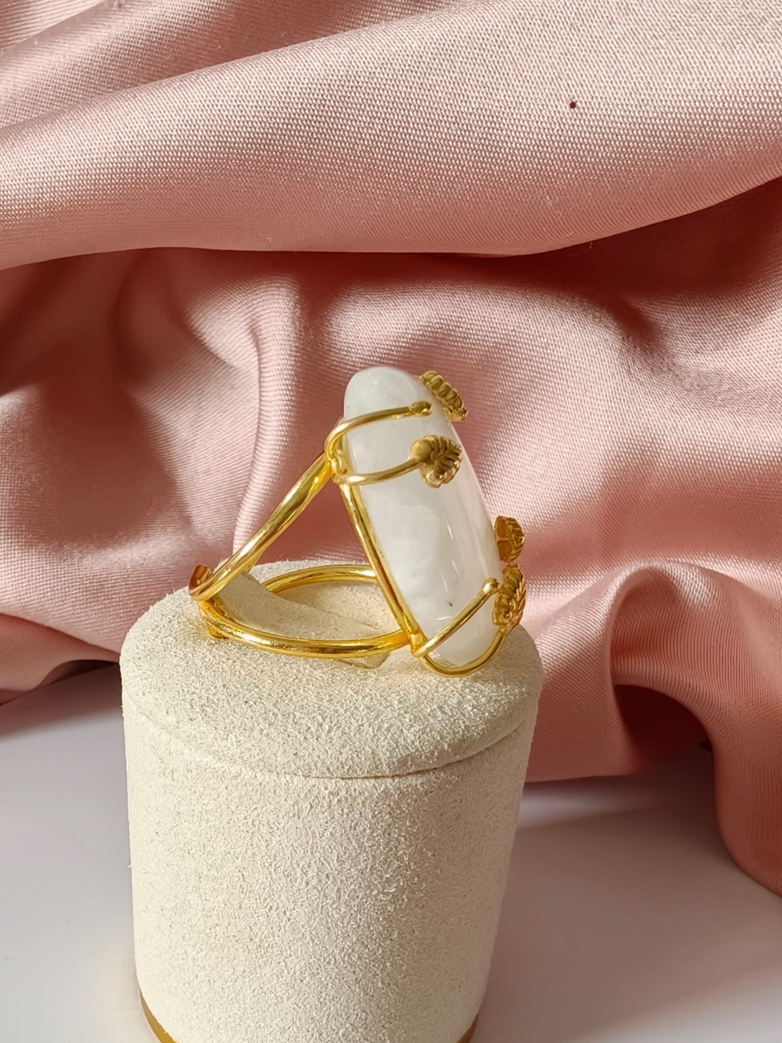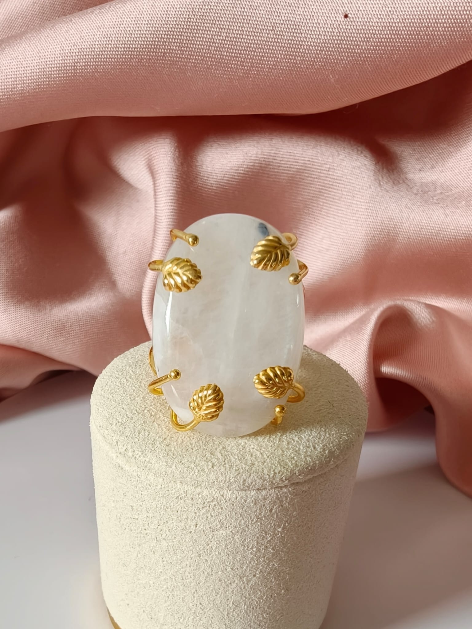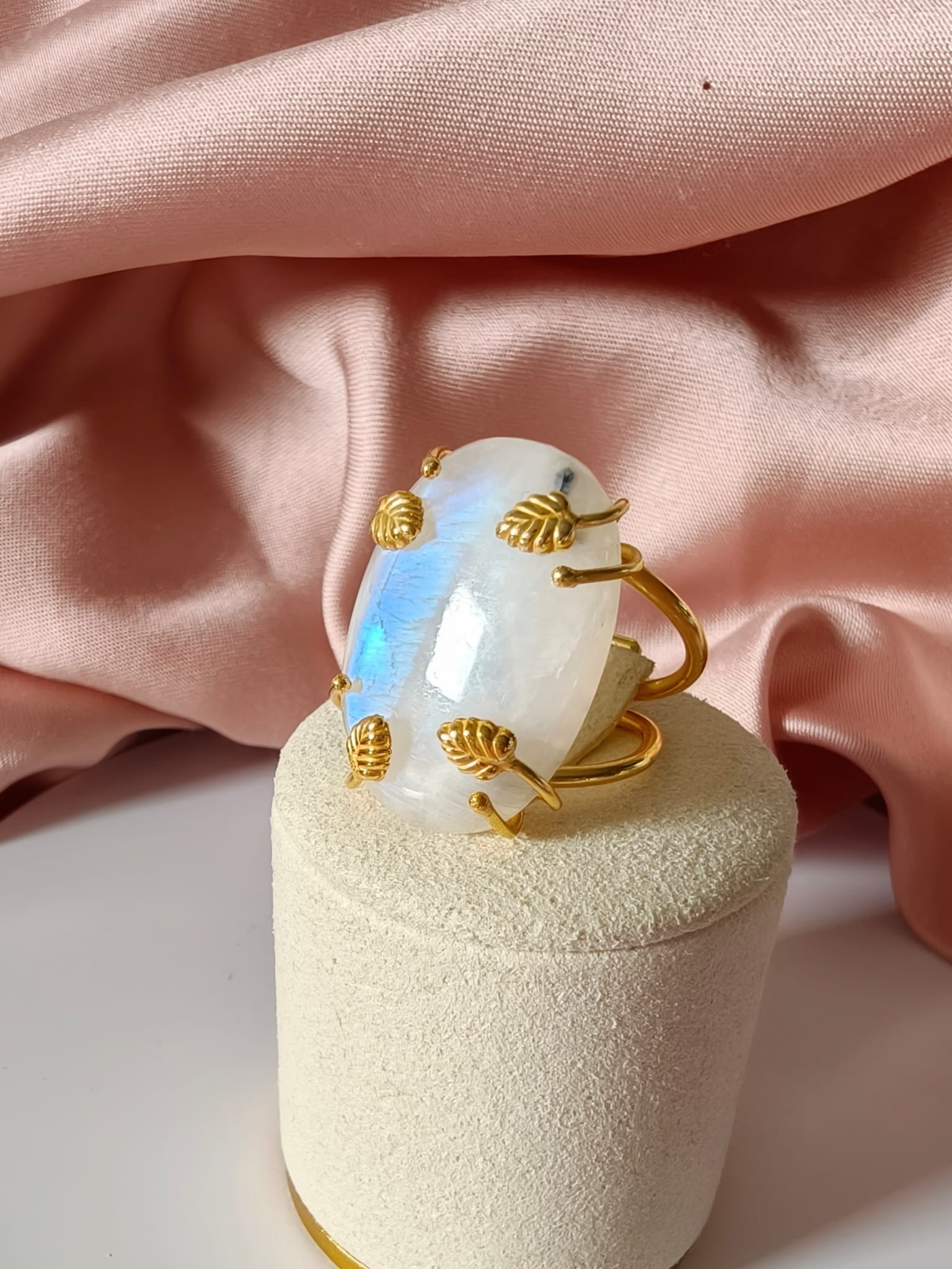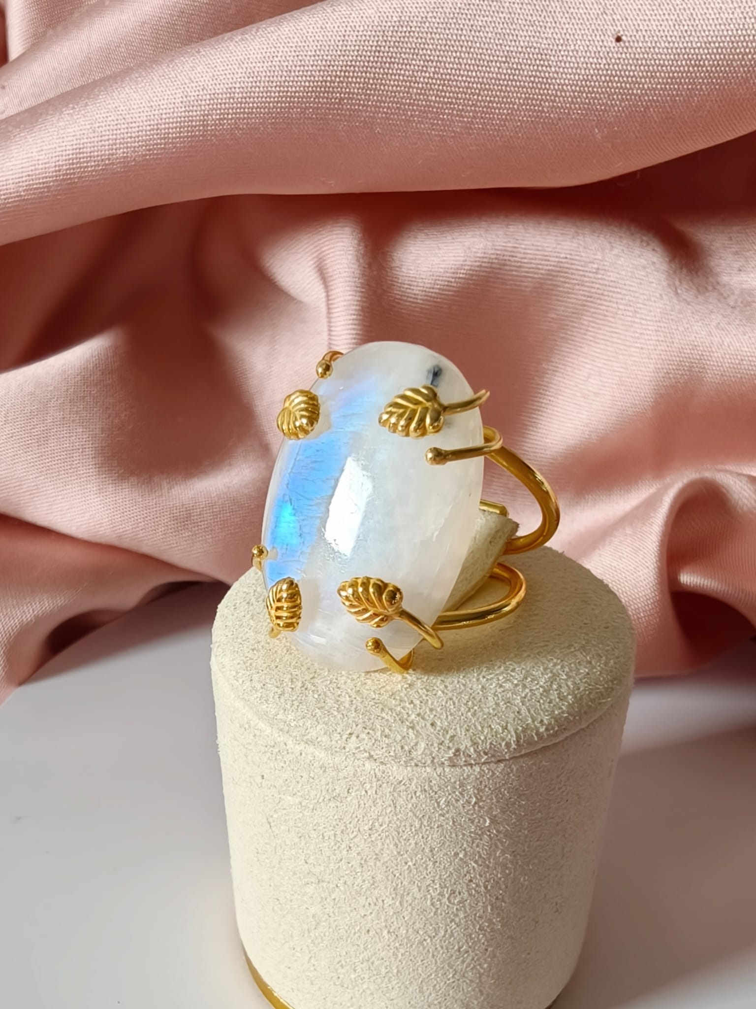 Anello regolabile in ottone dorato con cabochon in labradorite bianca naturale. Un anello con labradorite bianca luminoso e raffinato, caratterizzato da delicati riflessi iridescenti.