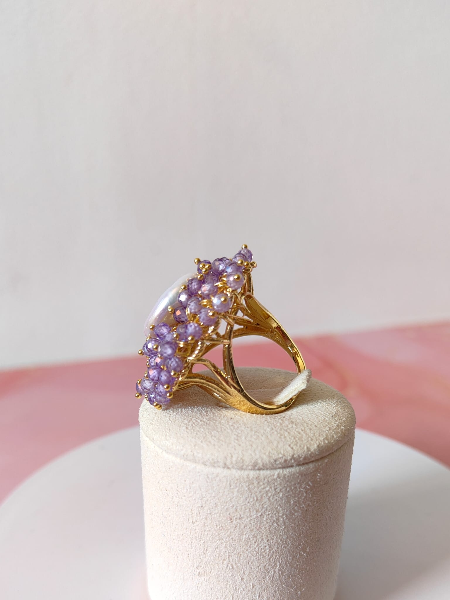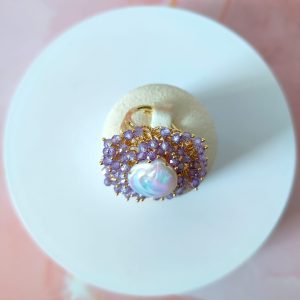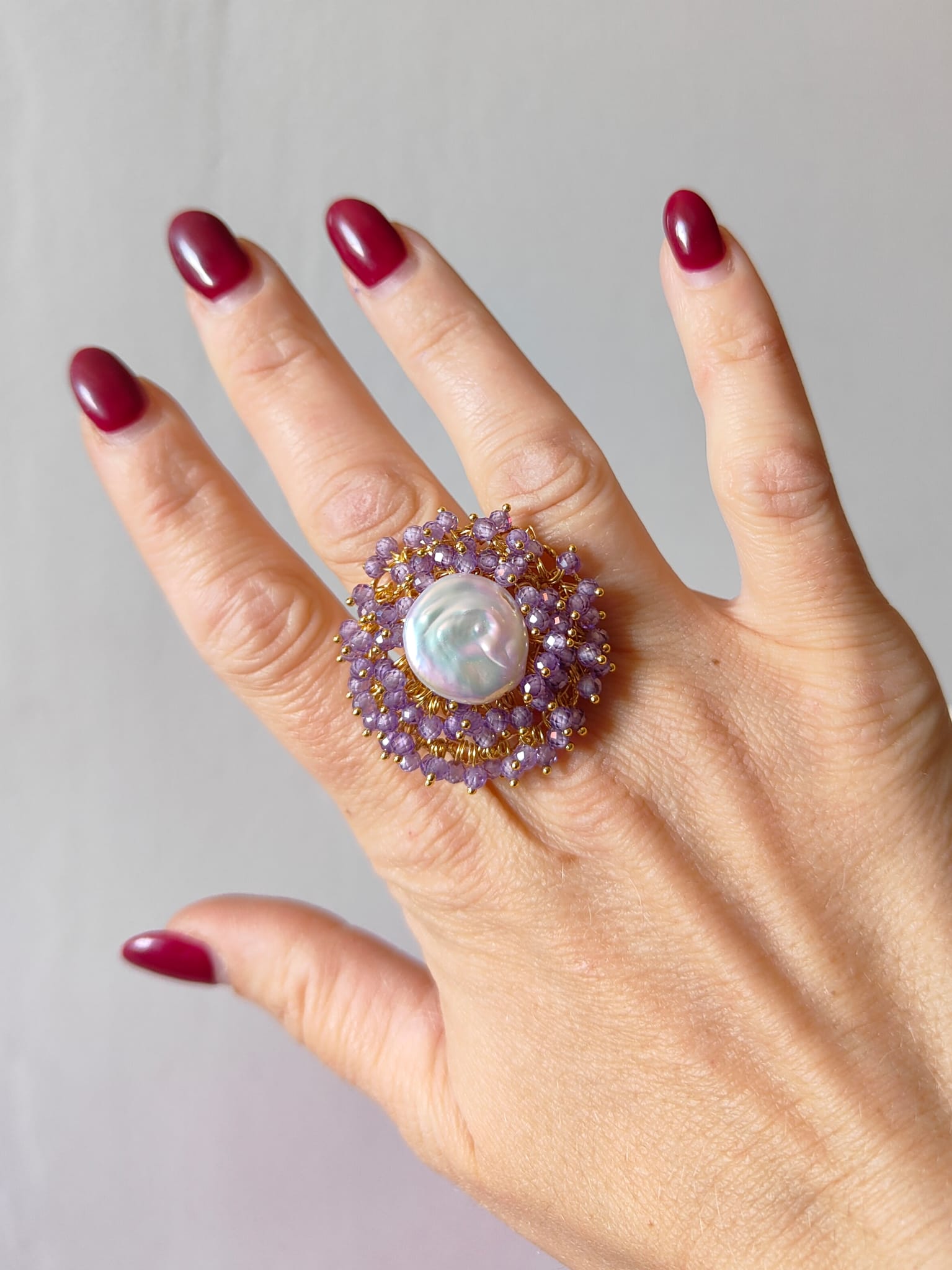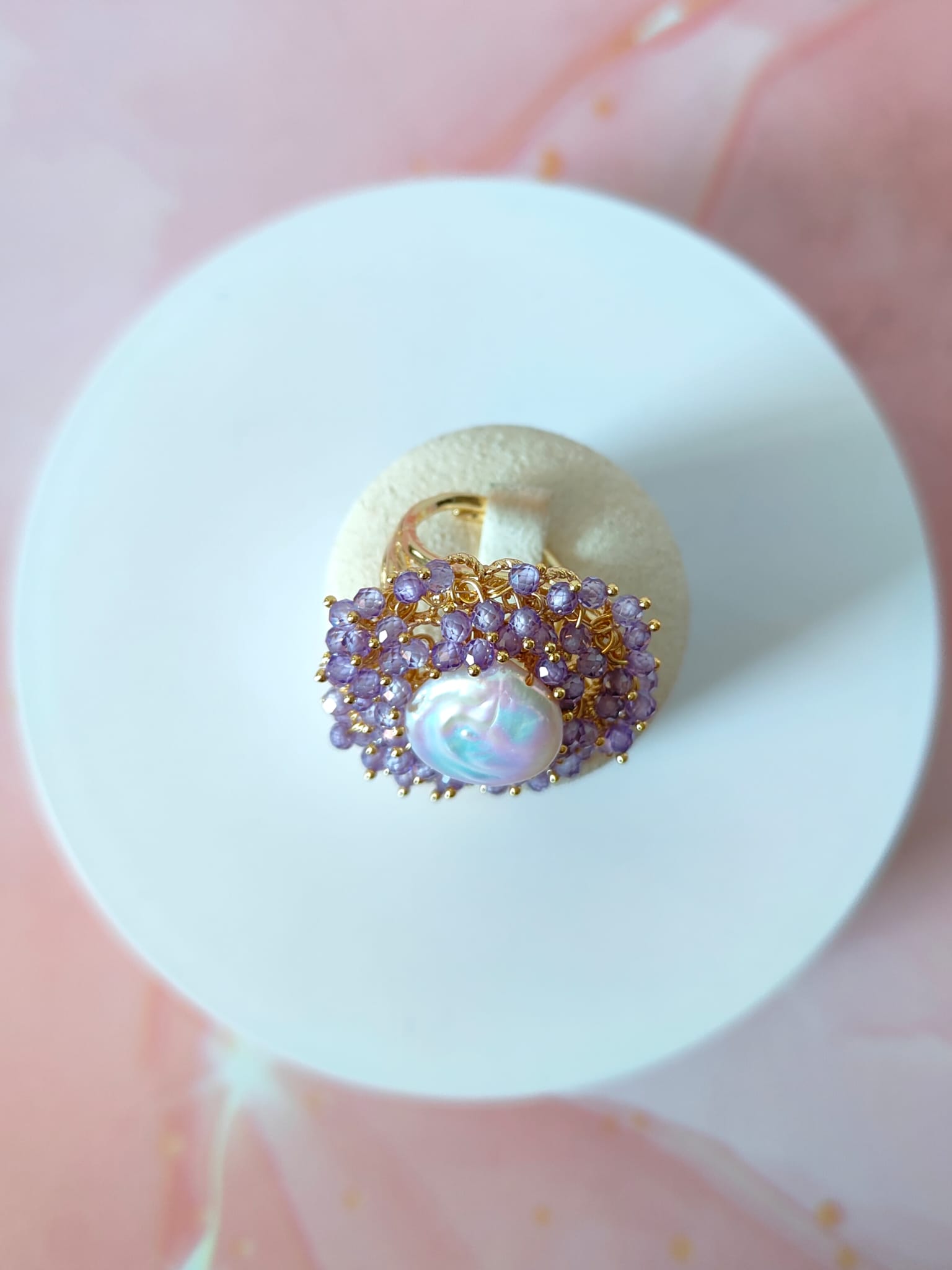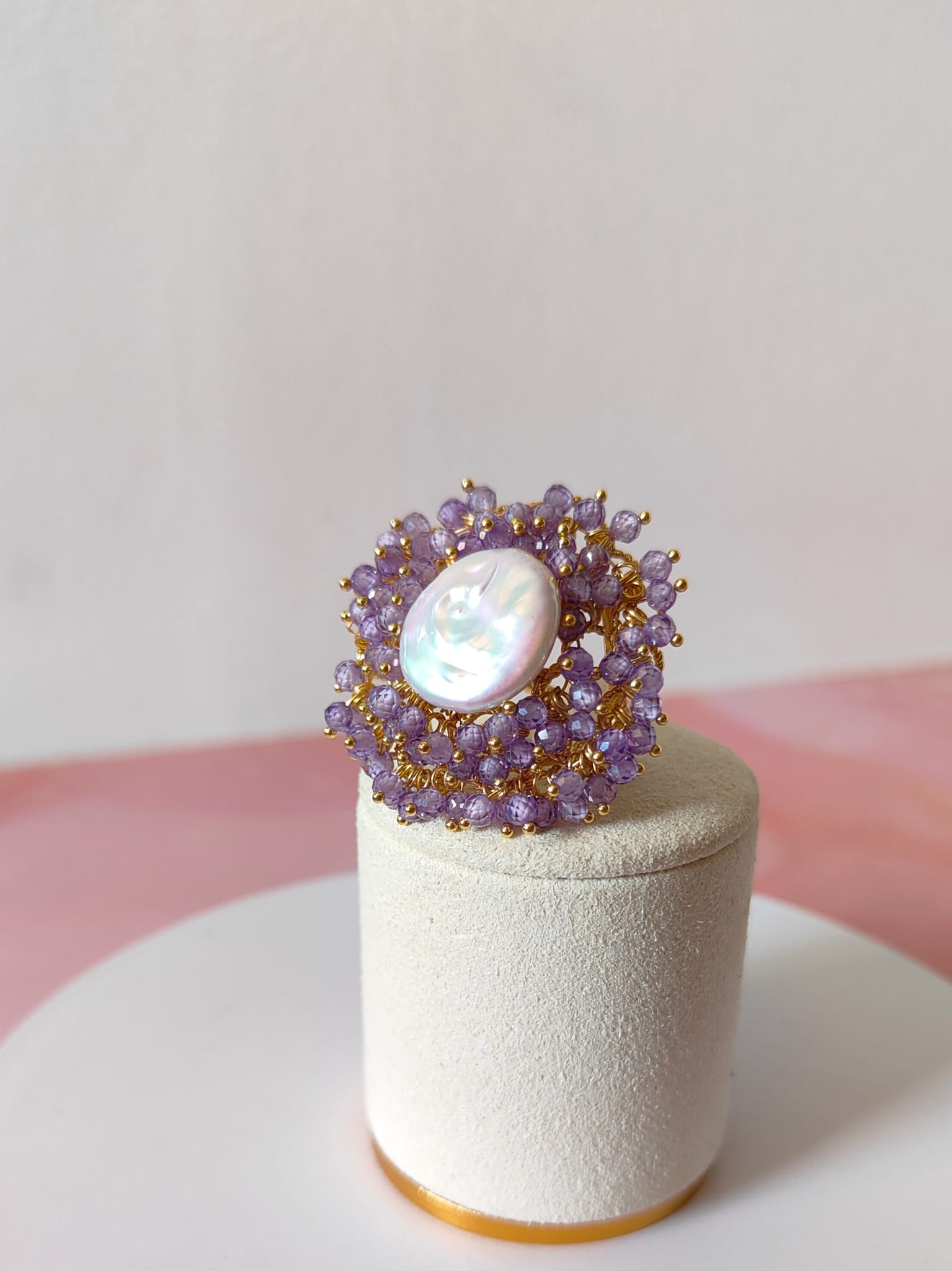 Al centro di questo gioiello spicca una splendida perla barocca naturale, dalla forma irregolare e dal riflesso madreperlaceo che cattura la luce con sfumature cangianti. Attorno, una cornice di cristalli lilla sfaccettati è intrecciata con fili dorati sottilissimi, creando un delicato effetto floreale dal carattere raffinato e contemporaneo.