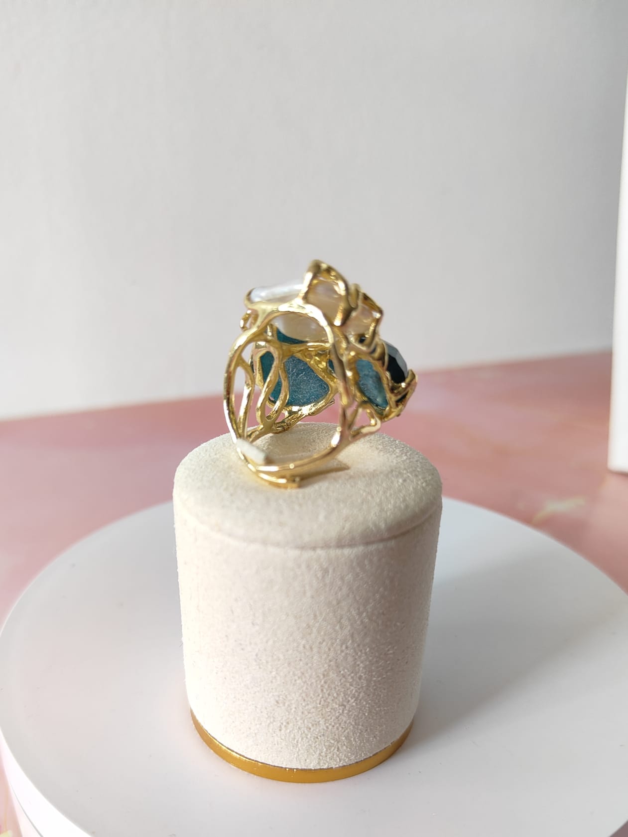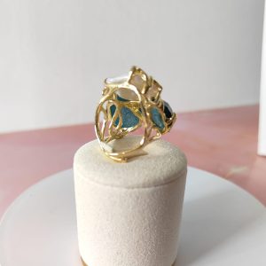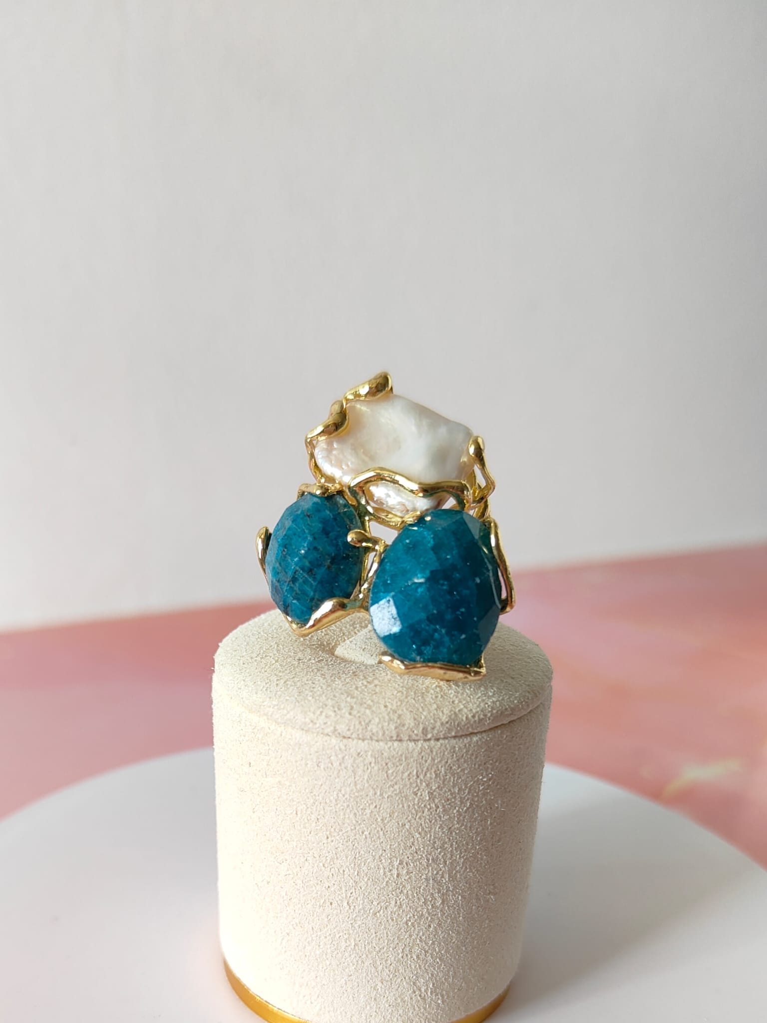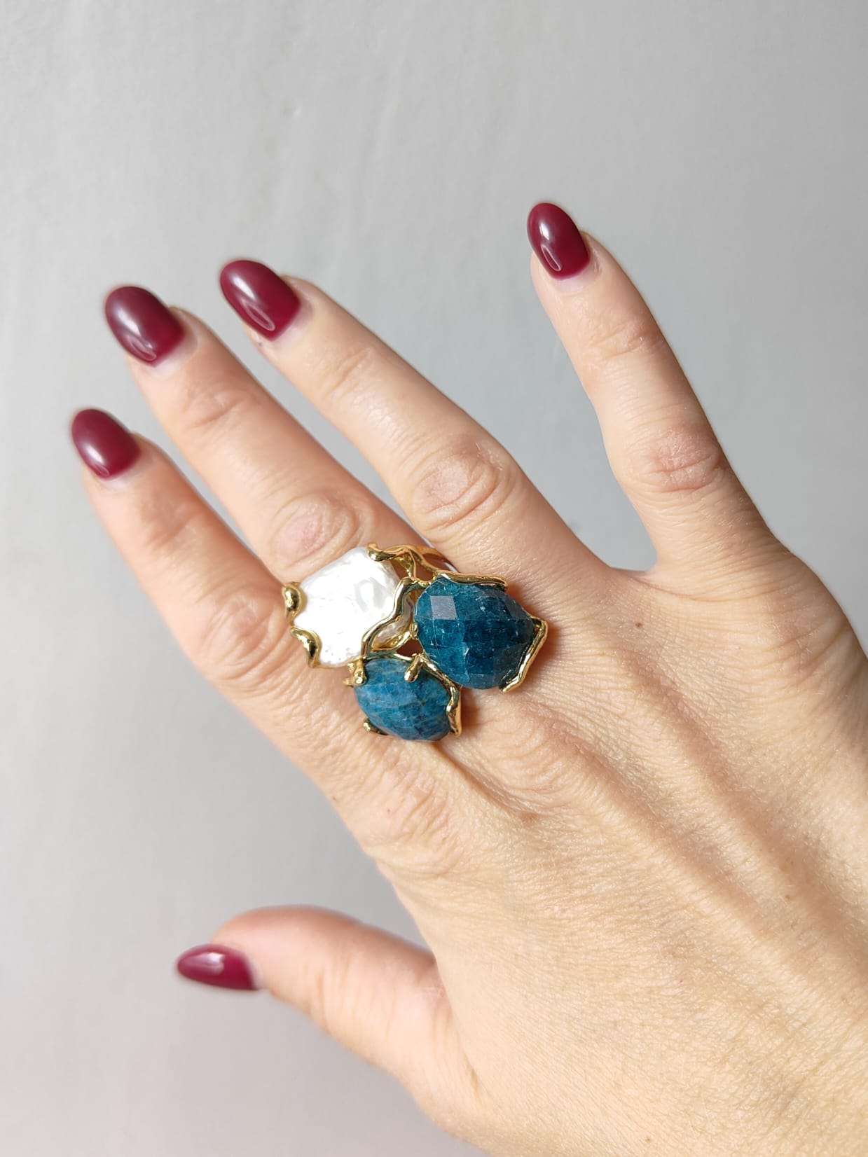 Anello perla apatite regolabile in ottone, dal design scultoreo e contemporaneo, impreziosito da pietre naturali luminose ed eleganti.