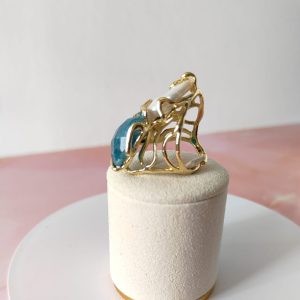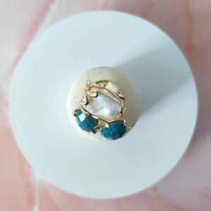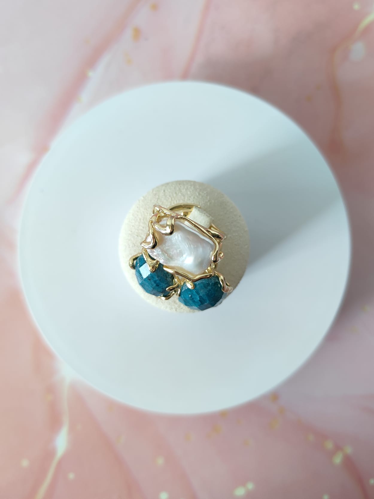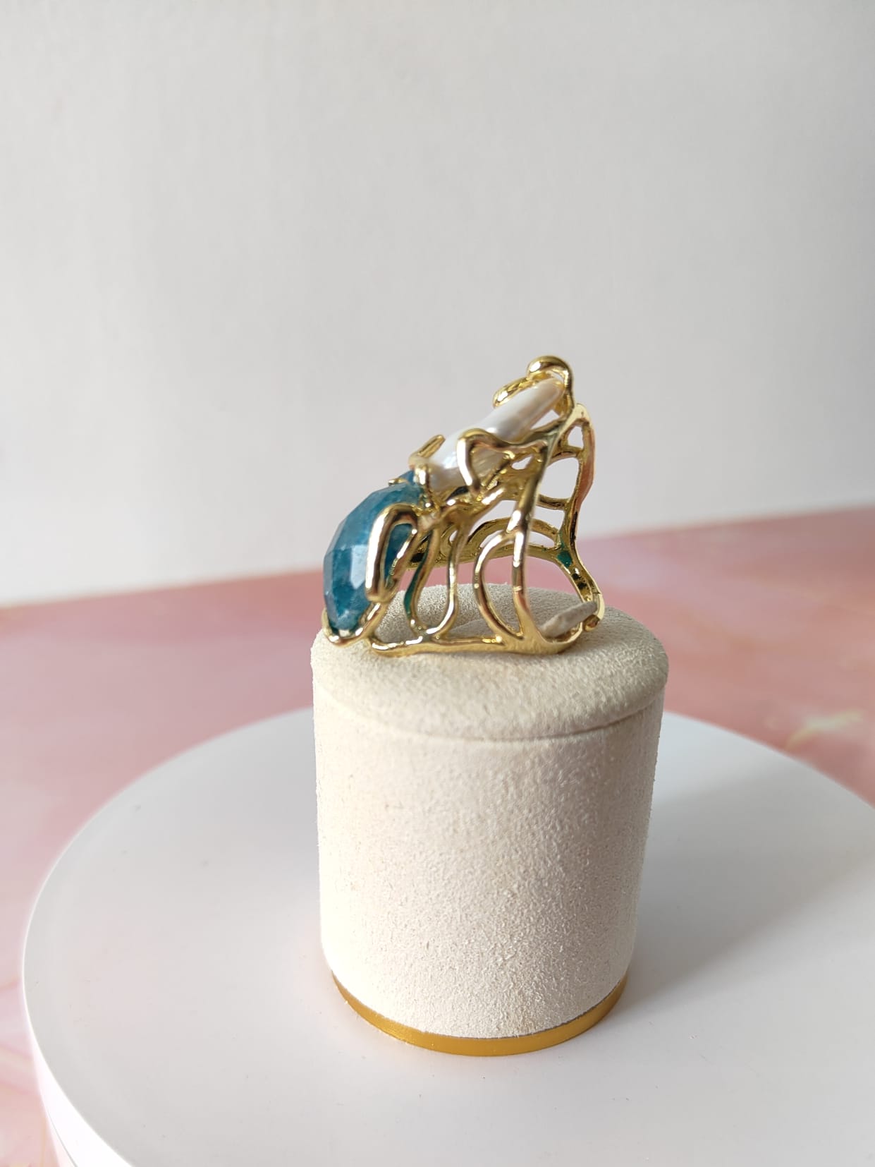 Anello perla apatite regolabile in ottone, dal design scultoreo e contemporaneo, impreziosito da pietre naturali luminose ed eleganti.