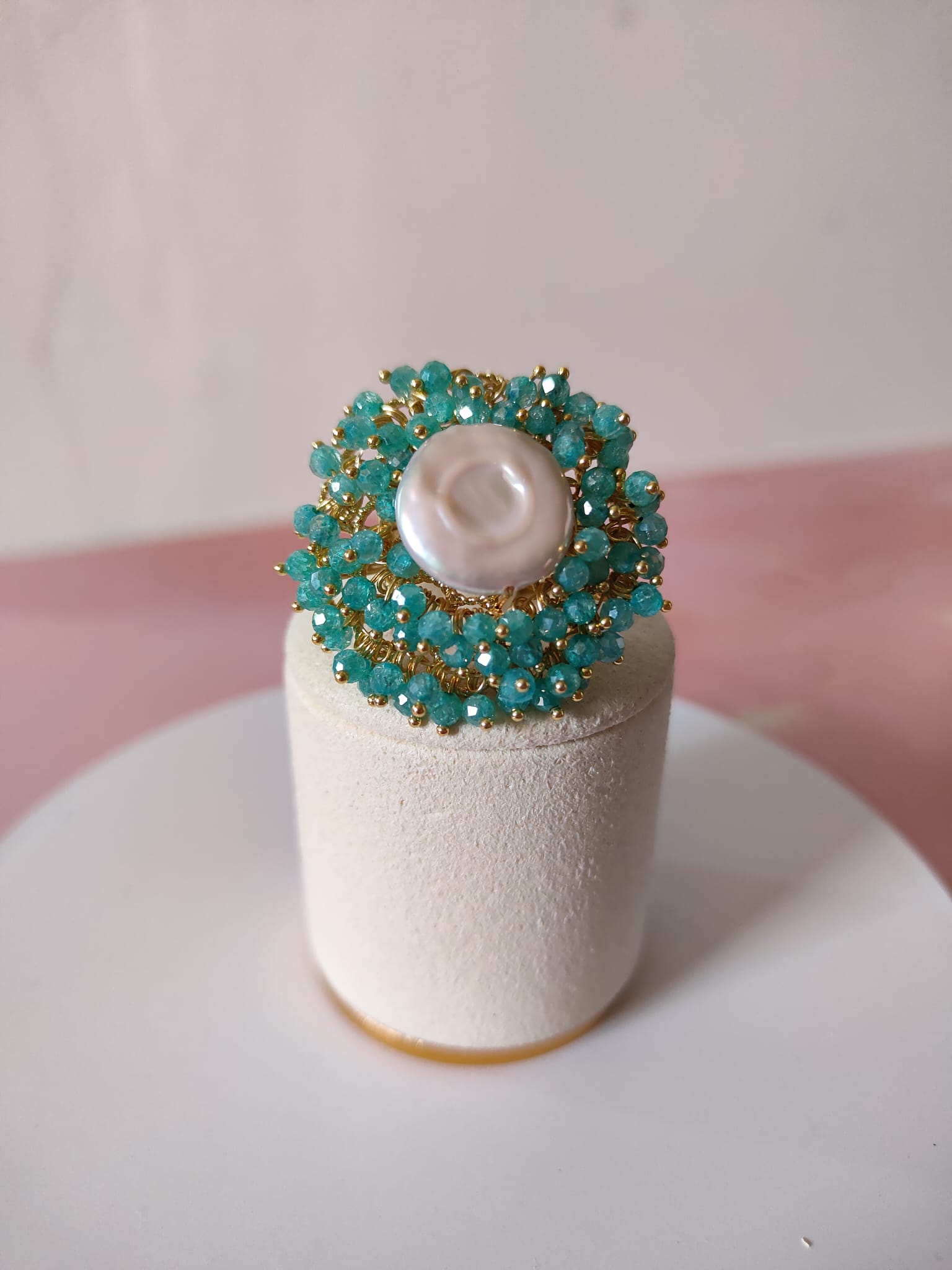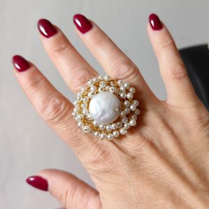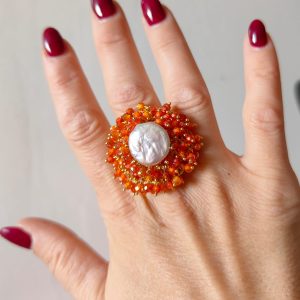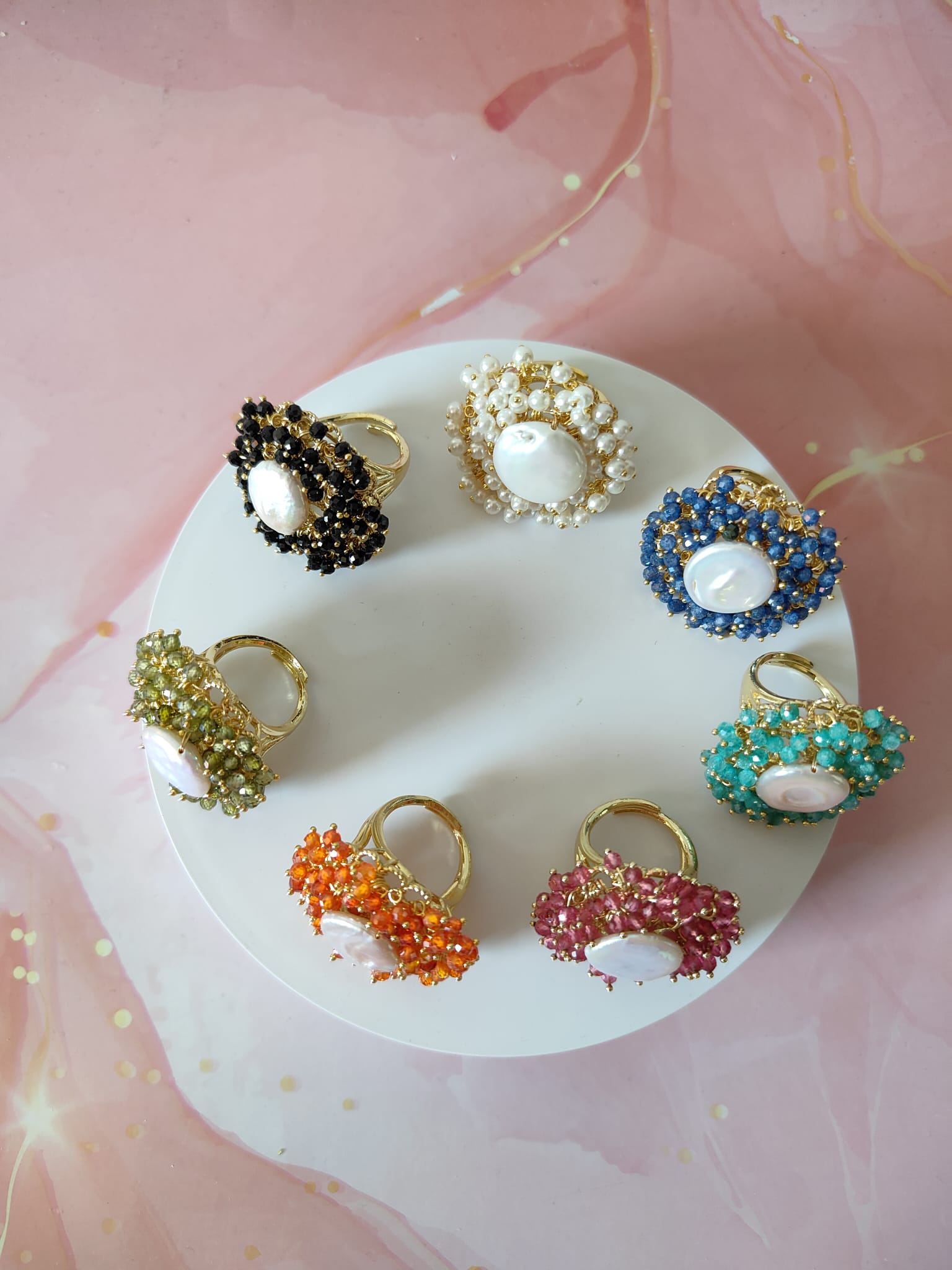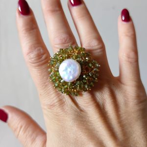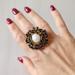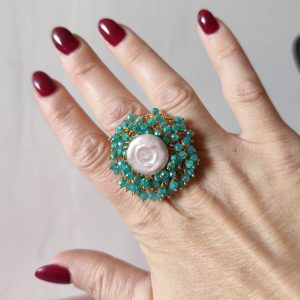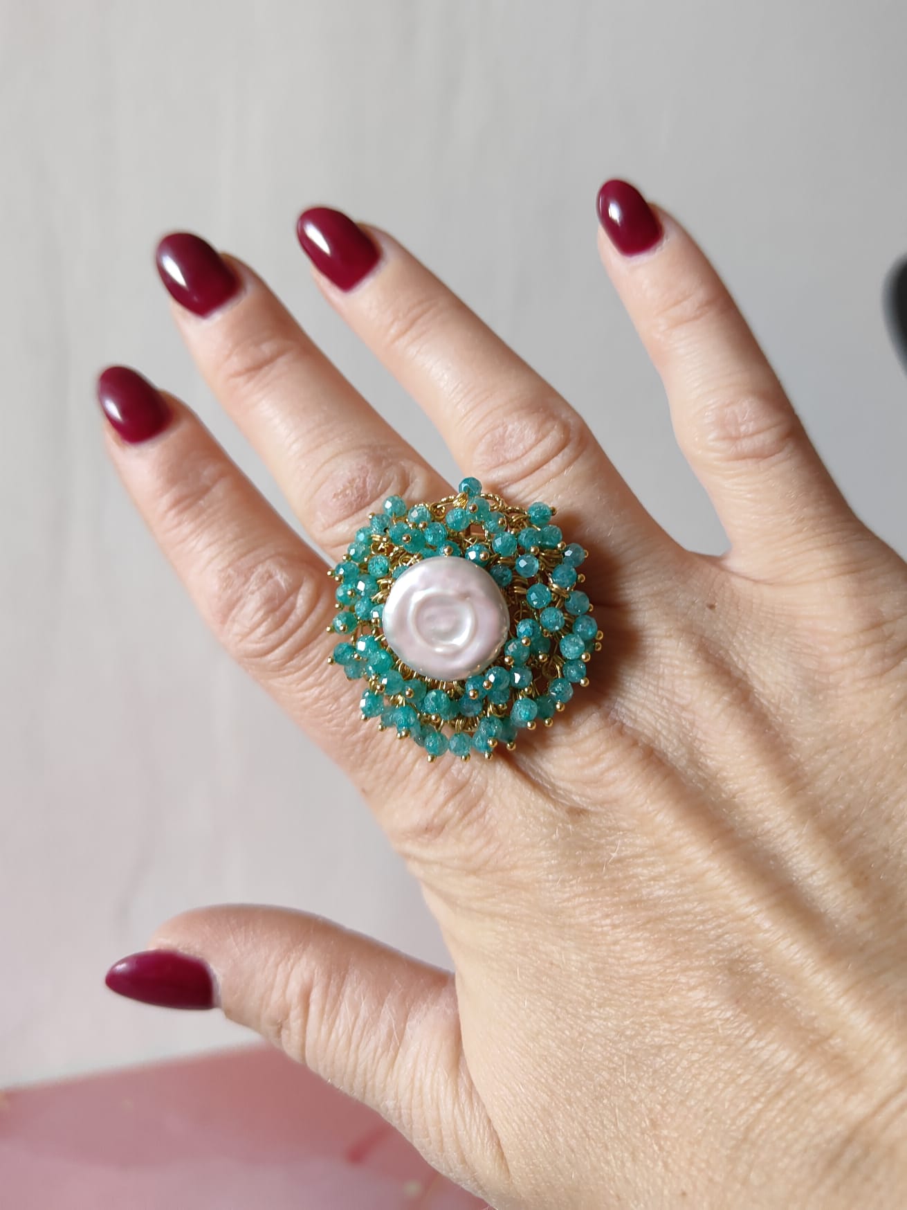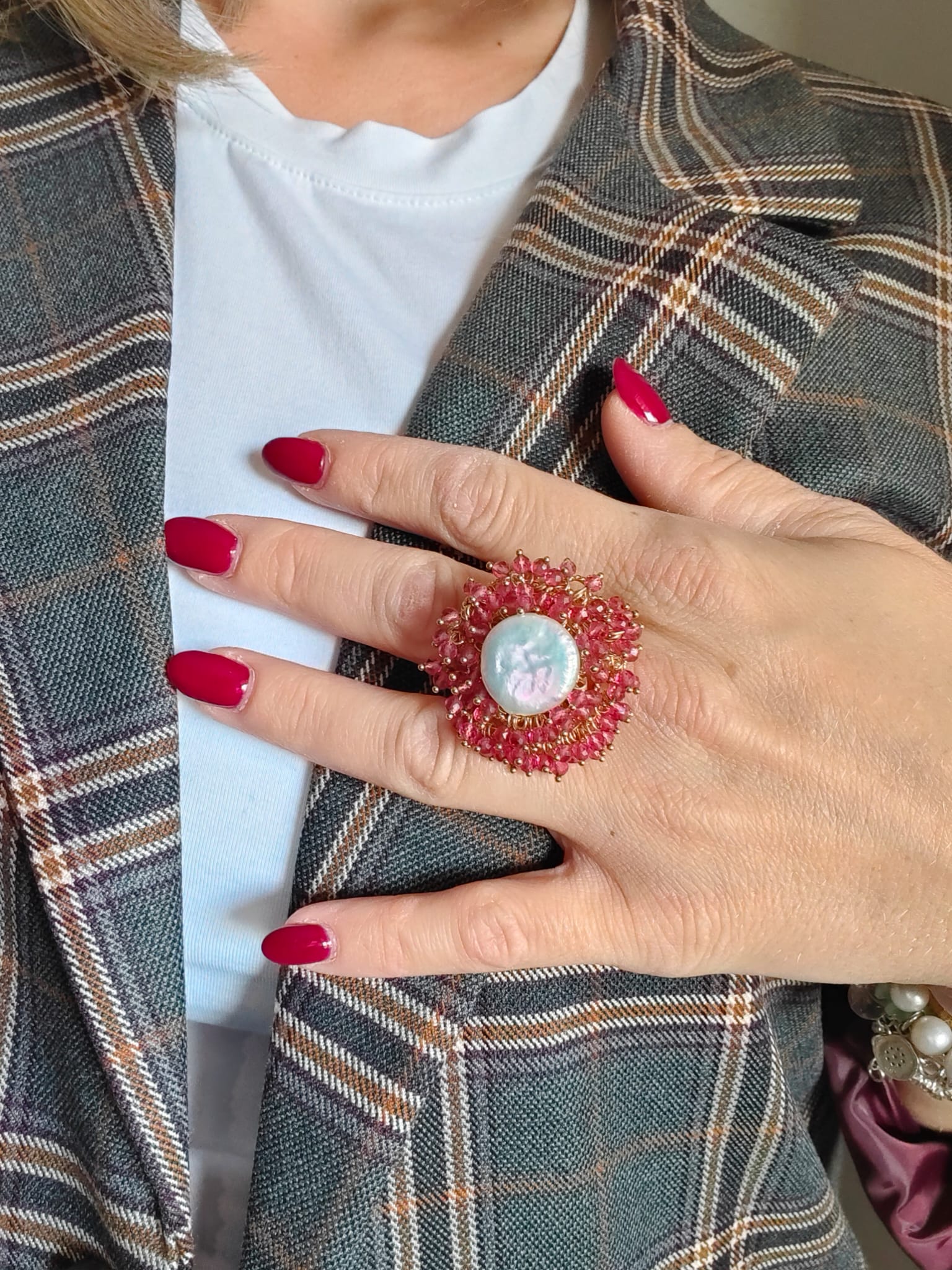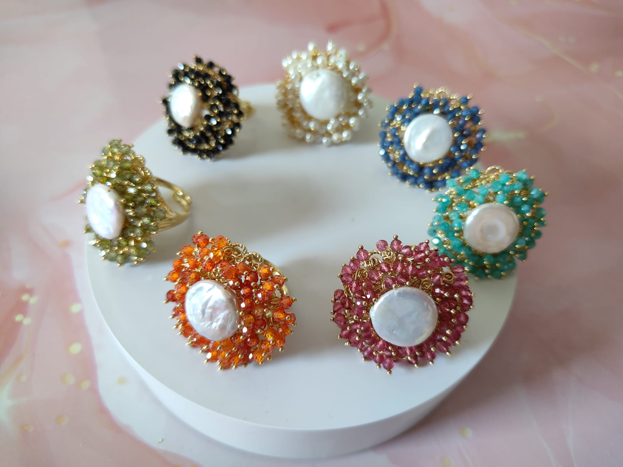 L’anello perla e cristalli è una celebrazione di luce, colore e artigianalità. Ogni dettaglio è pensato per creare un gioiello che unisce eleganza e personalità, rendendo unico ogni gesto di chi lo indossa.
