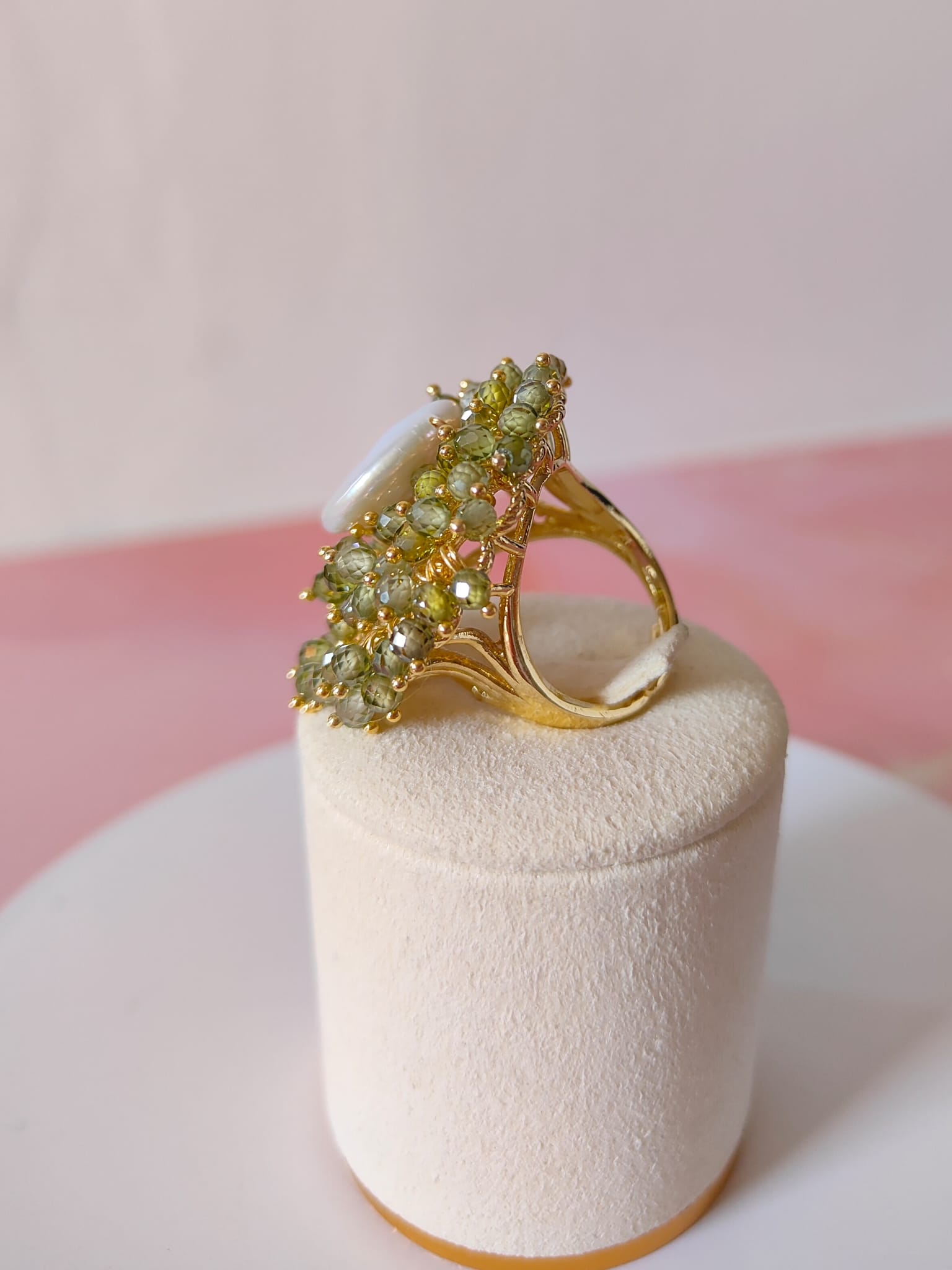 Realizzato in ottone dorato di alta qualità, questo anello presenta una struttura regolabile che si adatta perfettamente a qualsiasi misura. Al centro, una perla naturale cattura la luce con la sua lucentezza iridescente, mentre la cornice di cristalli colorati crea un effetto scintillante e armonioso.
