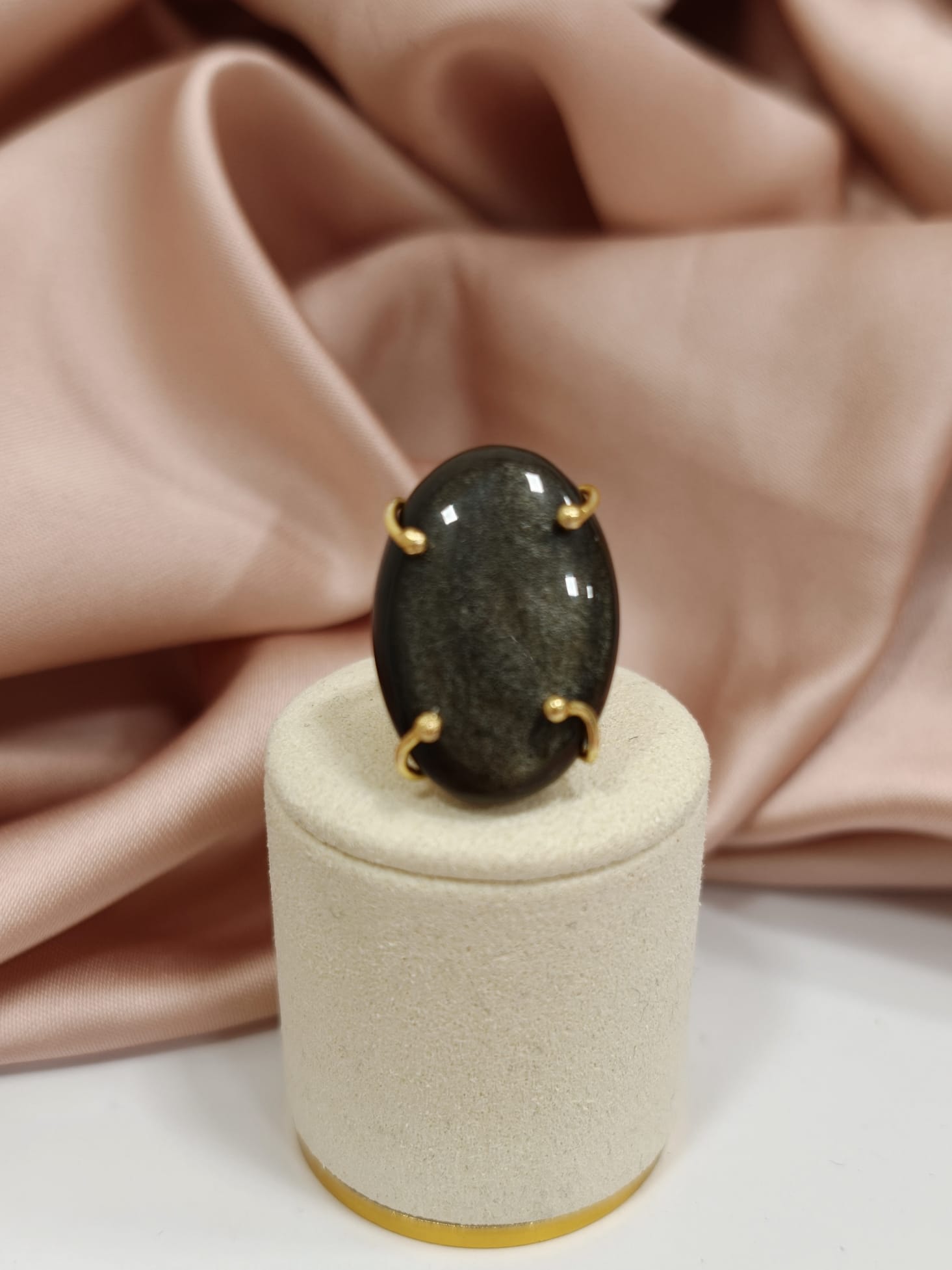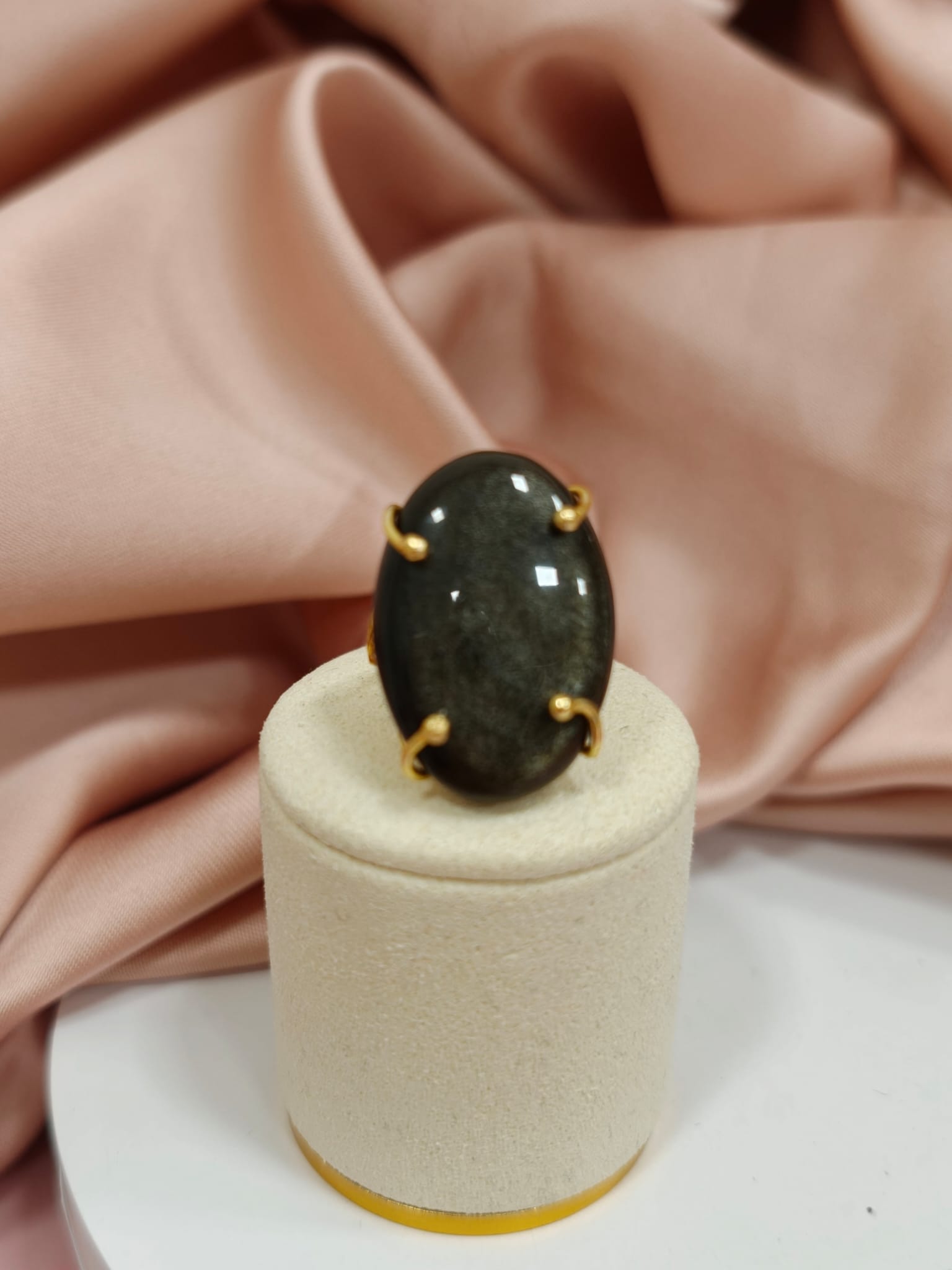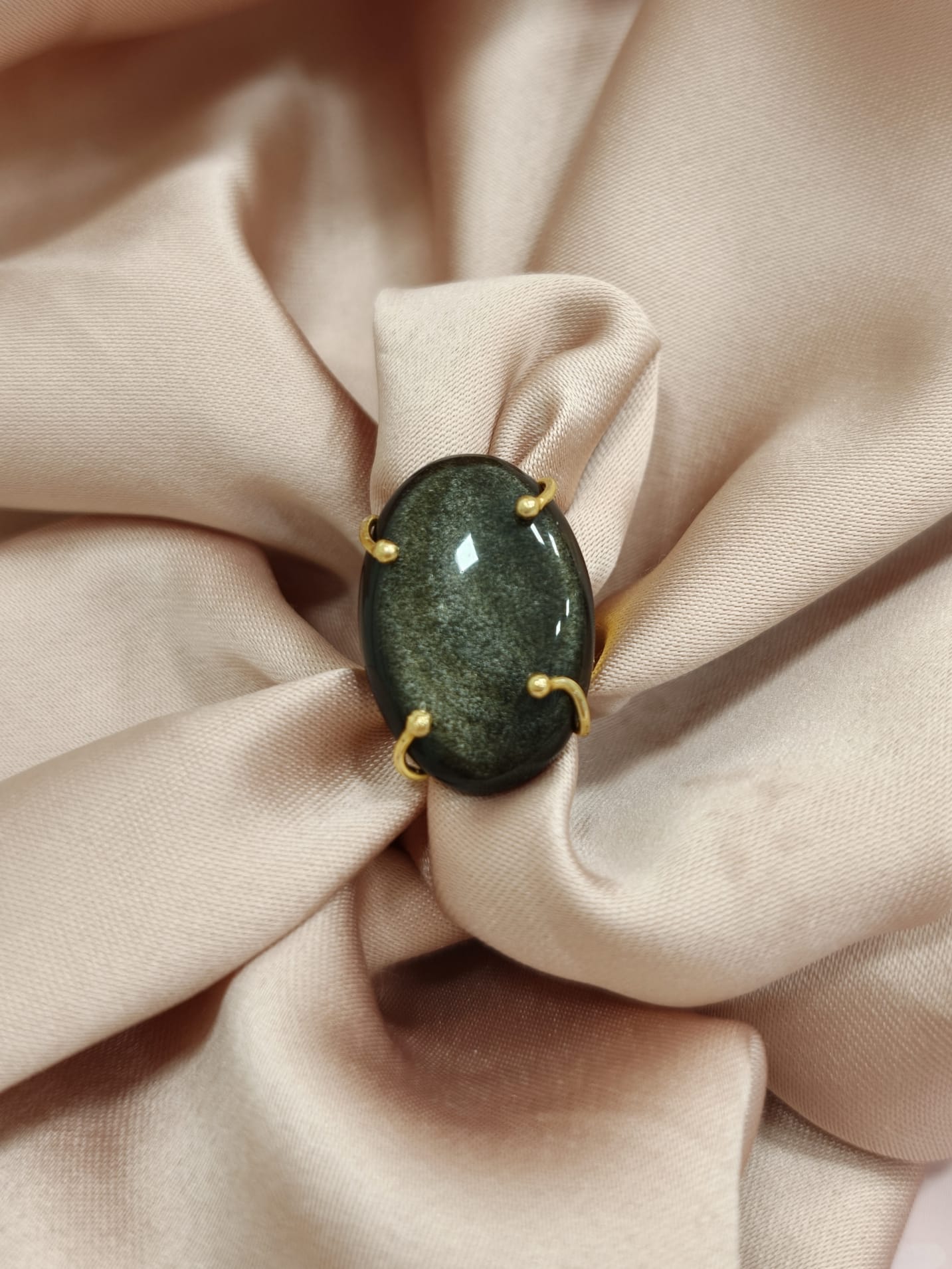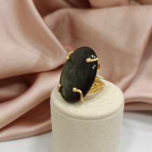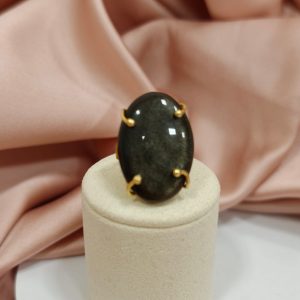 Questo anello regolabile con ossidiana è un gioiello dal fascino profondo e magnetico, capace di catturare lo sguardo grazie alla bellezza naturale della pietra. La protagonista assoluta è una splendida ossidiana dorata naturale, taglio cabochon ovale da 30×20 mm, caratterizzata da riflessi scuri attraversati da delicate sfumature luminose.