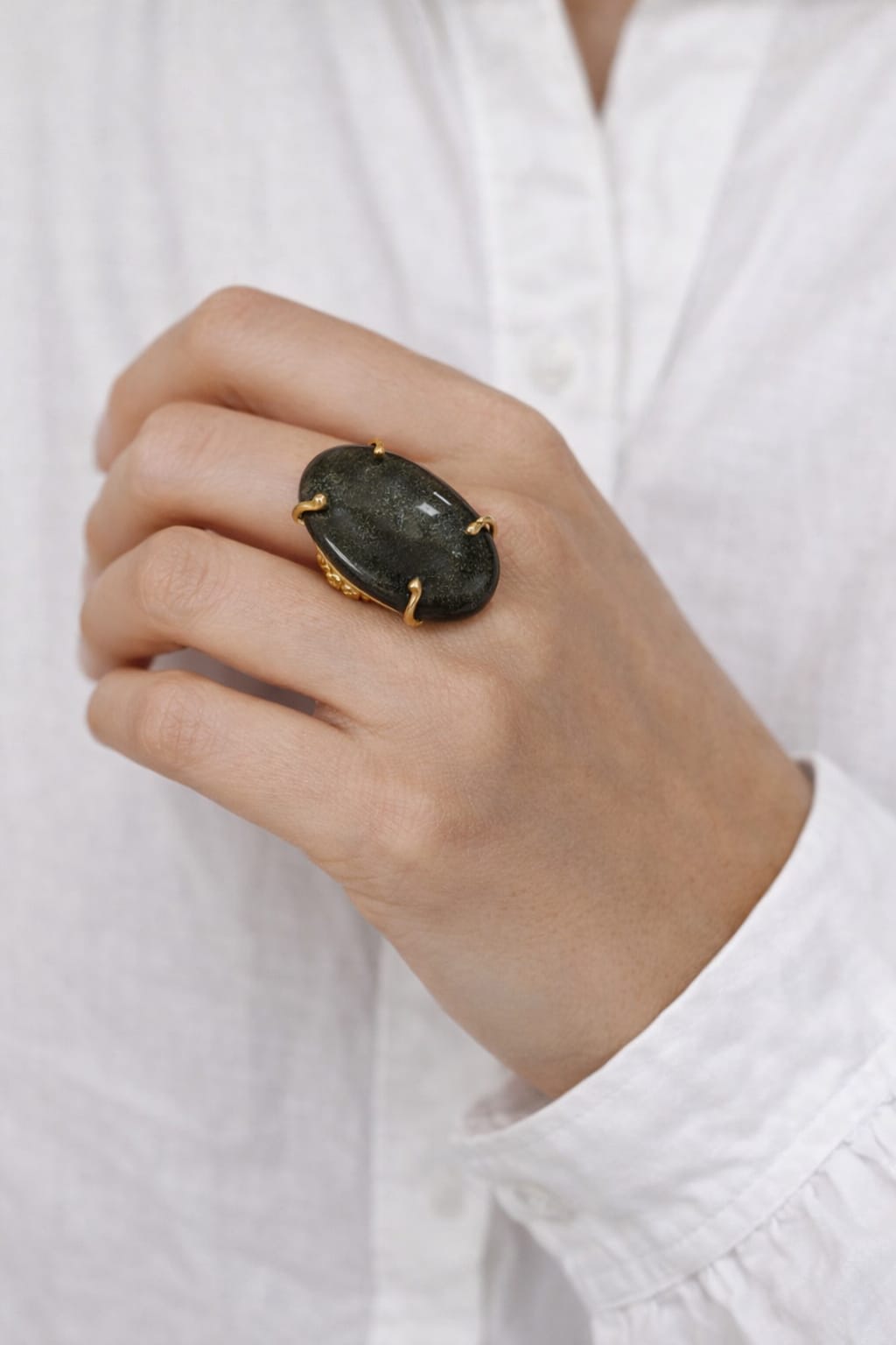 Grazie alla dimensione importante della pietra, questo anello diventa un vero punto focale dello stile, ideale per chi ama gioielli che raccontano una presenza forte ma raffinata.