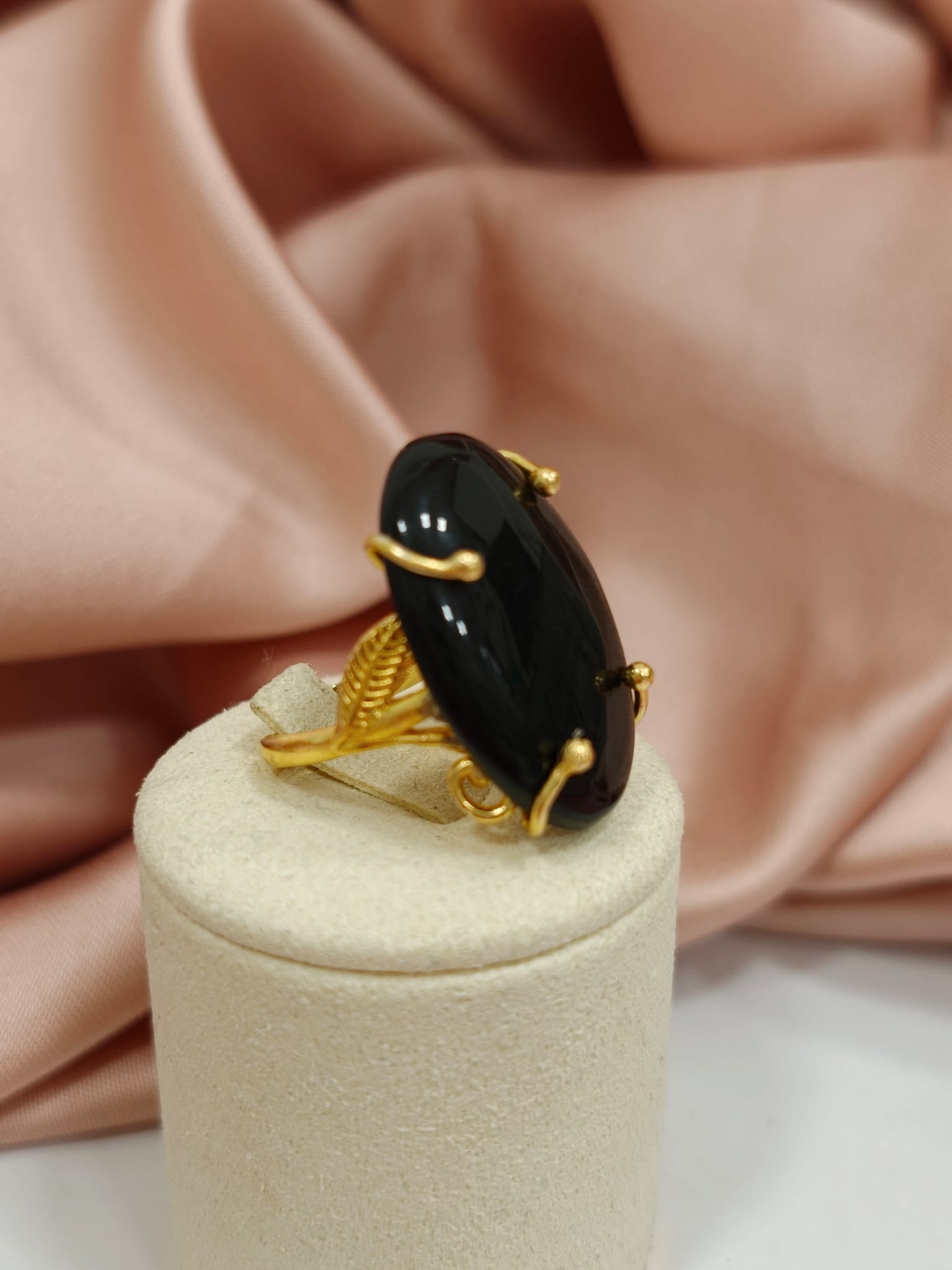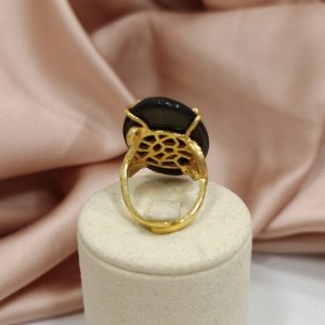 La pietra è valorizzata da una montatura elegante in ottone dorato, lavorata per abbracciare la gemma con armonia e sicurezza. Le sottili griffes dorate sostengono la pietra esaltandone la forma e la brillantezza, creando un contrasto raffinato tra il nero profondo dell’ossidiana e la luminosità del metallo.