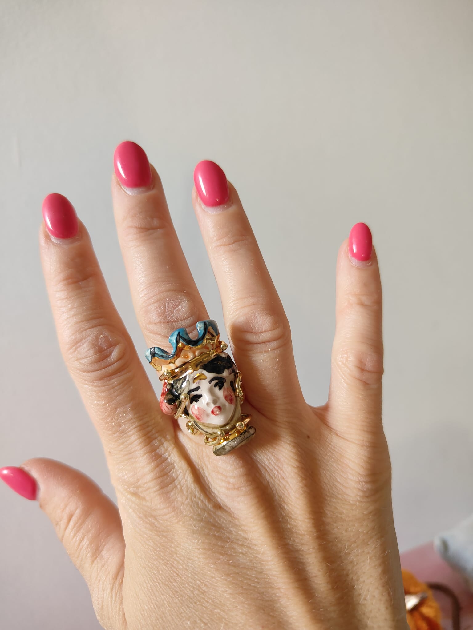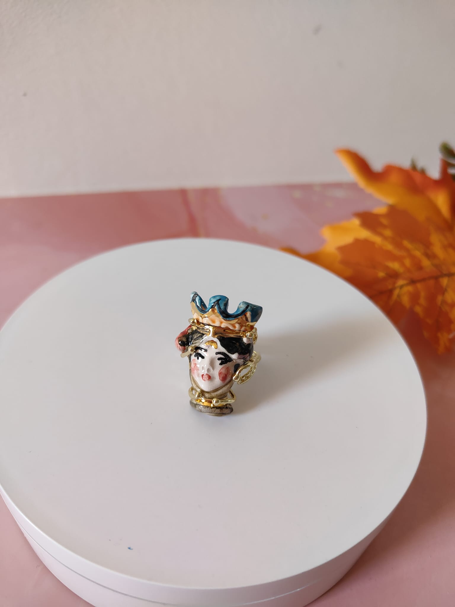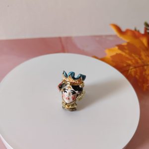 L’anello testa di moro in ceramica di Caltagirone è una creazione che racchiude l’essenza della tradizione siciliana e il gusto per i dettagli artistici. Realizzato interamente a mano, questo anello diventa più di un accessorio: è un simbolo di storia, cultura e passione artigiana.