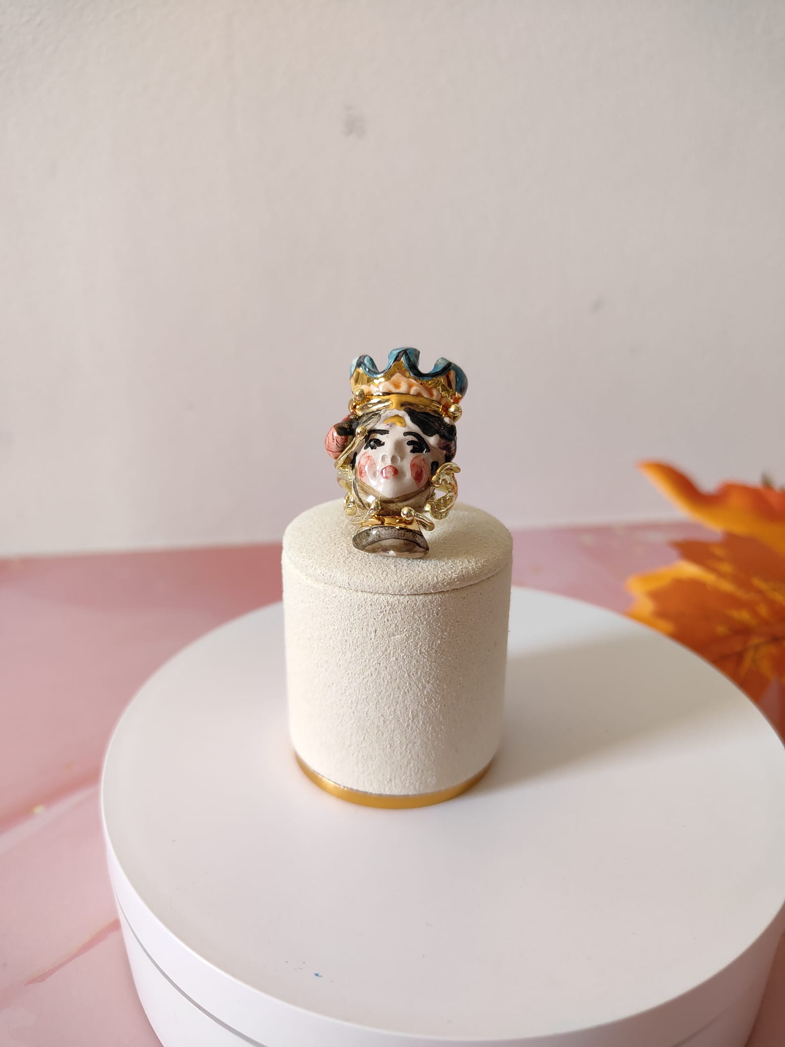 La ceramica di Caltagirone è famosa in tutto il mondo per la sua vivacità e le sue decorazioni inconfondibili. La miniatura della testa di moro, dipinta a mano con colori brillanti, conferisce all’anello un carattere unico e fortemente identitario. Ogni dettaglio del volto, dalla corona alla delicata espressione, racconta l’arte secolare dei maestri ceramisti siciliani.
