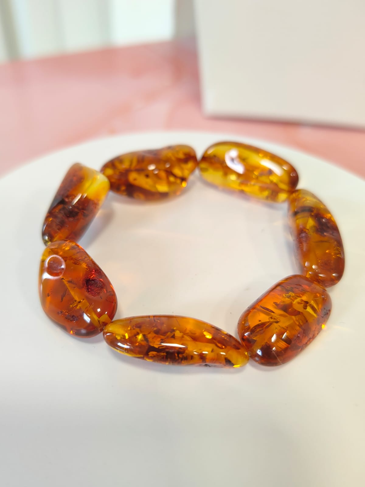 Le forme delle perle, volutamente irregolari e organiche, valorizzano l’essenza genuina dell’ambra: morbida alla vista, leggera al tatto, ma visivamente potente. Indossato al polso, il bracciale diffonde riflessi luminosi che cambiano con il movimento, regalando una brillantezza elegante e discreta. Grazie all’elastico interno resistente e invisibile, il gioiello si adatta con comfort a diverse circonferenze, rendendolo ideale sia per un uso quotidiano sia per un’occasione speciale.