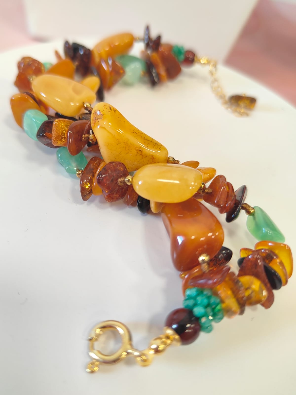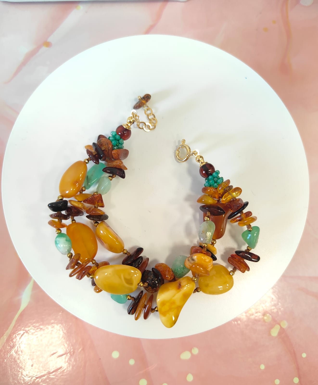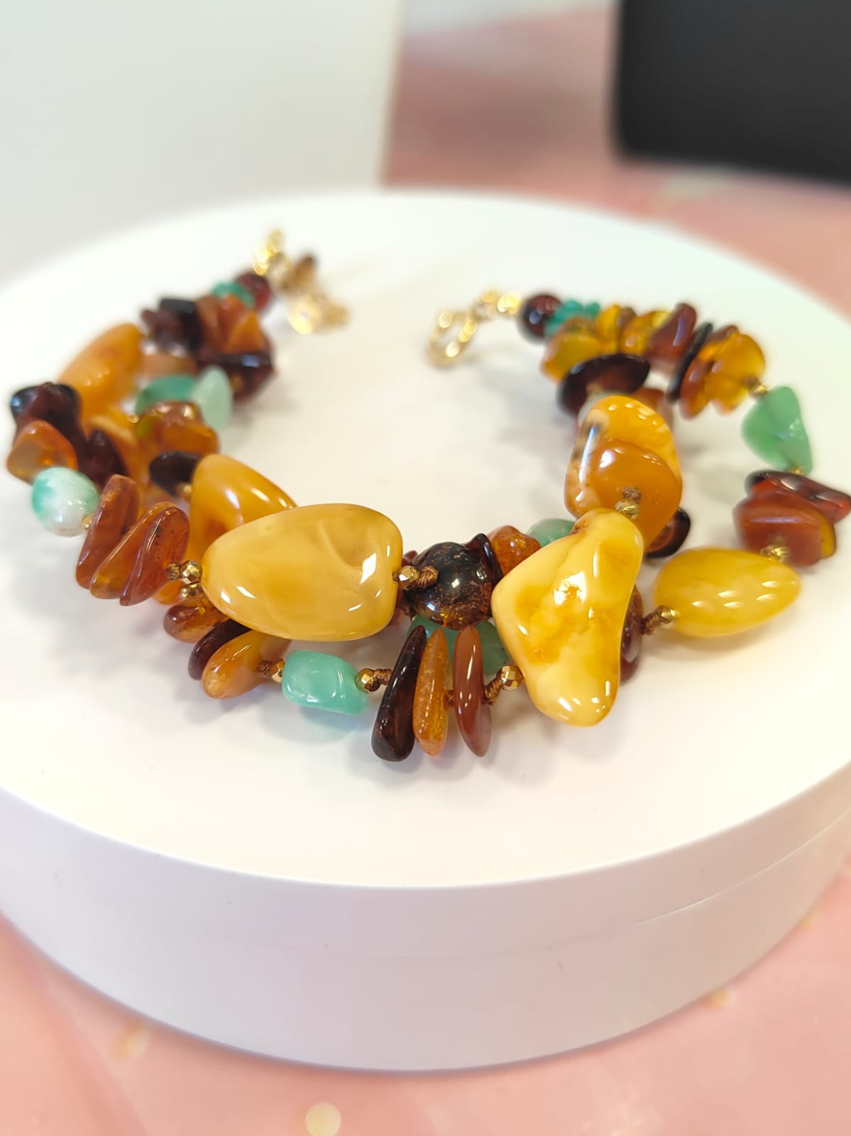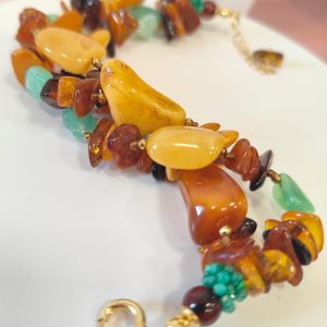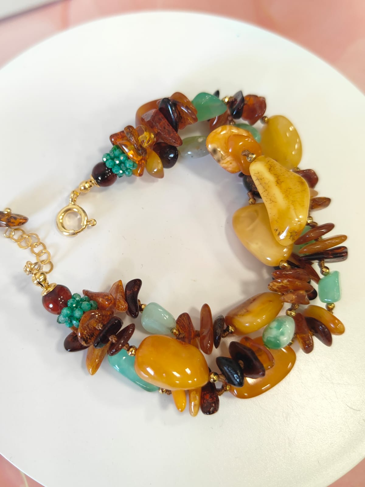 Bracciale Ambra E Crisoprasio è una creazione artigianale che unisce colori caldi e naturali, ispirati alle sfumature del Mediterraneo. Le pietre di ambra, selezionate in diverse tonalità miele, cognac e butterscotch, donano al gioiello un bagliore caldo e dorato, mentre il crisoprasio naturale introduce un contrasto fresco e vivace con le sue sfumature verdi e acquatiche. L’accostamento dei materiali è studiato per creare un equilibrio armonico, dove forme irregolari, chips e pietre levigate dialogano in modo fluido e organico.