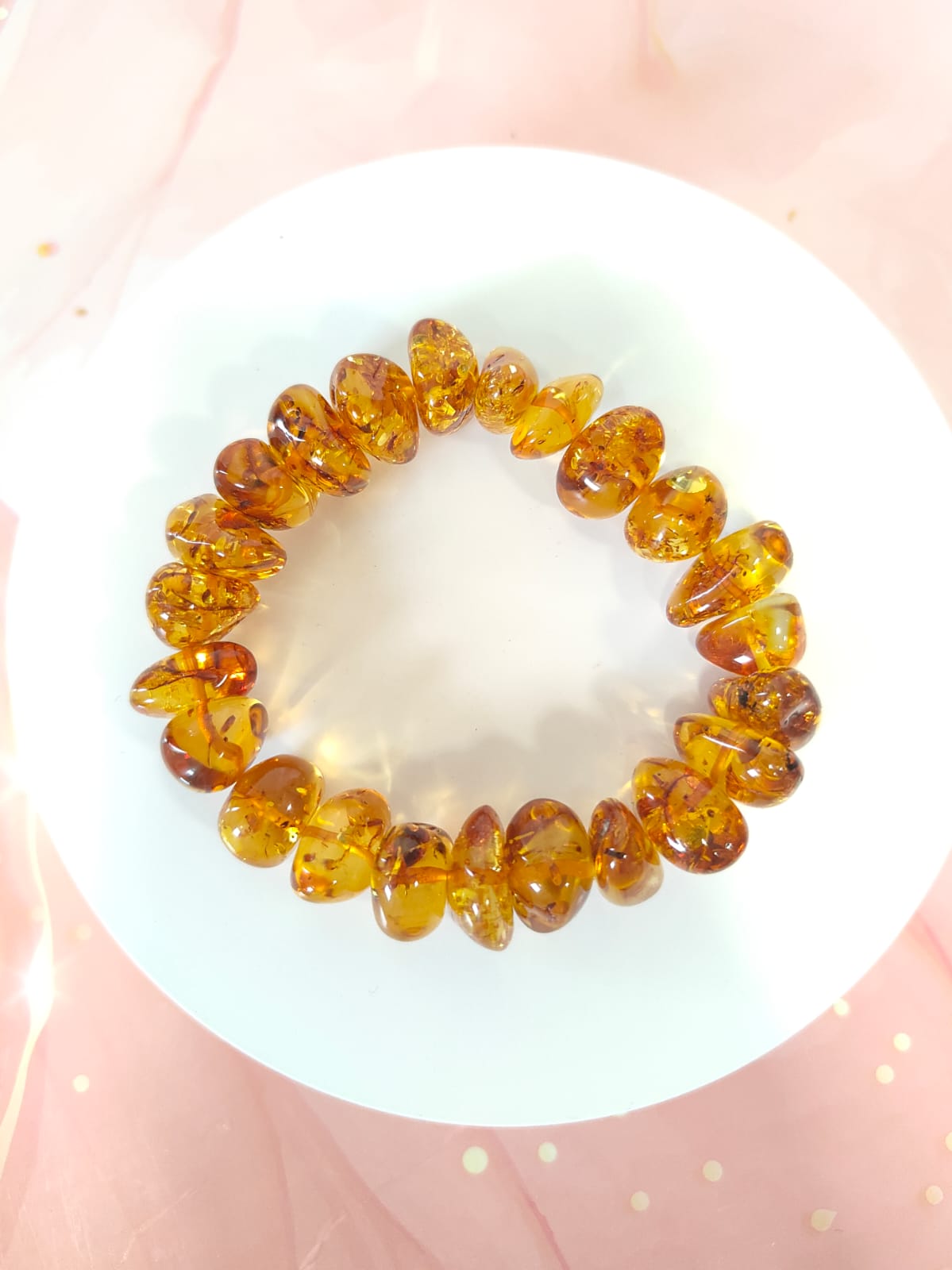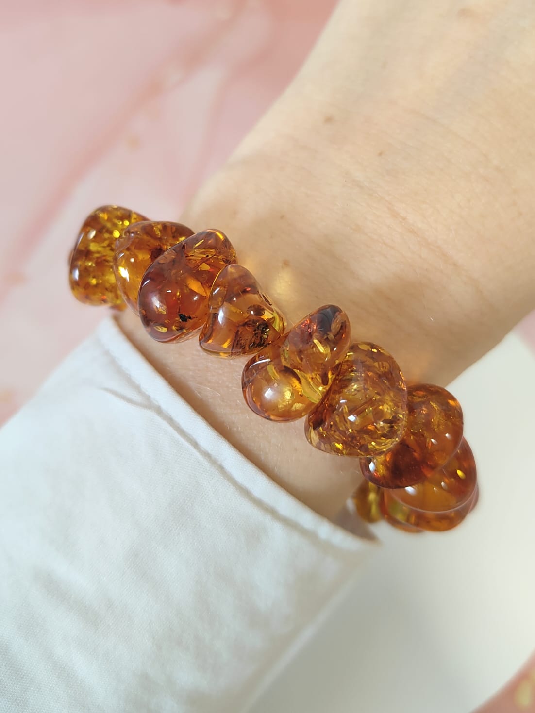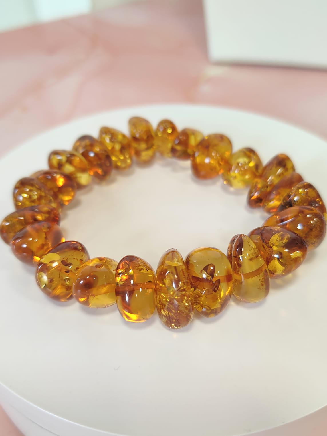 Grazie all’elastico interno resistente e confortevole, il bracciale si adatta con naturalezza a diverse circonferenze, permettendo una vestibilità pratica e piacevole. È ideale per chi desidera un gioiello naturale, ricco di energia, significato e storia: ogni perla di ambra custodisce infatti millenni di vita, racchiusi nelle sue caratteristiche inclusioni che rendono ogni pezzo unico al mondo.