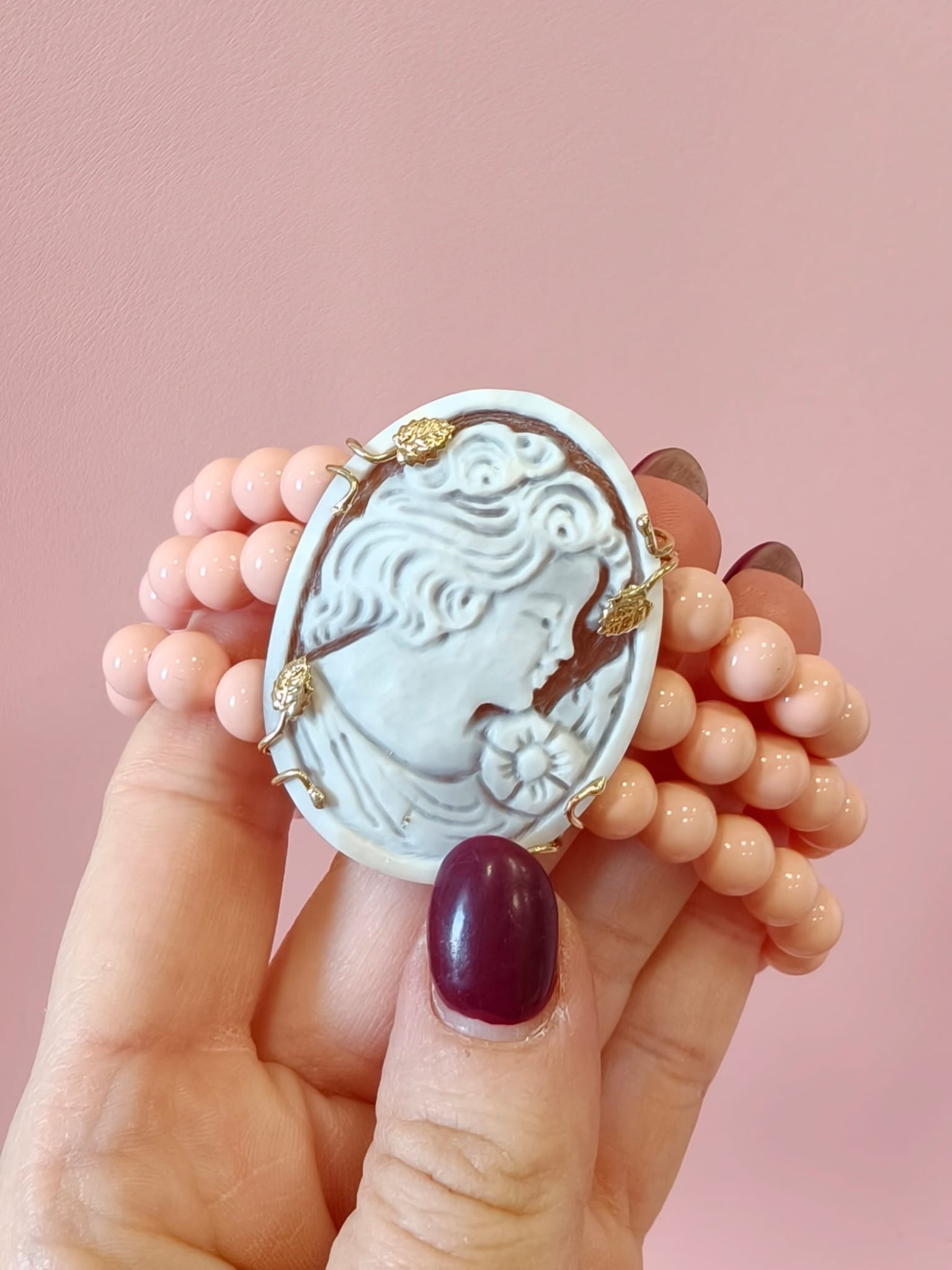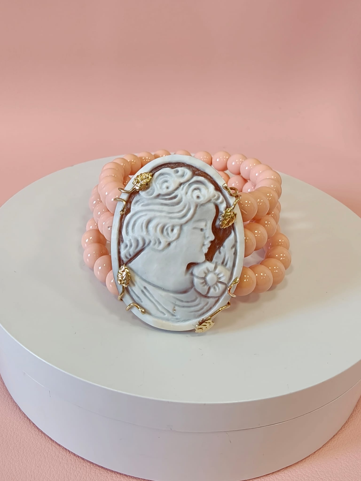 Il cammeo raffigura una figura femminile finemente scolpita, montato su una base dorata inargento 925 placcata oro decorata con motivi floreali. Il cinturino è composto da perle rosa montate su filo elastico resistente, per un fit comodo e adattabile a diverse misure di polso.