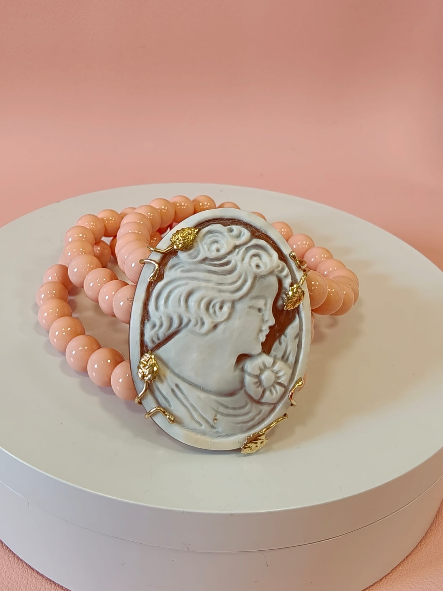 Materiali: cammeo in conchiglia naturale inciso a mano, argento 925 placcato oro, perle rosa in pasta di corallo, filo elastico