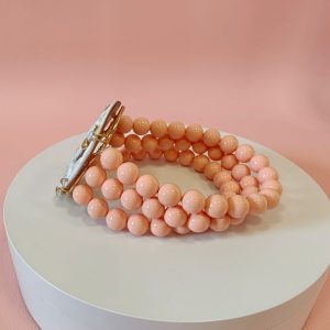 Un gioiello dallo stile classico reinterpretato con grazia contemporanea. Realizzato artigianalmente, questo bracciale unisce la bellezza di un cammeo inciso a mano su conchiglia naturale alla delicatezza delle perle rosa, per un risultato raffinato e femminile.