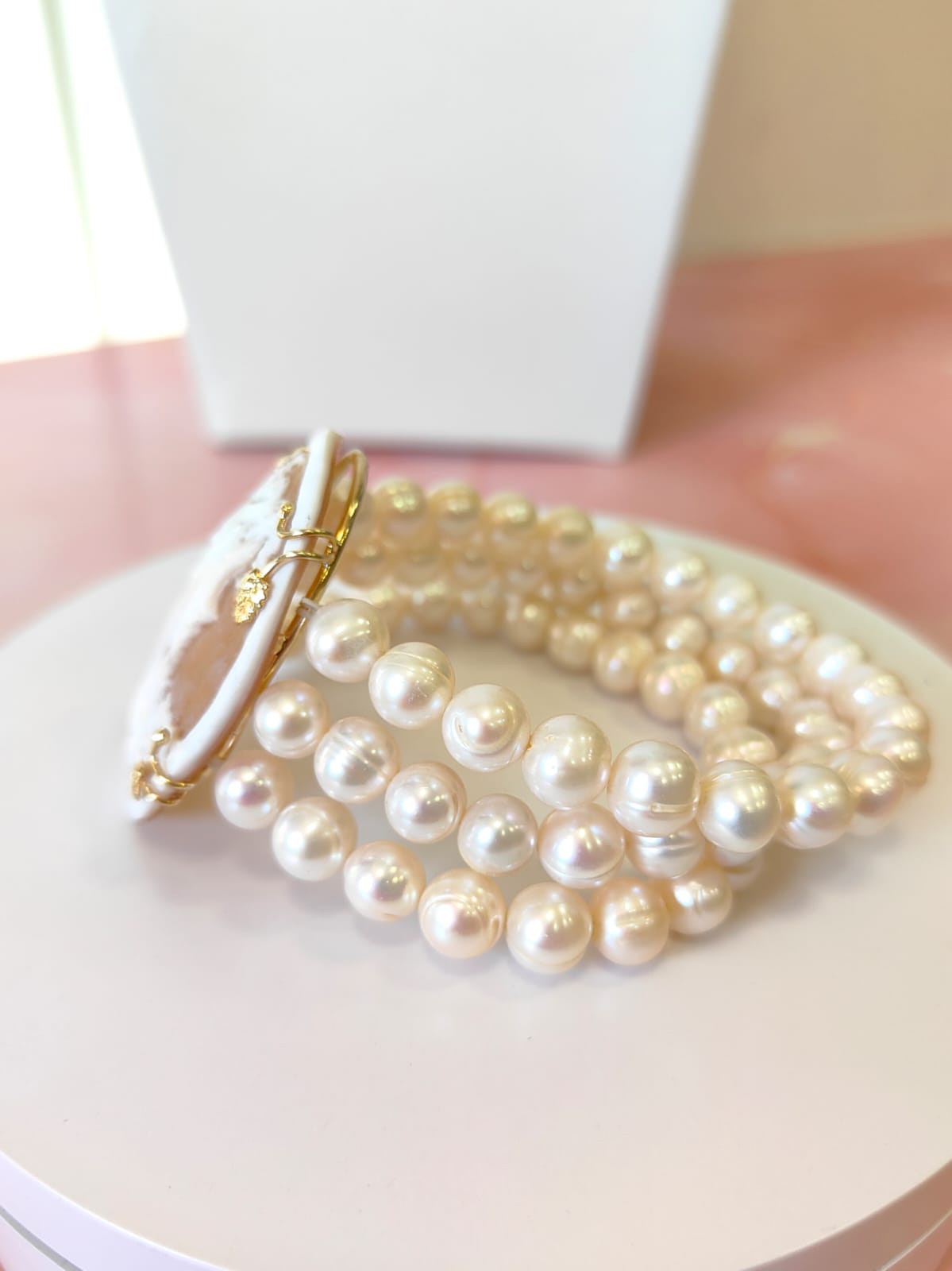 Il bracciale cammeo e perle è un gioiello che unisce delicatezza, eleganza e tradizione artigianale. Realizzato con tre fili di perle coltivate dall’inconfondibile lucentezza avorio, avvolge il polso con una morbidezza raffinata e naturale. La loro superficie irregolare e luminosa racconta la bellezza autentica del lavoro della natura, mentre la montatura elastica permette una vestibilità confortevole e adattabile, pensata per accompagnarti con grazia in ogni occasione.