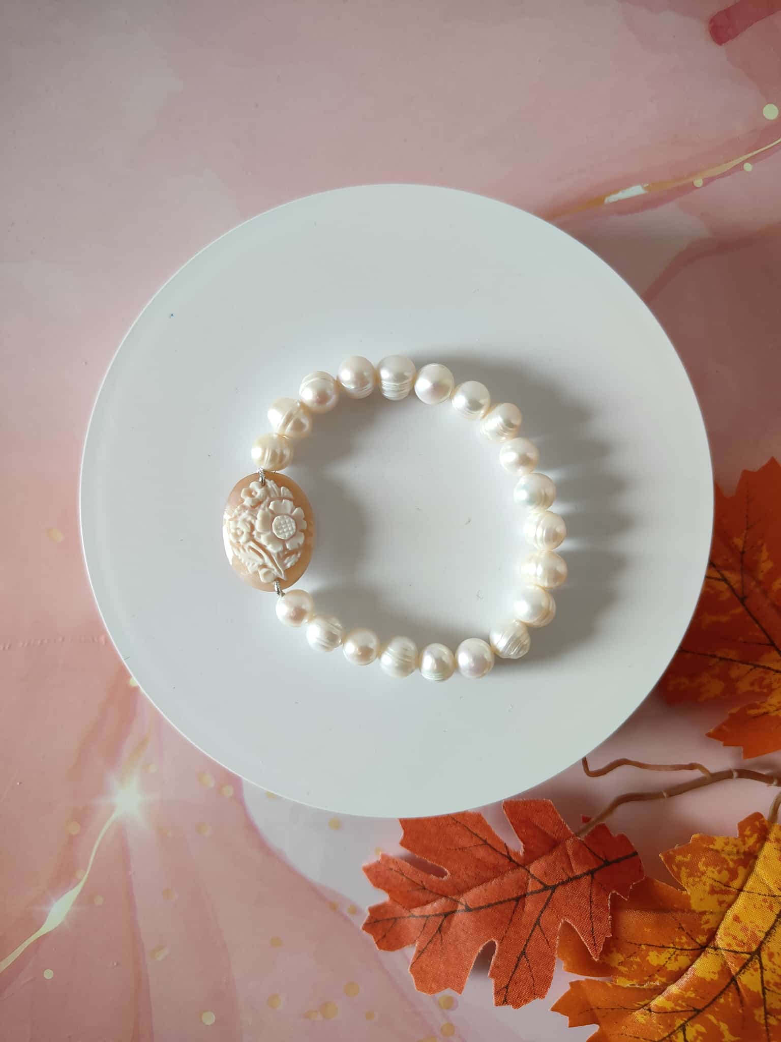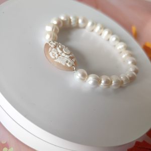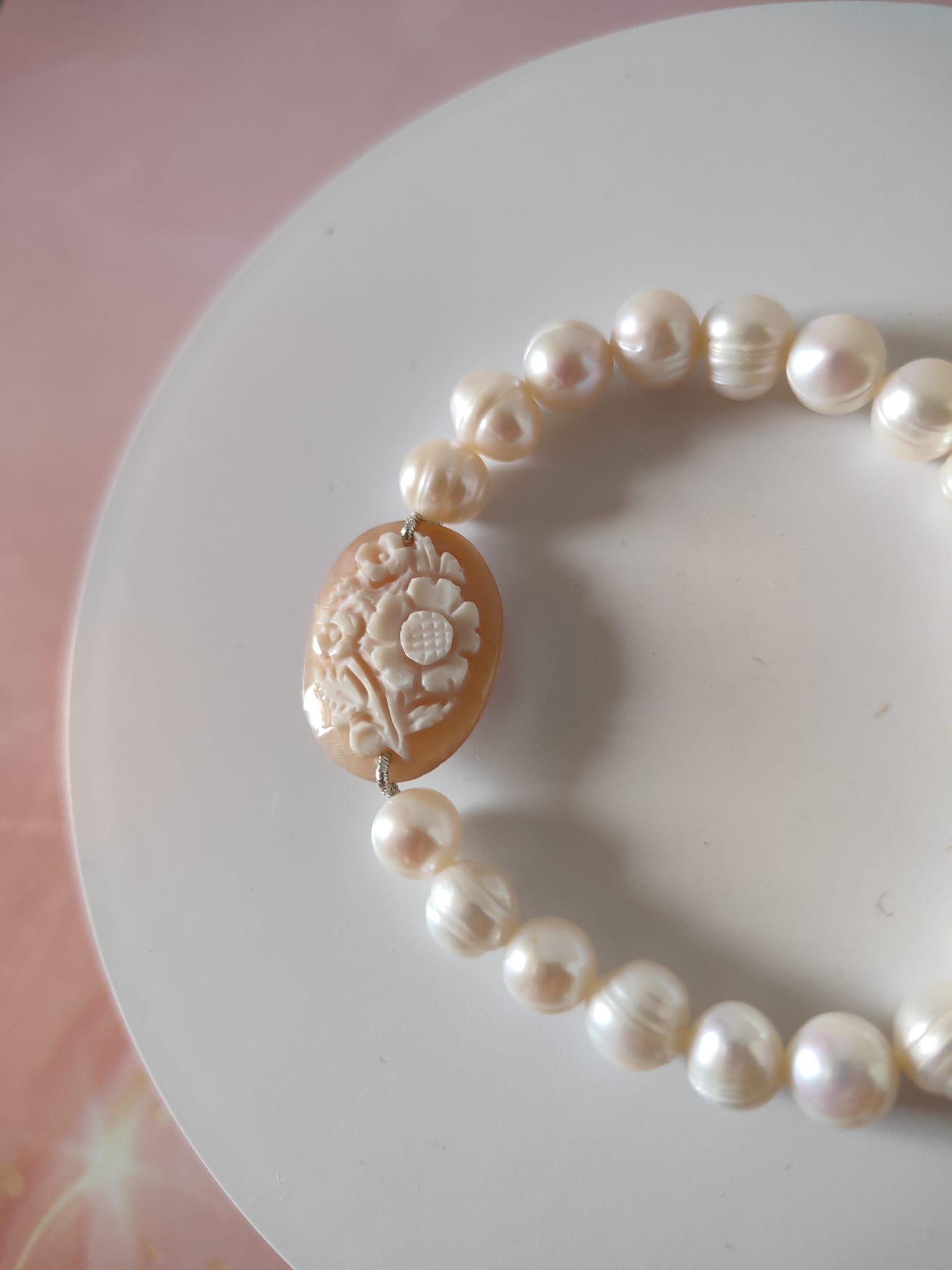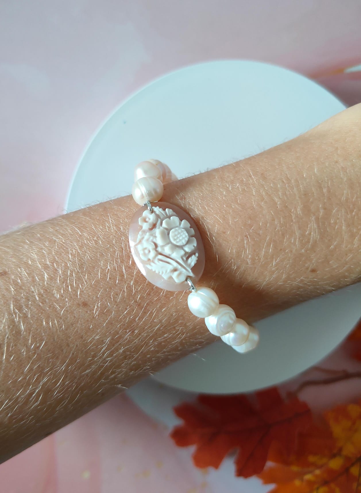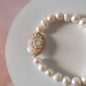 Bracciale Cammeo Floreale – un gioiello che racchiude la poesia dei fiori e la purezza luminosa delle perle. Nato dalla tradizione artigianale italiana, questo bracciale è un piccolo capolavoro di eleganza, in cui la maestria dell’incisione manuale incontra la naturale bellezza delle gemme del mare.