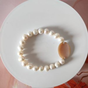Le perle naturali, selezionate una ad una per forma e lucentezza, compongono un cerchio elegante e fluido. Il bracciale è montato su filo elastico resistente, che ne garantisce comodità e adattabilità a qualsiasi polso, mantenendo un profilo raffinato e femminile.