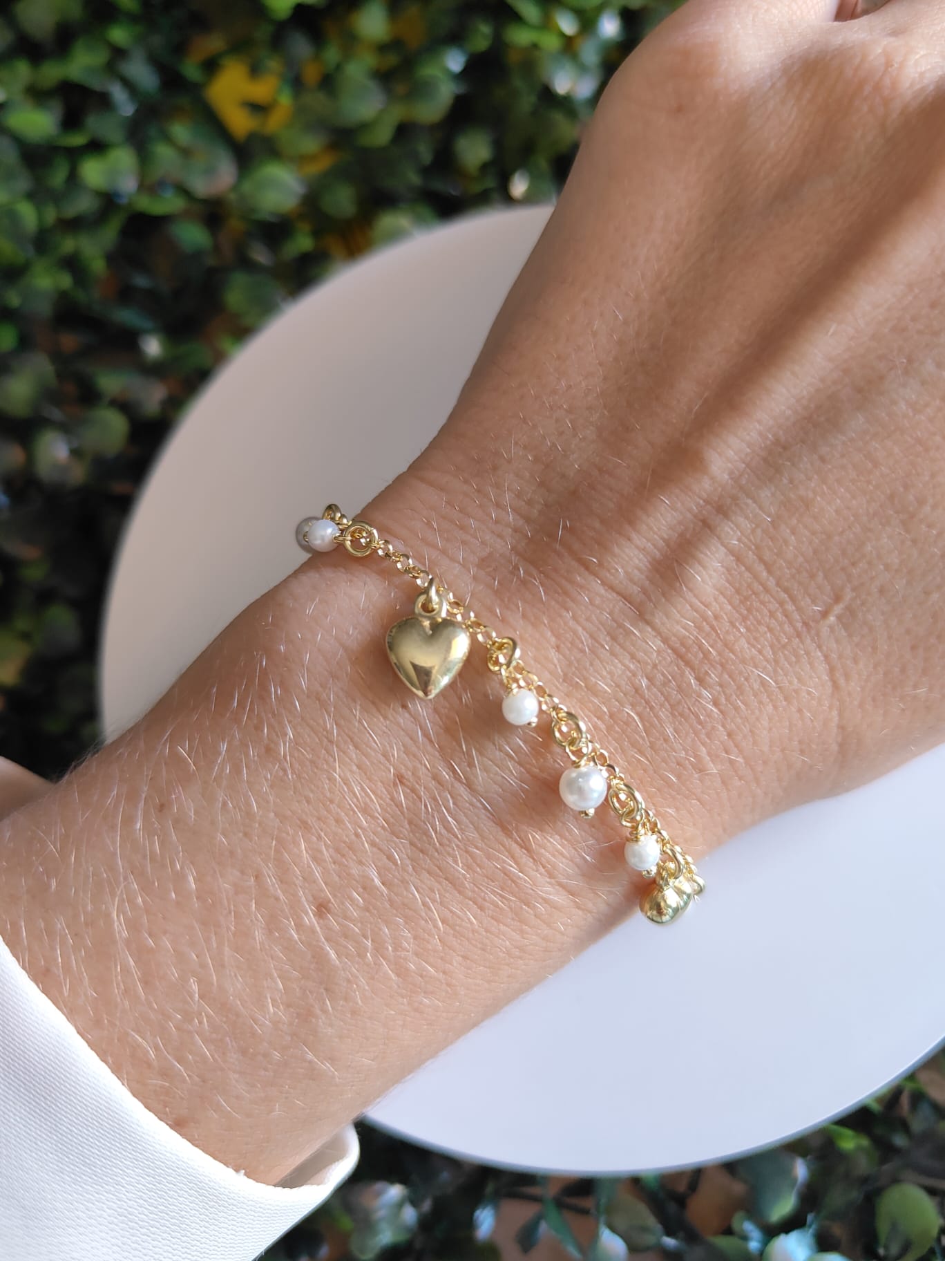 Le perle naturali, simbolo di purezza, illuminano il polso con riflessi morbidi e raffinati. I cuoricini dorati, invece, trasmettono un messaggio d’amore e di eleganza discreta. Il risultato è un gioiello che esalta la femminilità in modo delicato, ma deciso.