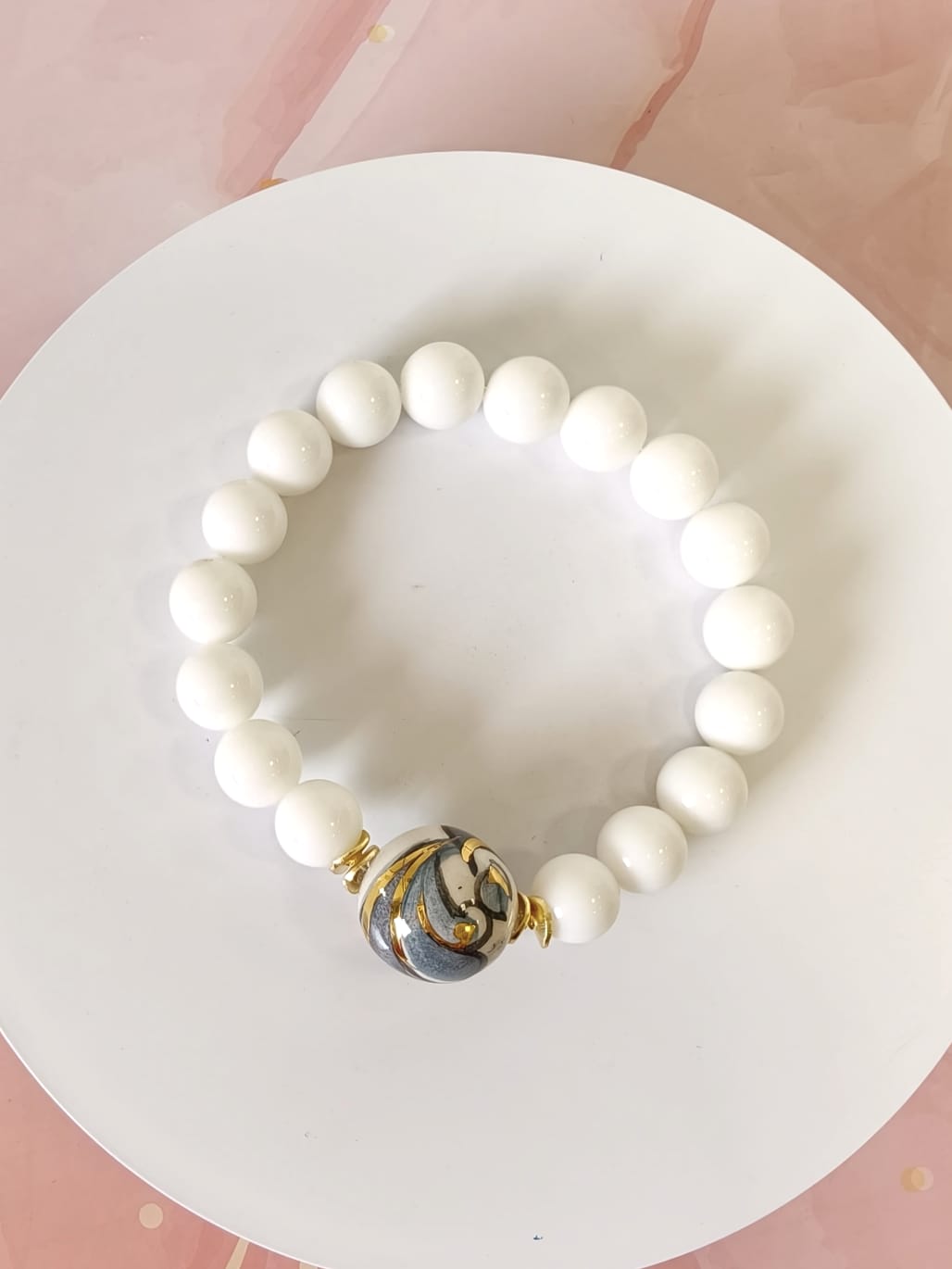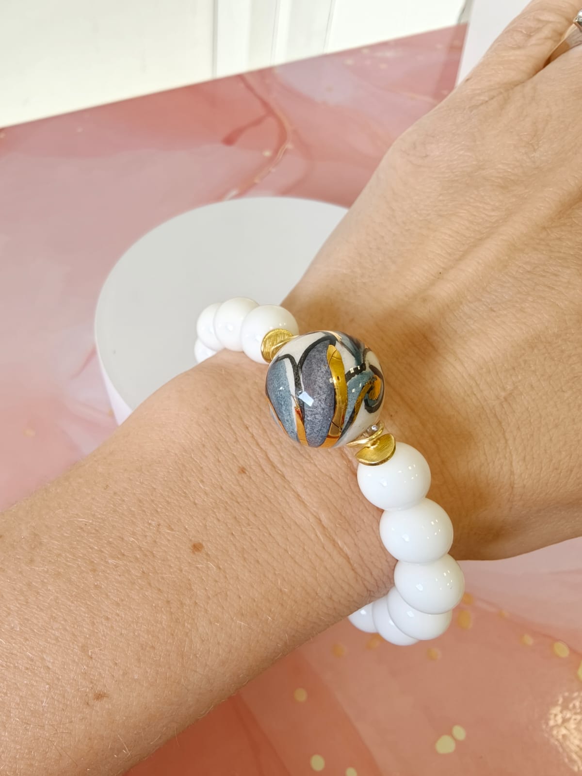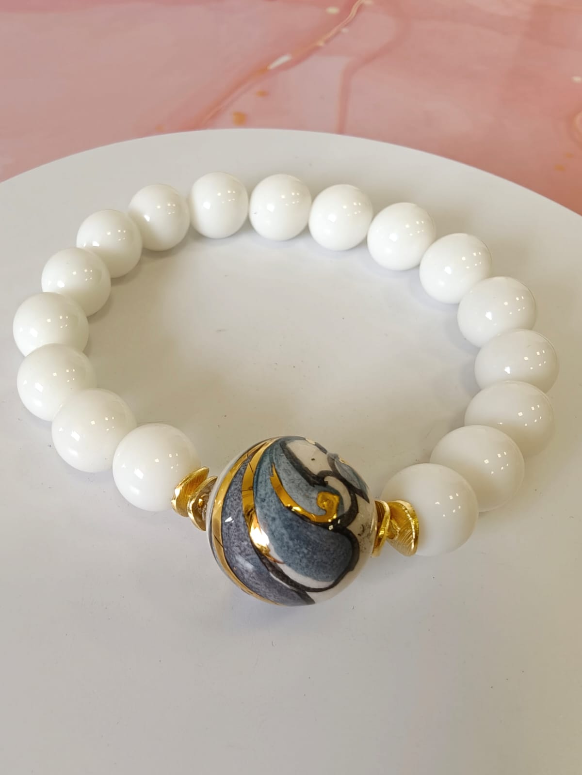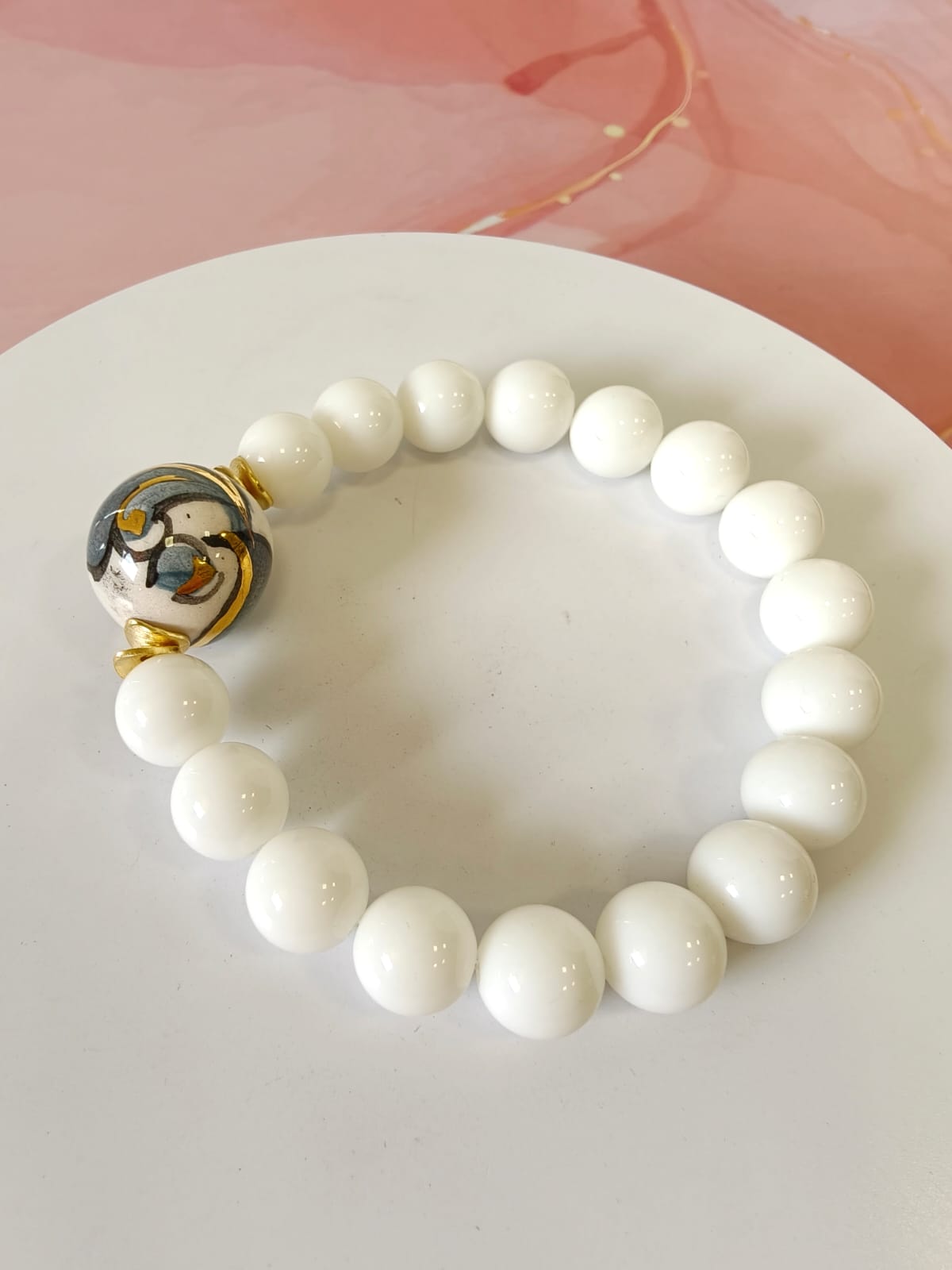 Al centro del bracciale è inserita una sfera in ceramica di Caltagirone dipinta a mano, impreziosita da riporti in oro. Le pennellate decorative e i dettagli dorati creano un contrasto raffinato con il bianco dell’agata. Di conseguenza, la ceramica diventa il punto focale dell’intero gioiello.
