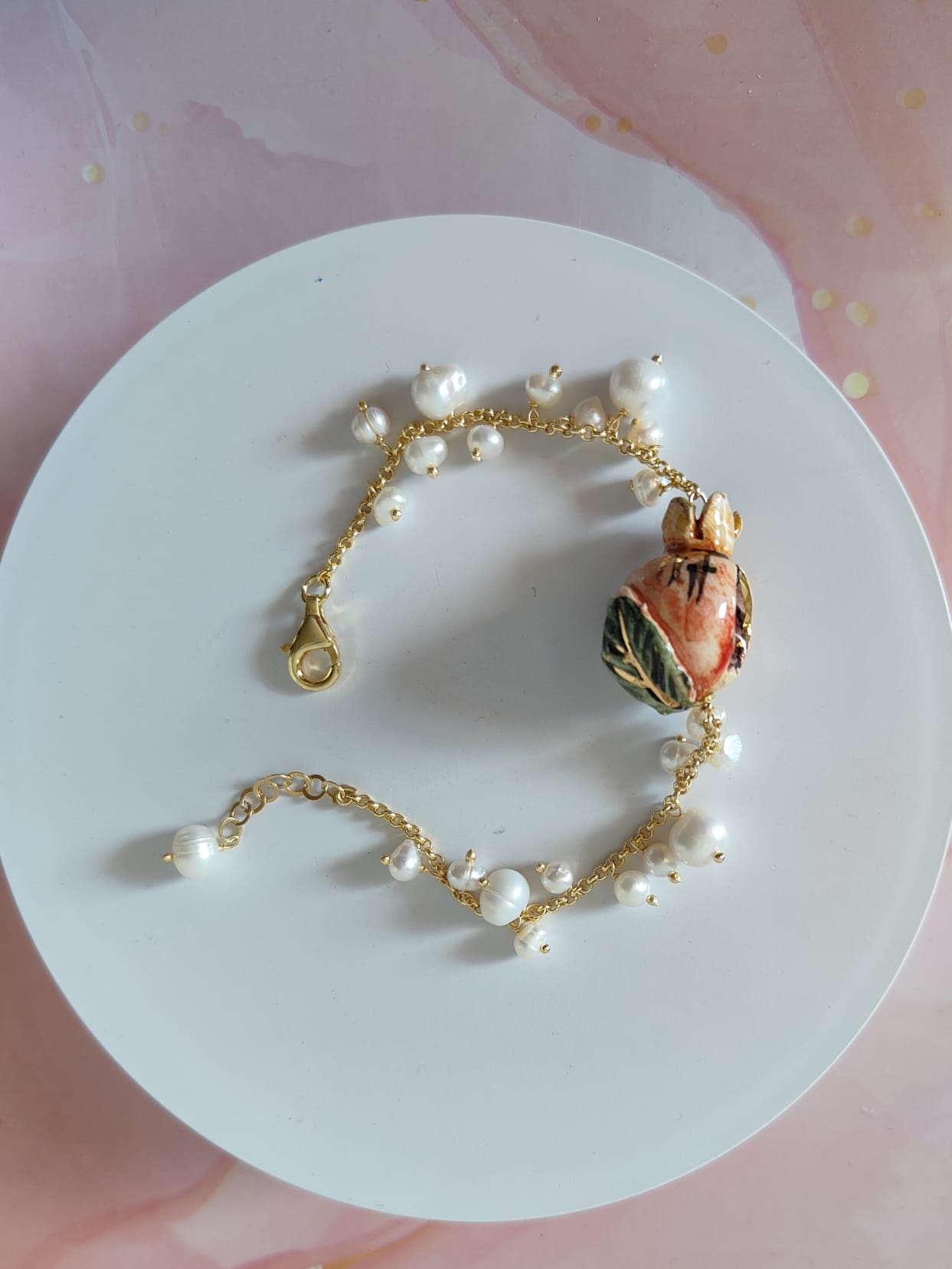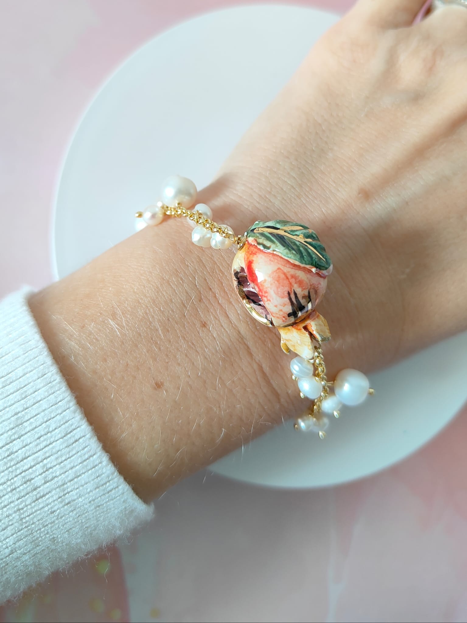 Materiali: ceramica dipinta a mano, perle naturali, catena in ottone dorato anallergico.