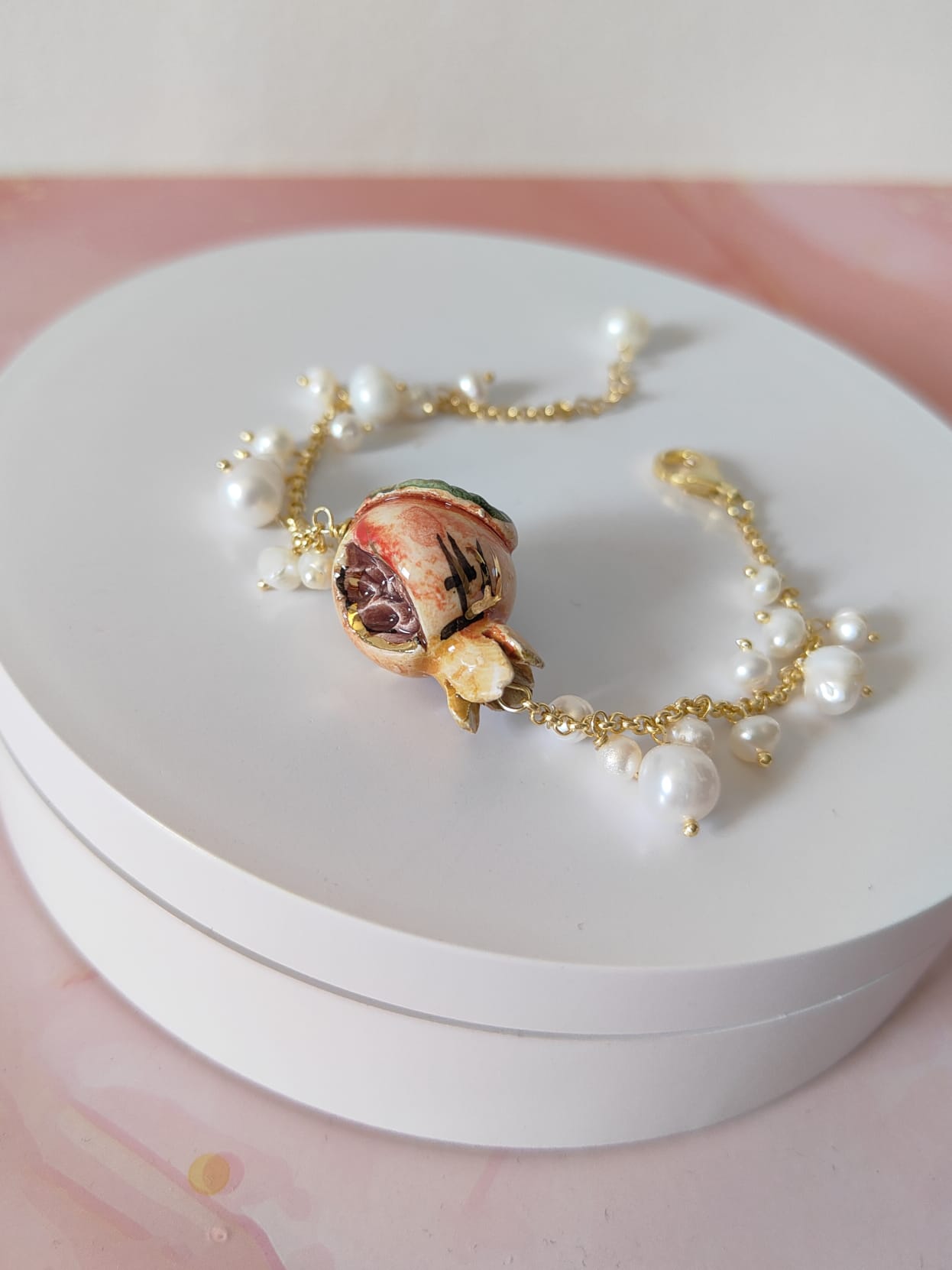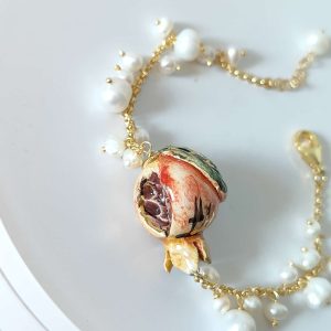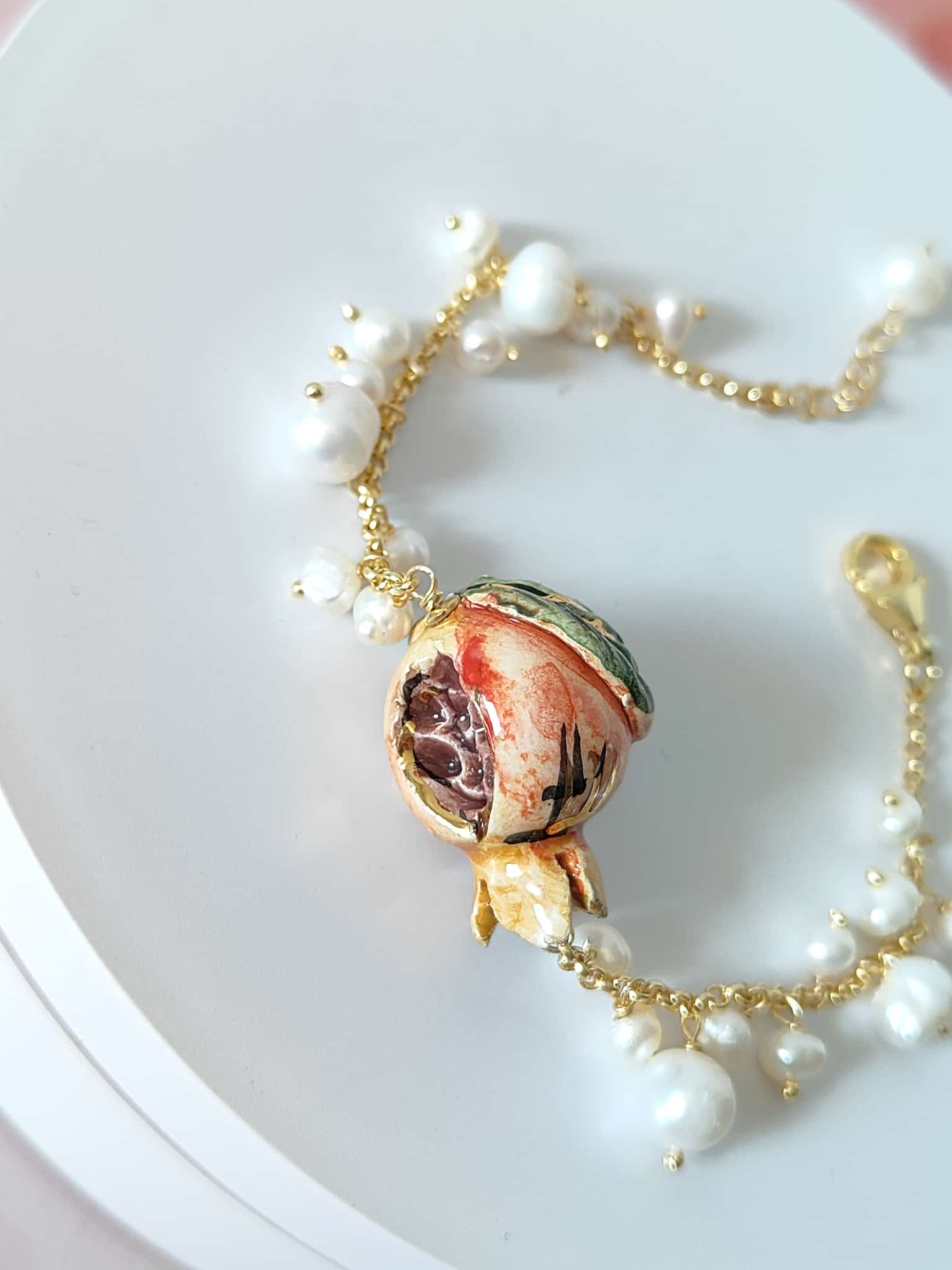 La chiusura a moschettone garantisce praticità e sicurezza, mantenendo la leggerezza tipica dei gioielli artigianali. Il design è pensato per adattarsi a ogni stile: perfetto per impreziosire un outfit elegante o per dare un tocco sofisticato a un look quotidiano. Ogni bracciale melograno perle naturali è un piccolo capolavoro, espressione autentica della maestria ceramica italiana e della sua capacità di fondere arte e femminilità.