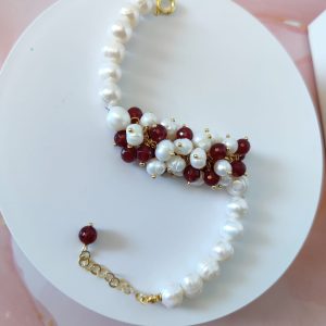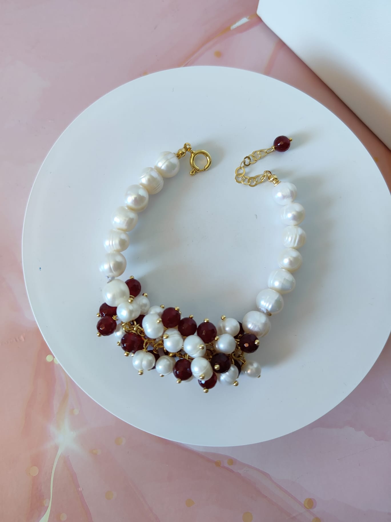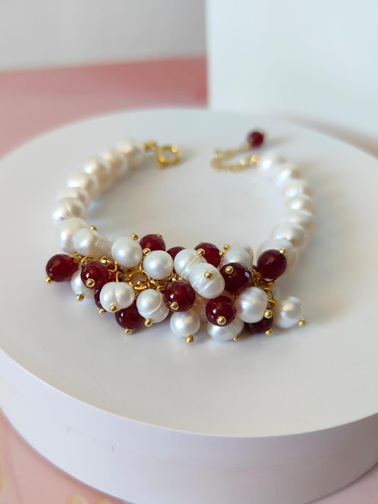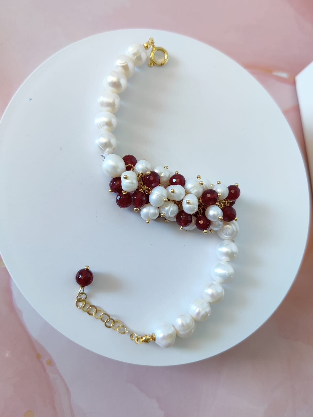 Il bracciale perle e agata è ideale per chi ama i contrasti raffinati: la purezza del bianco e la profondità del borgogna si fondono in un equilibrio cromatico che dona luce a ogni look.