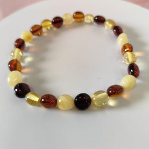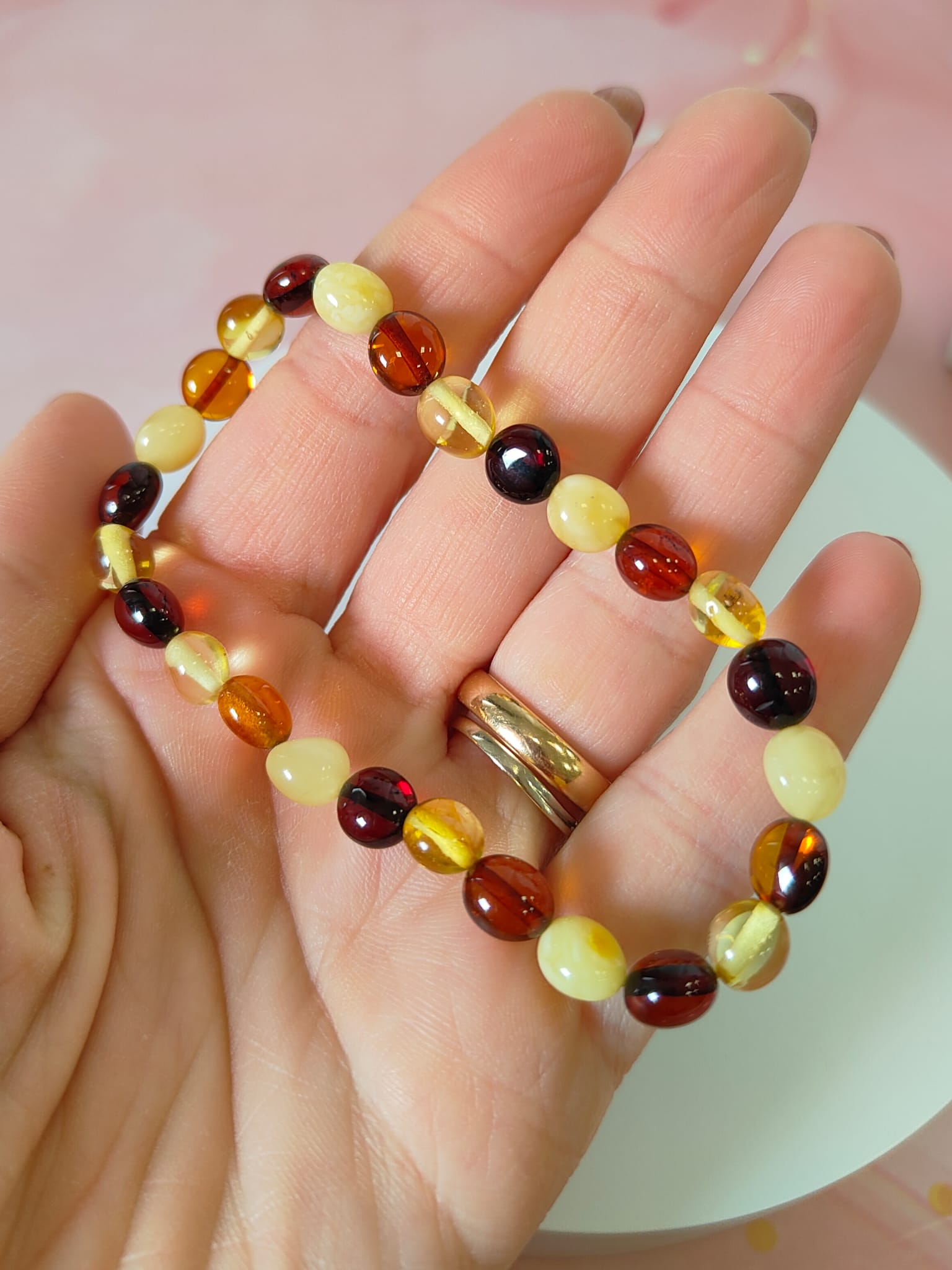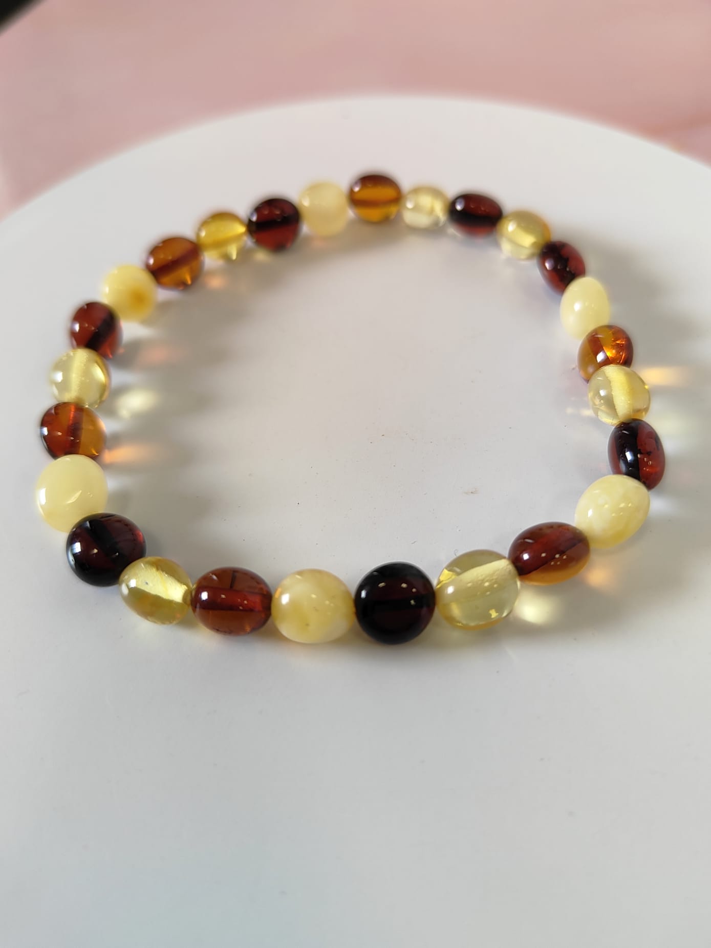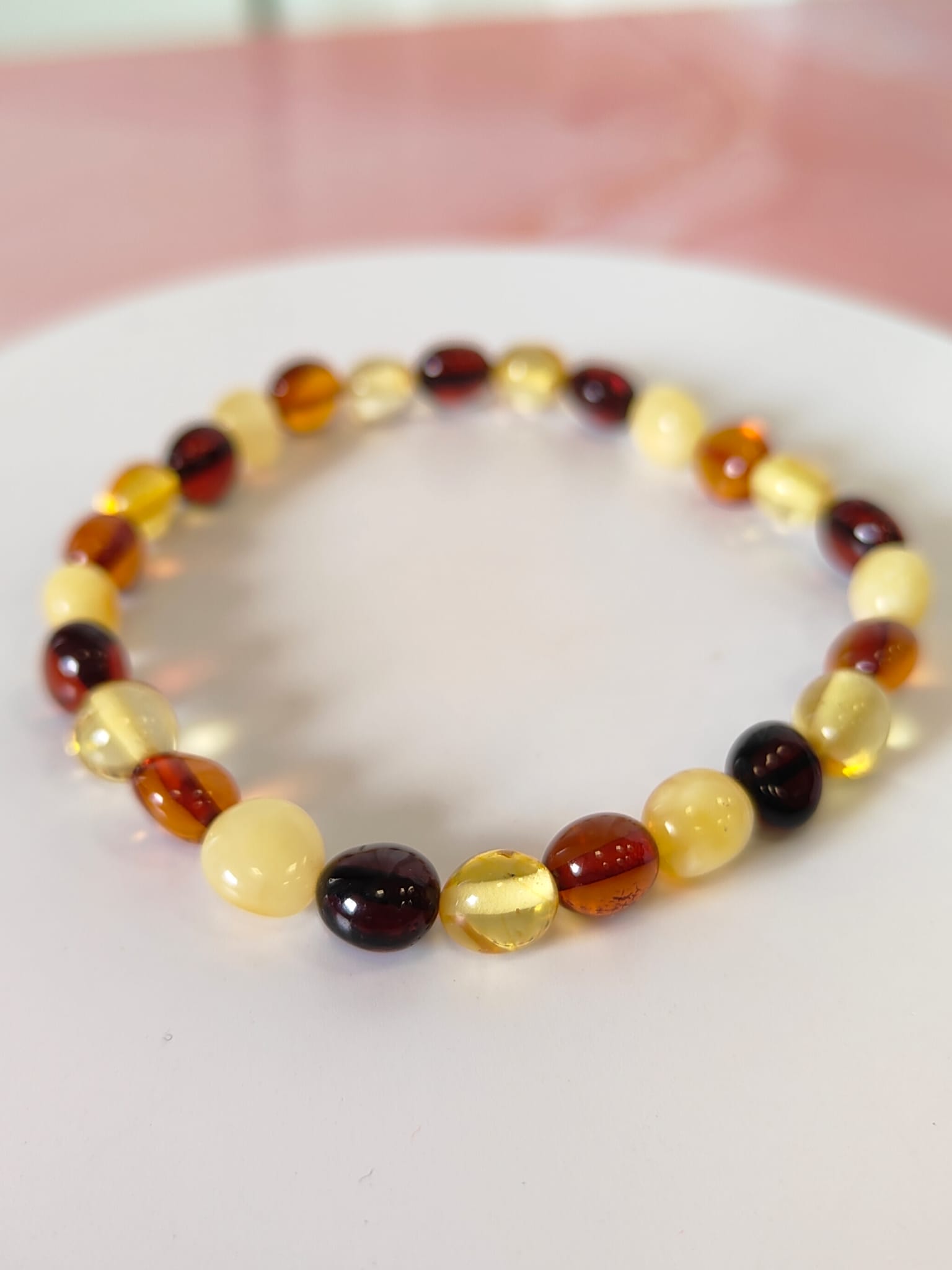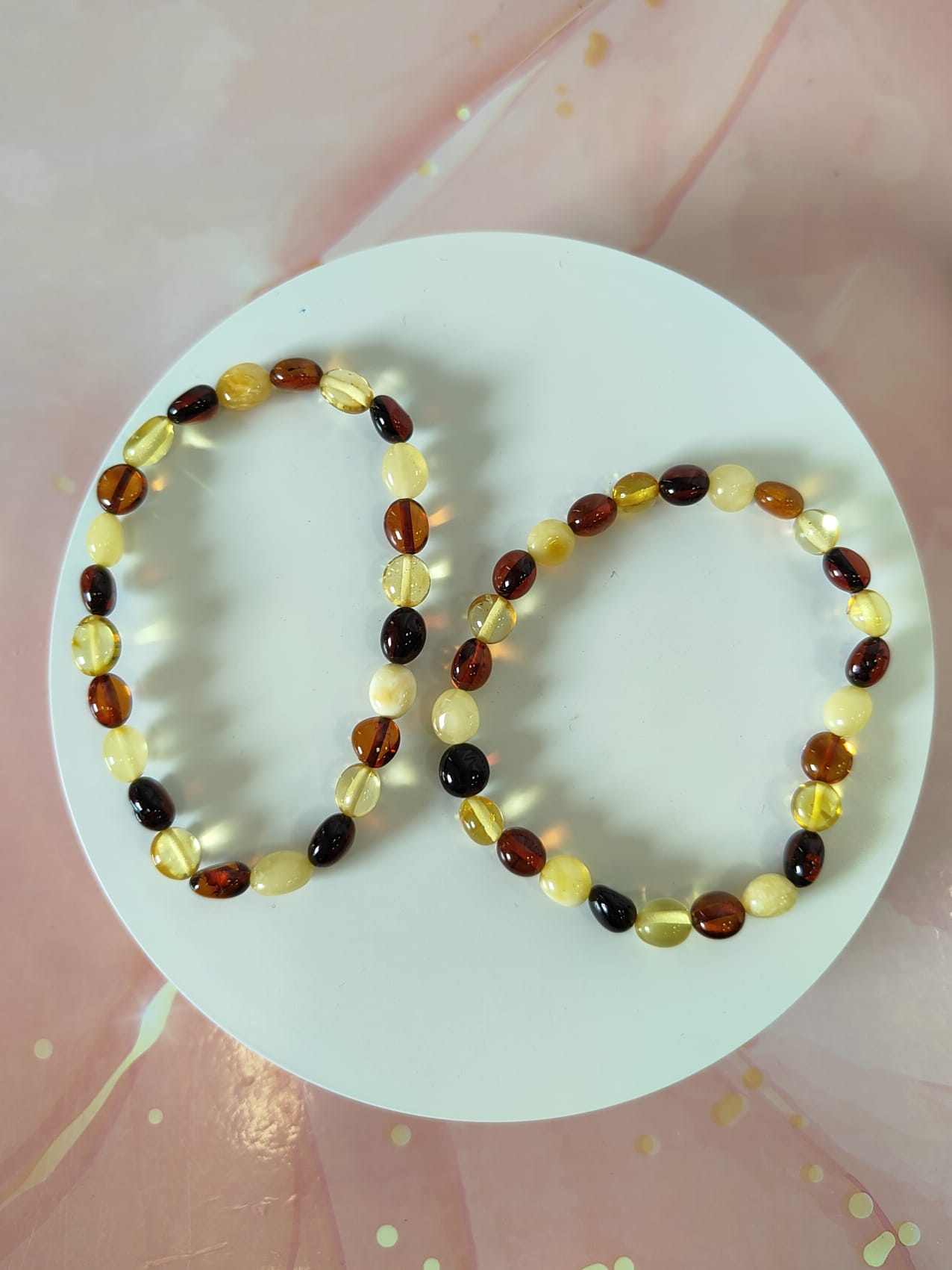 Questa creazione artigianale è proposta in due pezzi disponibili, realizzati con materiali naturali e selezionati con cura. Le leggere differenze tra un bracciale e l’altro testimoniano il fascino autentico dell’ambra e rendono ogni gioiello unico nella sua sfumatura.