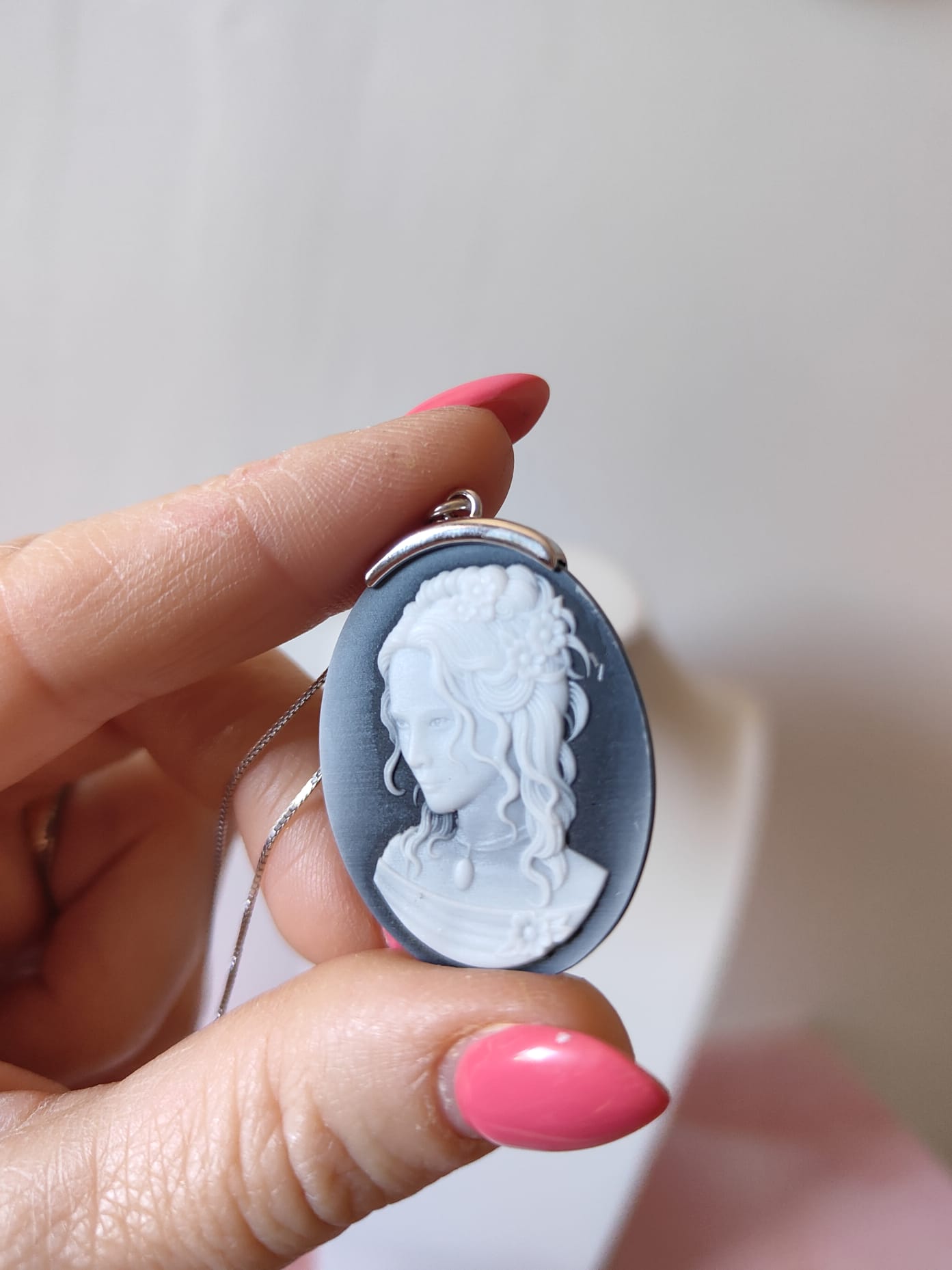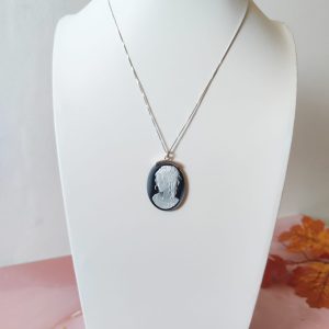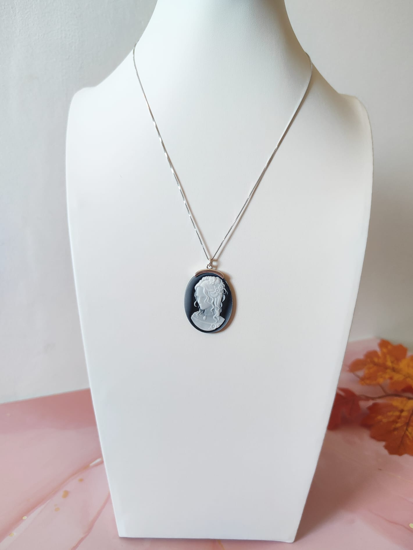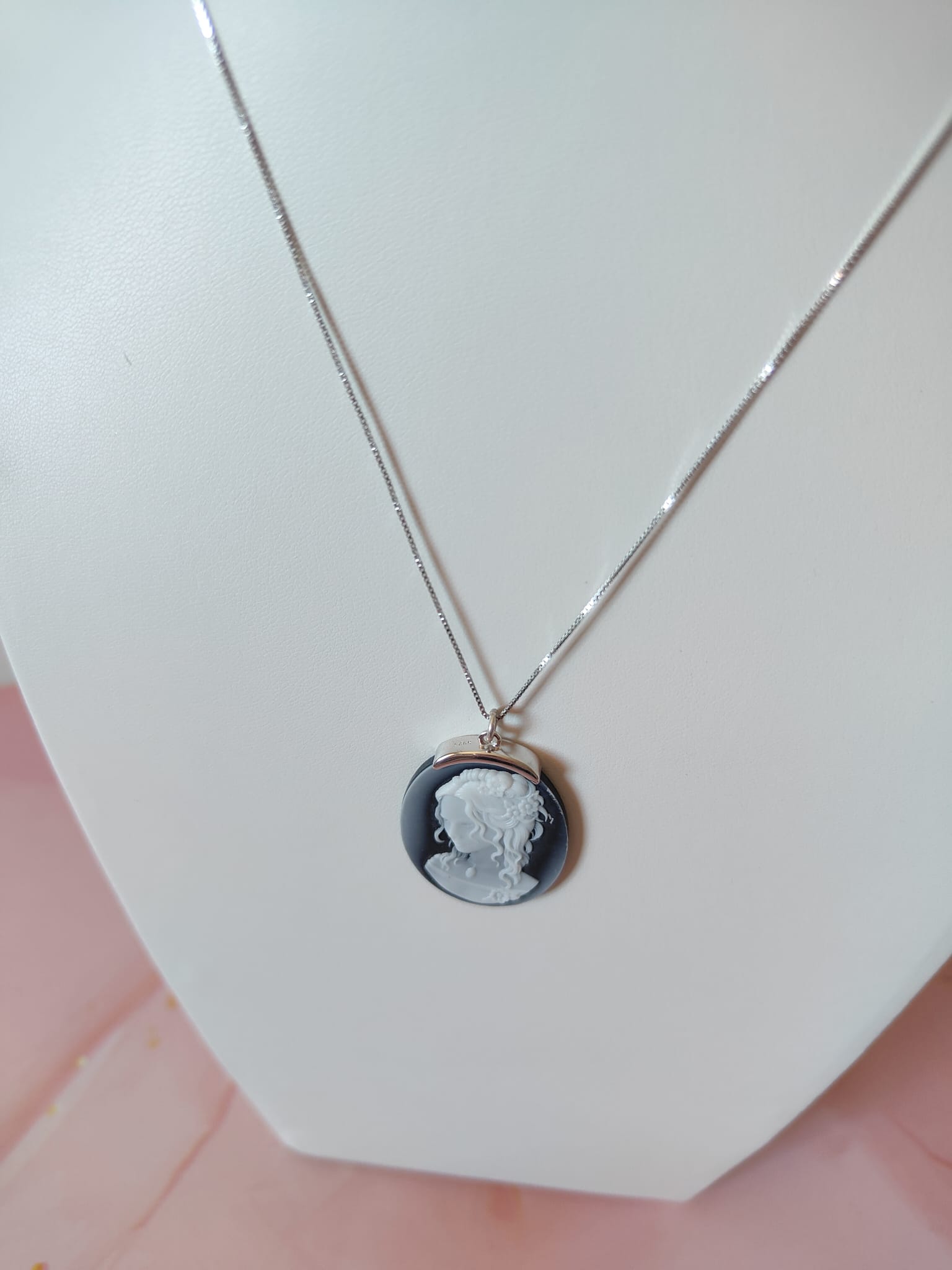 La collana cammeo agata nera in argento 925 è un gioiello esclusivo e raffinato, pensato per chi desidera indossare un accessorio intramontabile, ricco di storia e fascino. Il ciondolo ovale raffigura una dama di profilo finemente incisa, con lineamenti delicati, acconciatura ricca di dettagli e un raffinato gioiello al collo. L’intaglio, realizzato con estrema precisione, trasforma la pietra in una piccola opera d’arte capace di catturare lo sguardo e trasmettere eleganza.