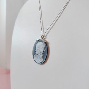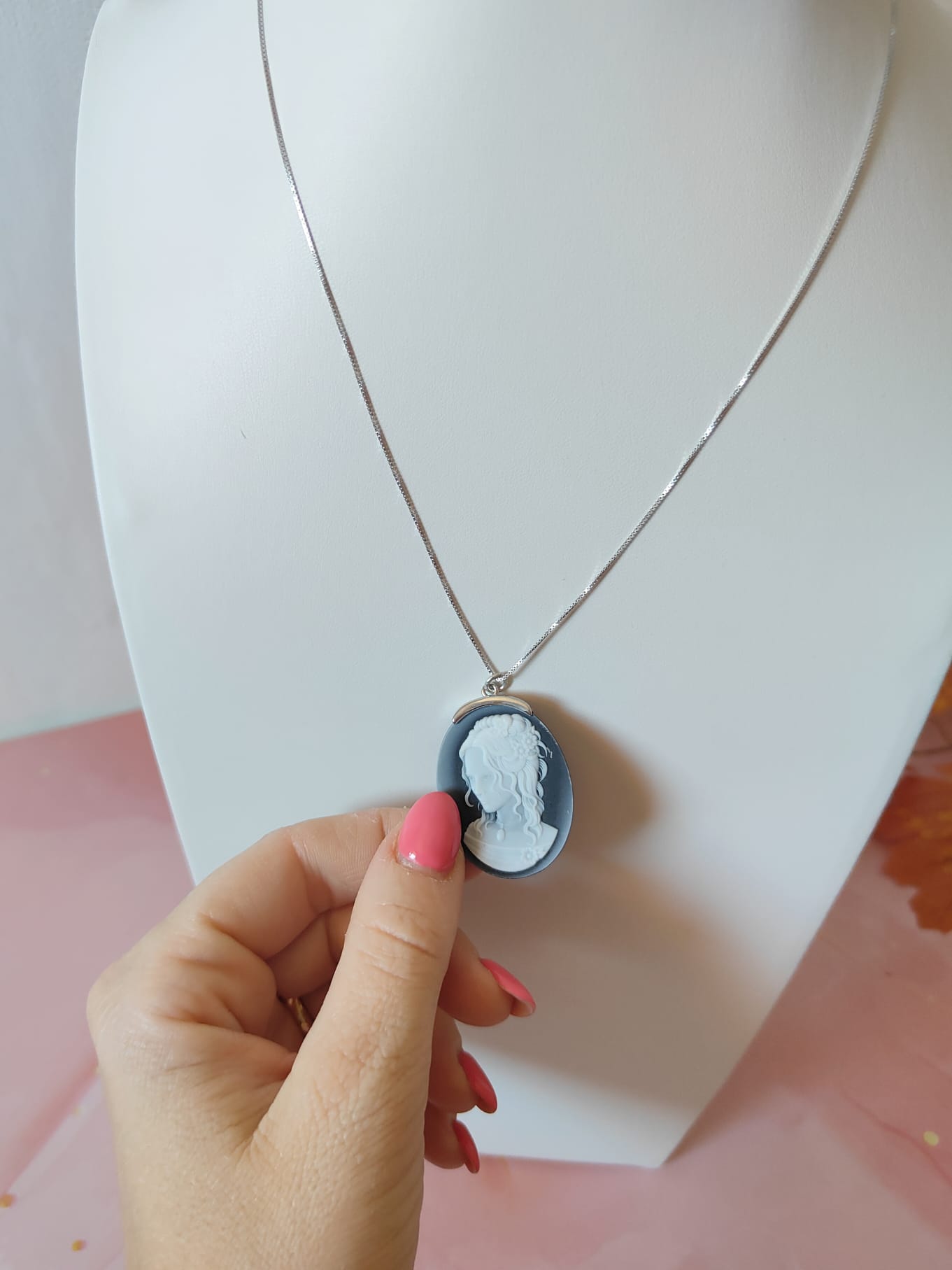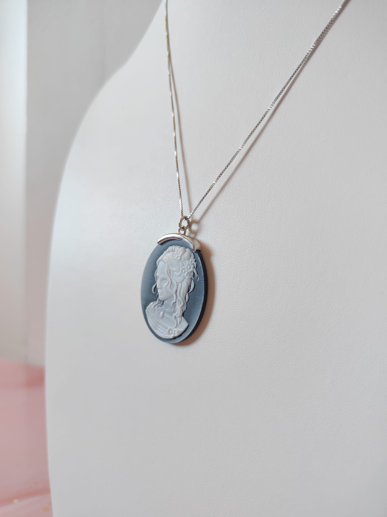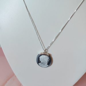 La collana cammeo agata nera in argento 925 è un gioiello esclusivo e raffinato, pensato per chi desidera indossare un accessorio intramontabile, ricco di storia e fascino. Il ciondolo ovale raffigura una dama di profilo finemente incisa, con lineamenti delicati, acconciatura ricca di dettagli e un raffinato gioiello al collo. L’intaglio, realizzato con estrema precisione, trasforma la pietra in una piccola opera d’arte capace di catturare lo sguardo e trasmettere eleganza.
