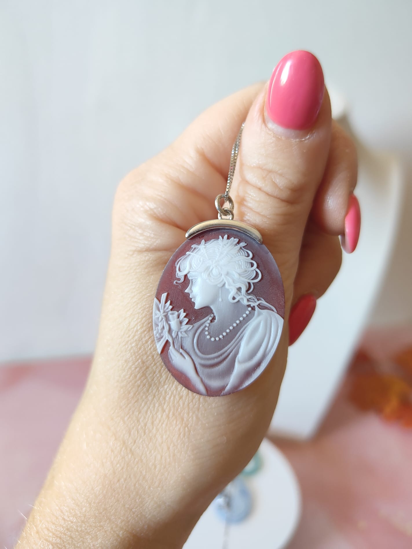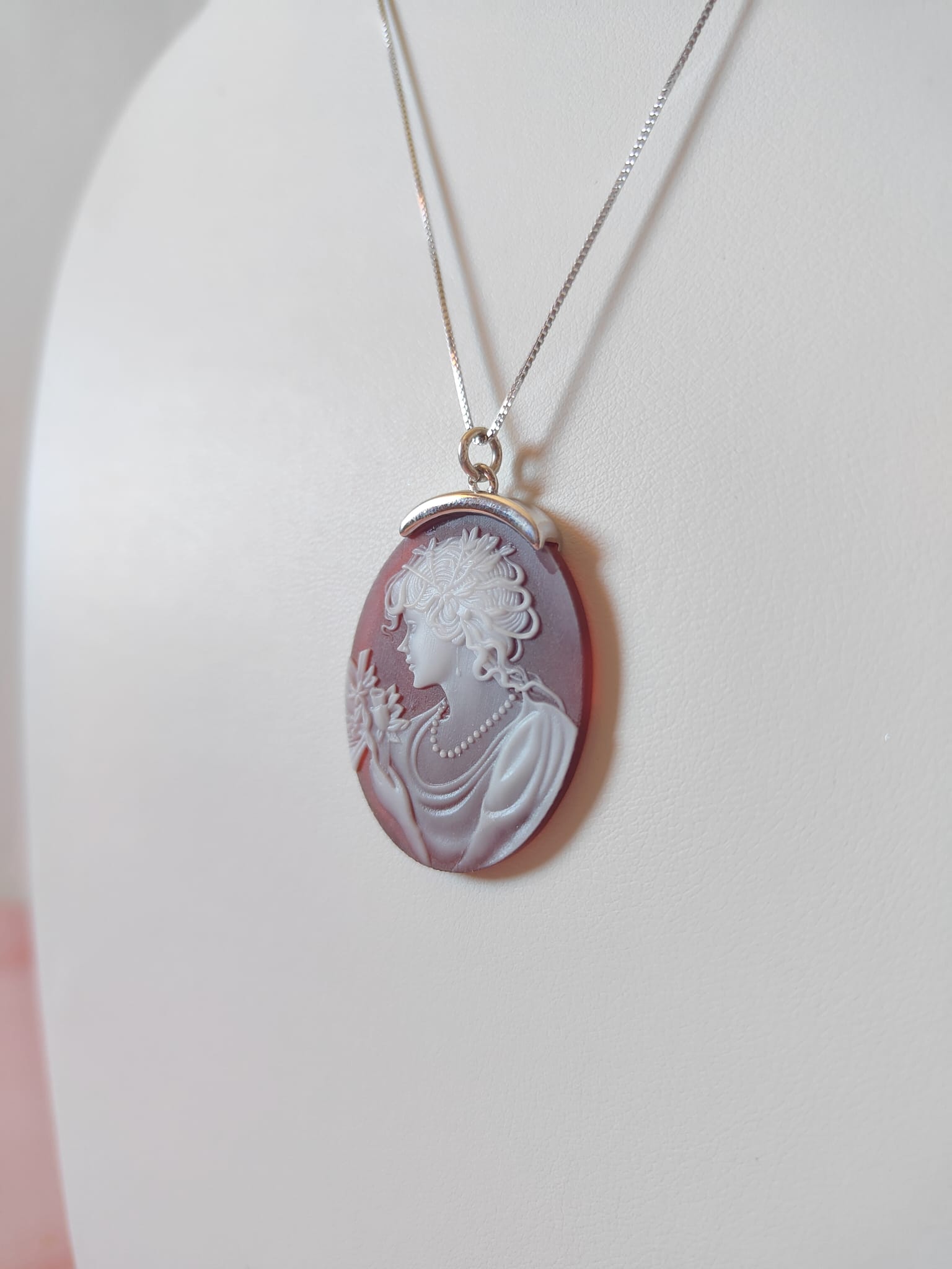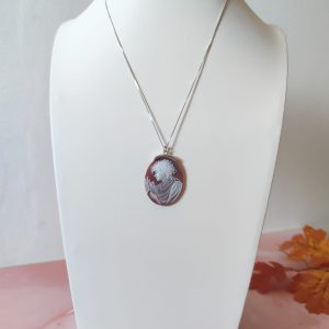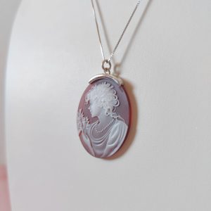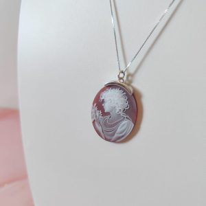 La collana cammeo agata rossa in argento 925 è un gioiello di rara eleganza, un pezzo unico che unisce tradizione, artigianalità e stile senza tempo. Il ciondolo ovale, finemente inciso su agata naturale nelle tonalità del rosso e del bianco, raffigura una dama di profilo adornata da una collana di perle e fiori delicati. Ogni dettaglio è scolpito con grande precisione, trasformando la pietra in una vera e propria opera d’arte in miniatura.
