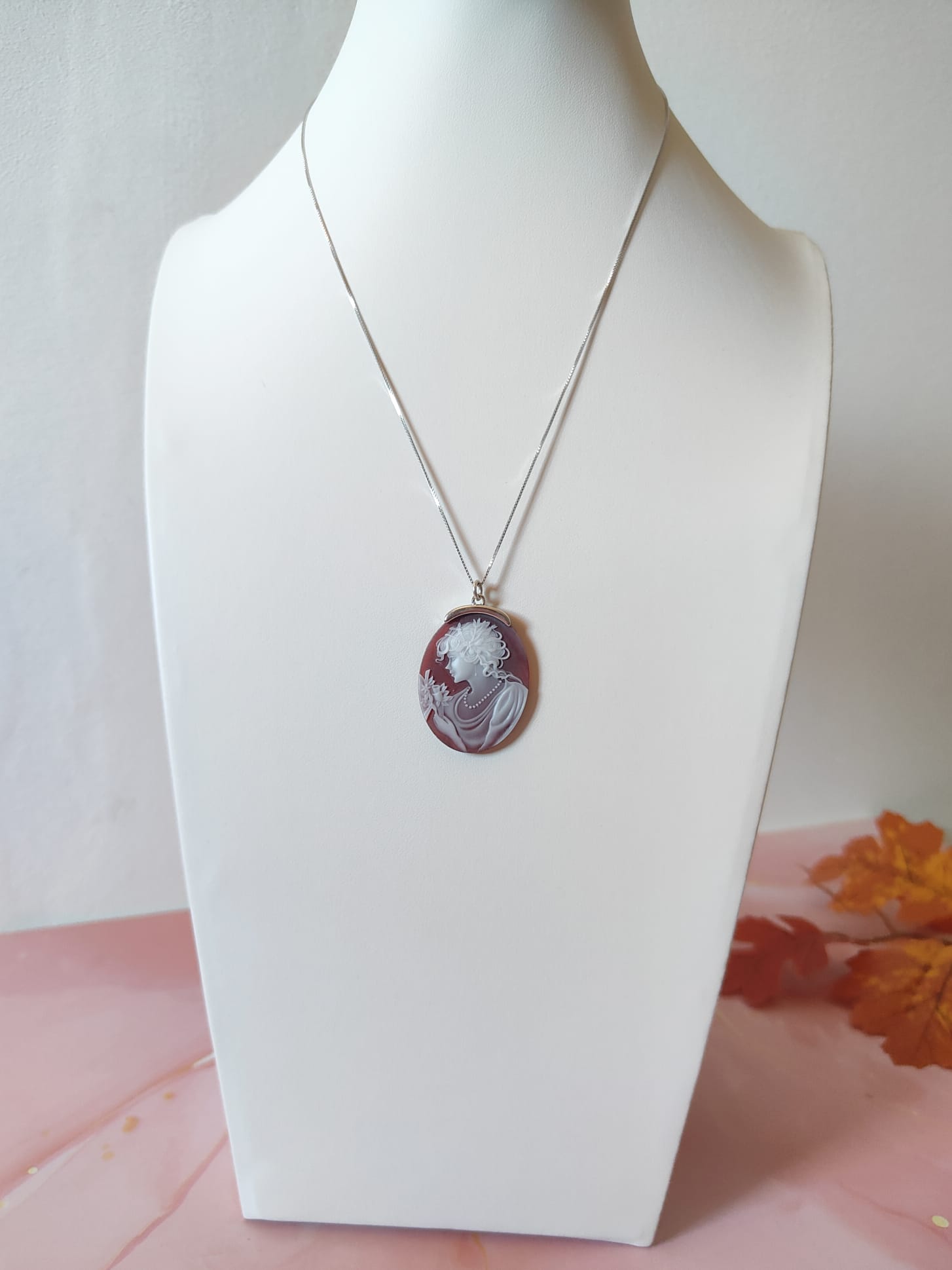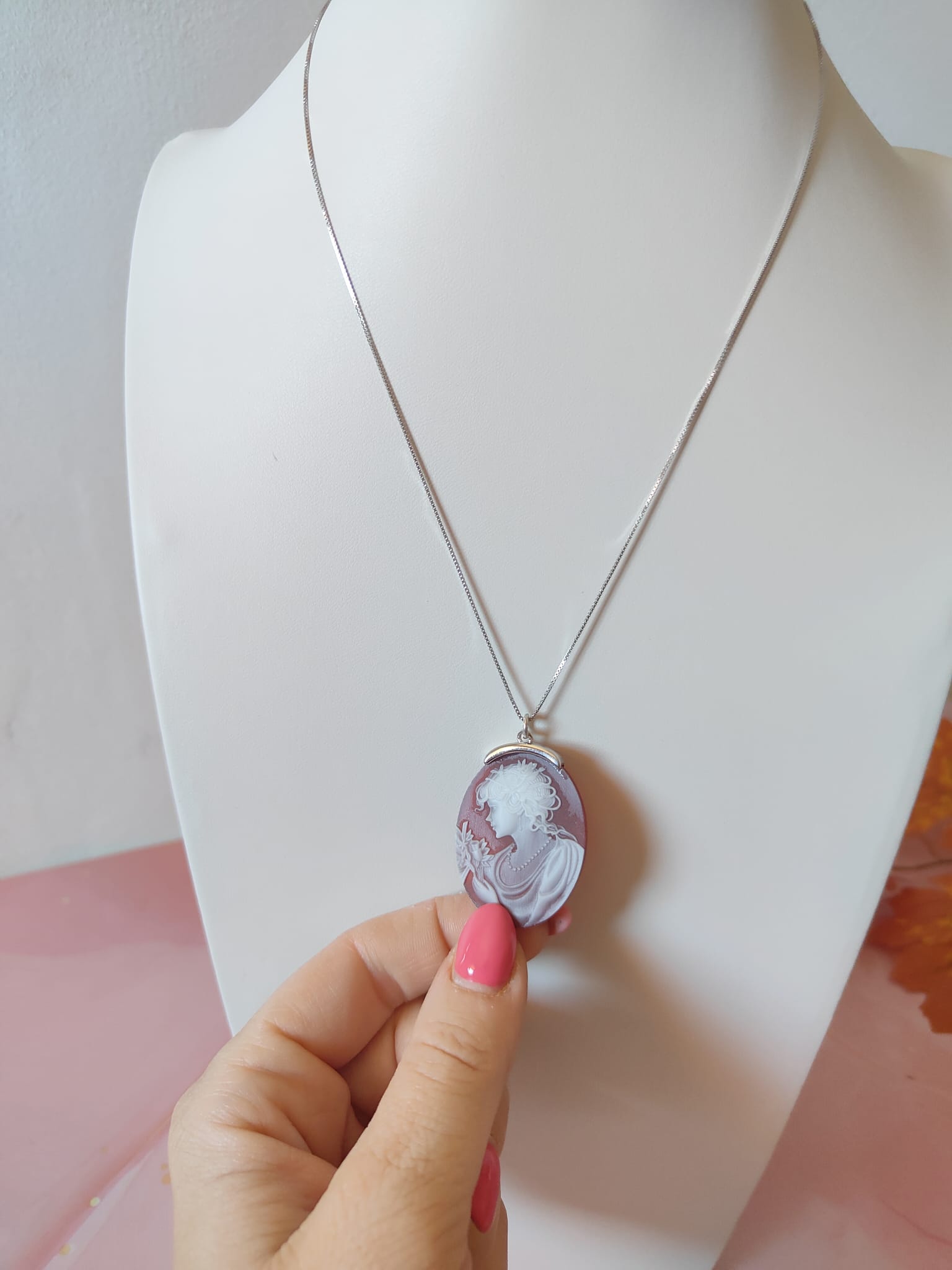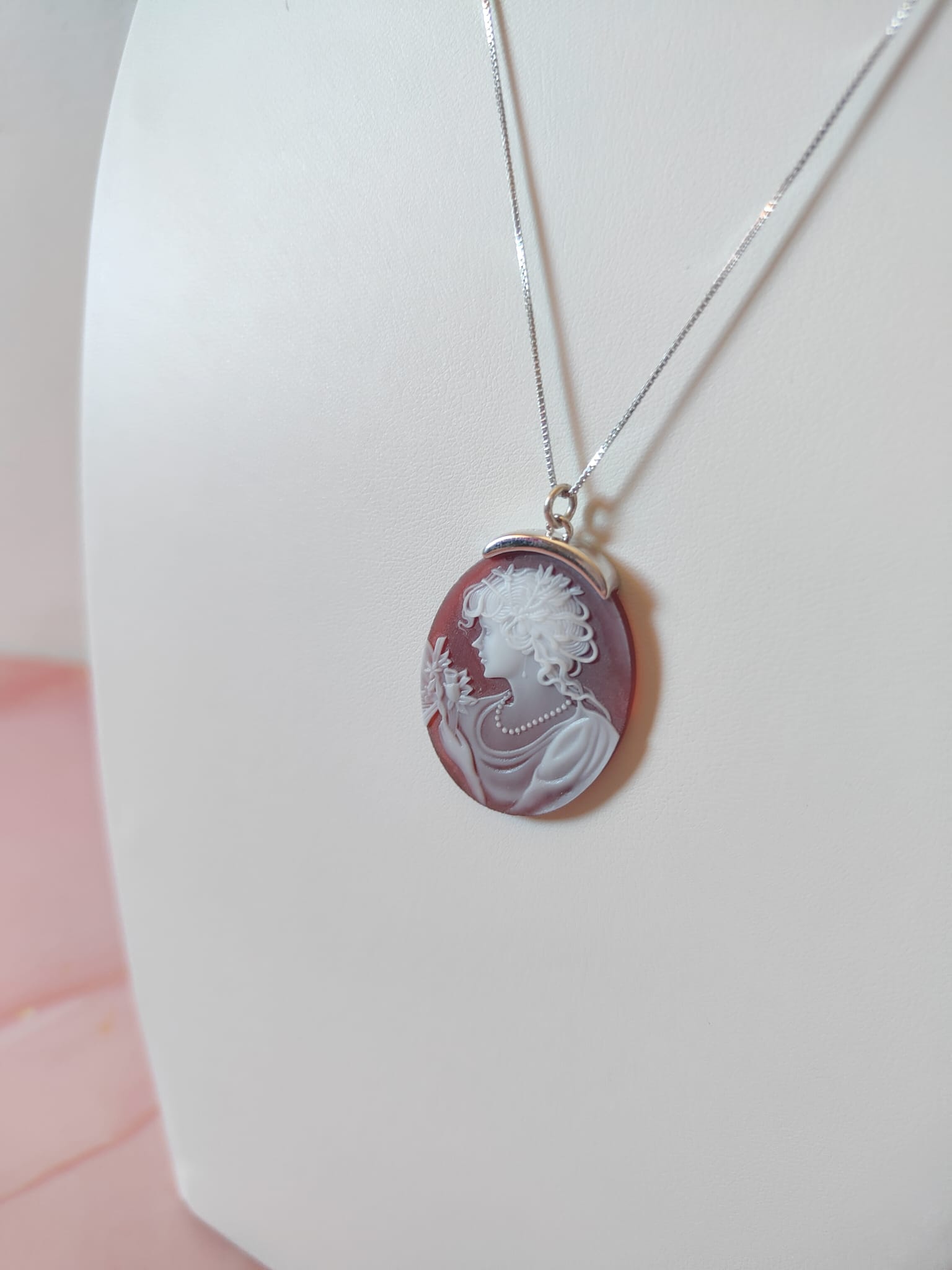 La collana cammeo agata rossa in argento 925 è un gioiello di rara eleganza, un pezzo unico che unisce tradizione, artigianalità e stile senza tempo. Il ciondolo ovale, finemente inciso su agata naturale nelle tonalità del rosso e del bianco, raffigura una dama di profilo adornata da una collana di perle e fiori delicati. Ogni dettaglio è scolpito con grande precisione, trasformando la pietra in una vera e propria opera d’arte in miniatura.