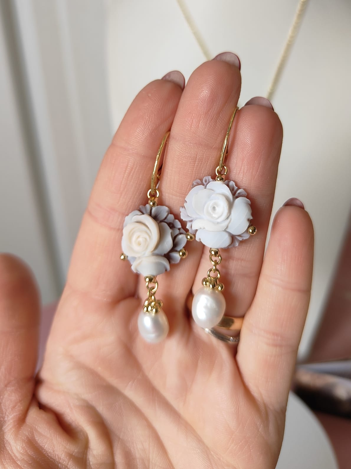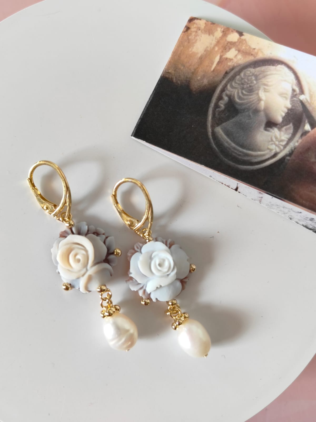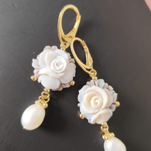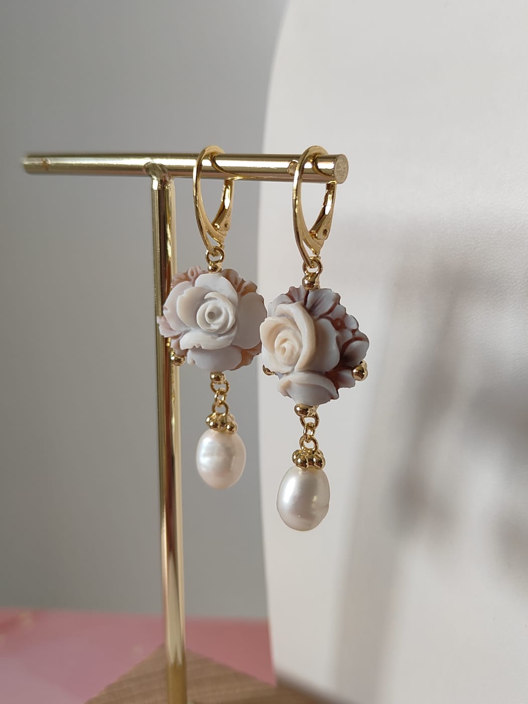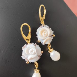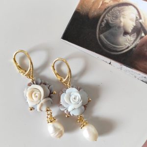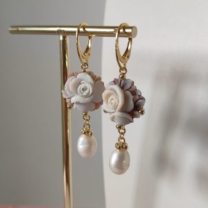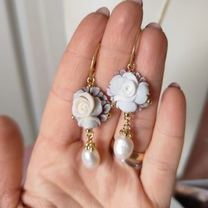 Gli orecchini si distinguono per la loro leggerezza visiva, grazie al cammeo rotondo che mette in risalto la rosa centrale e alla perla naturale pendente che aggiunge una nota di eleganza senza tempo. Il movimento fluido delle perle con il metallo dorato crea un equilibrio perfetto, rendendo questi orecchini ideali per un look romantico ma deciso.
