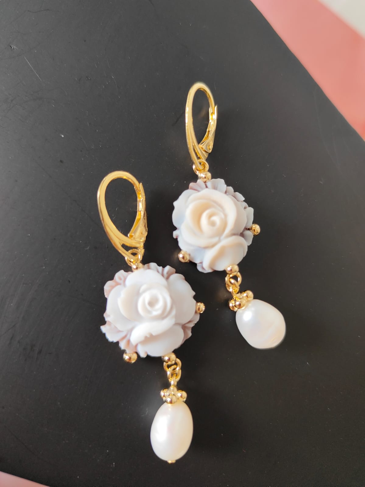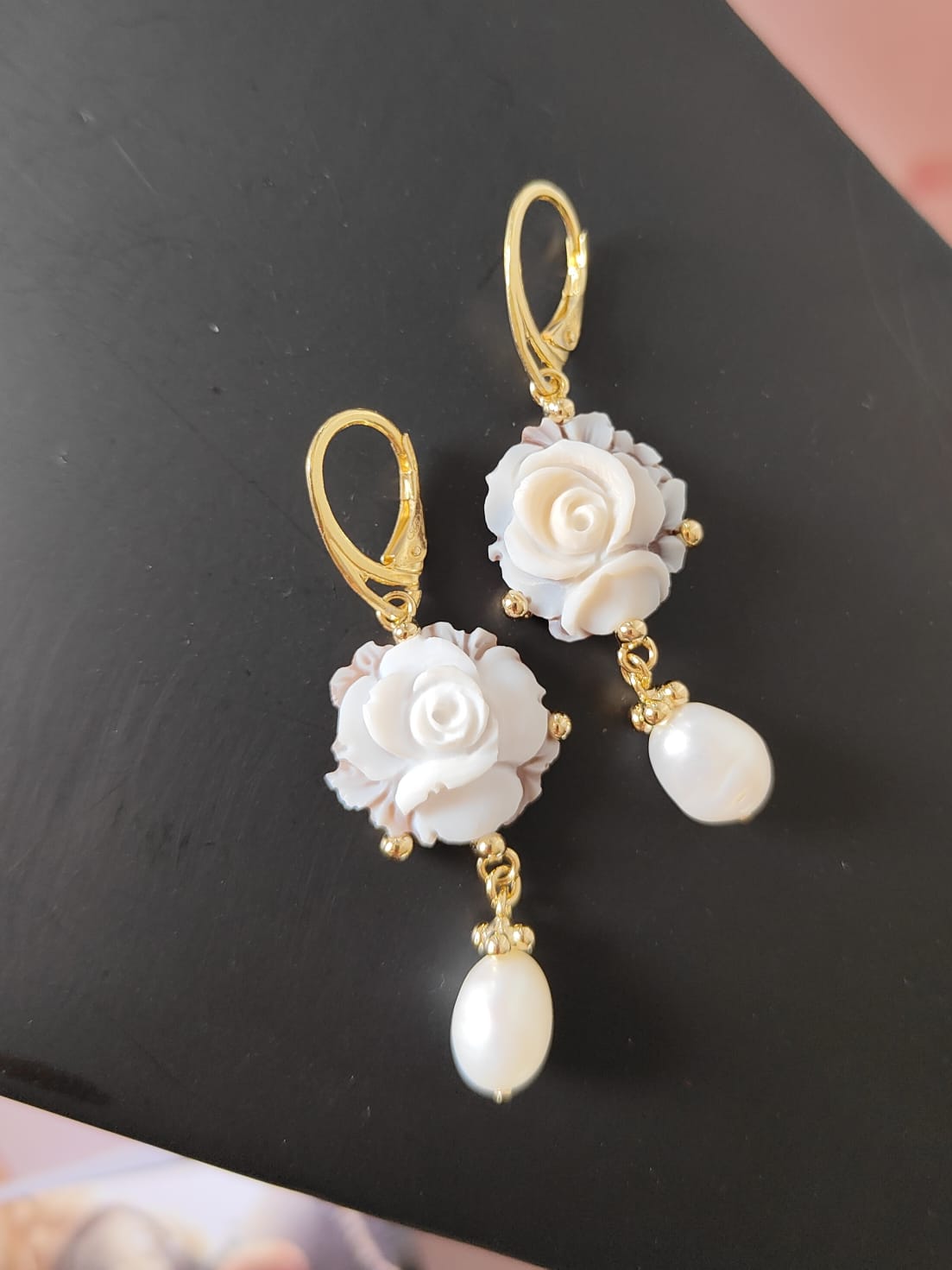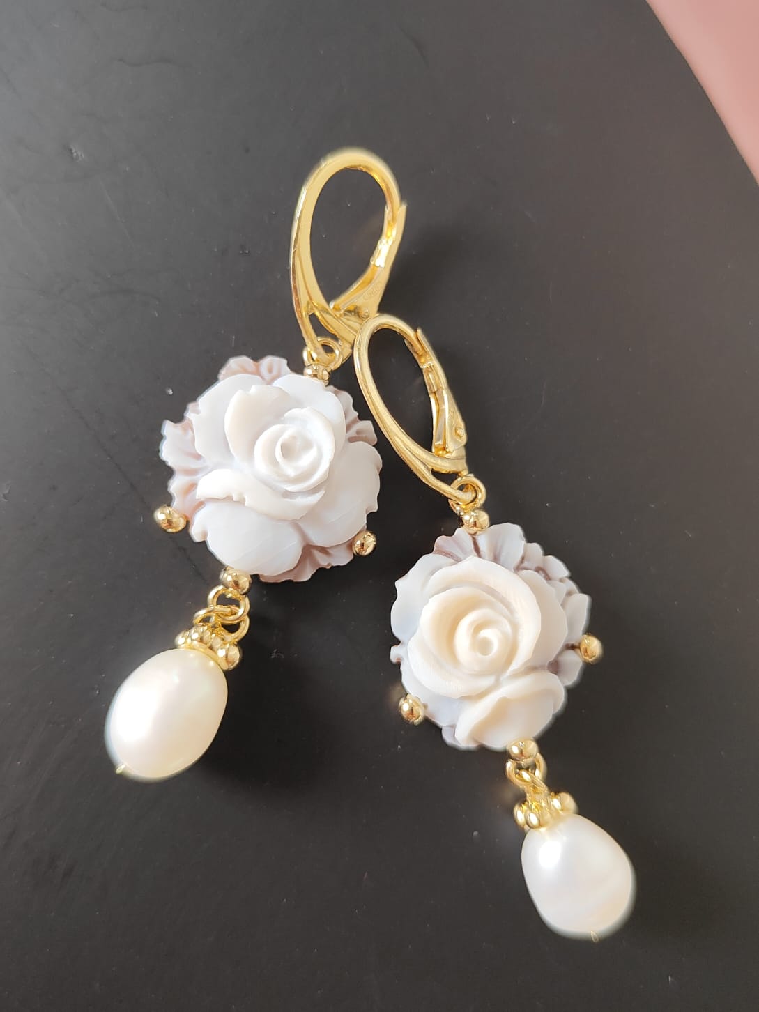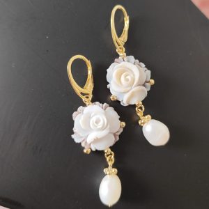 Gli orecchini si distinguono per la loro leggerezza visiva, grazie al cammeo rotondo che mette in risalto la rosa centrale e alla perla naturale pendente che aggiunge una nota di eleganza senza tempo. Il movimento fluido delle perle con il metallo dorato crea un equilibrio perfetto, rendendo questi orecchini ideali per un look romantico ma deciso.