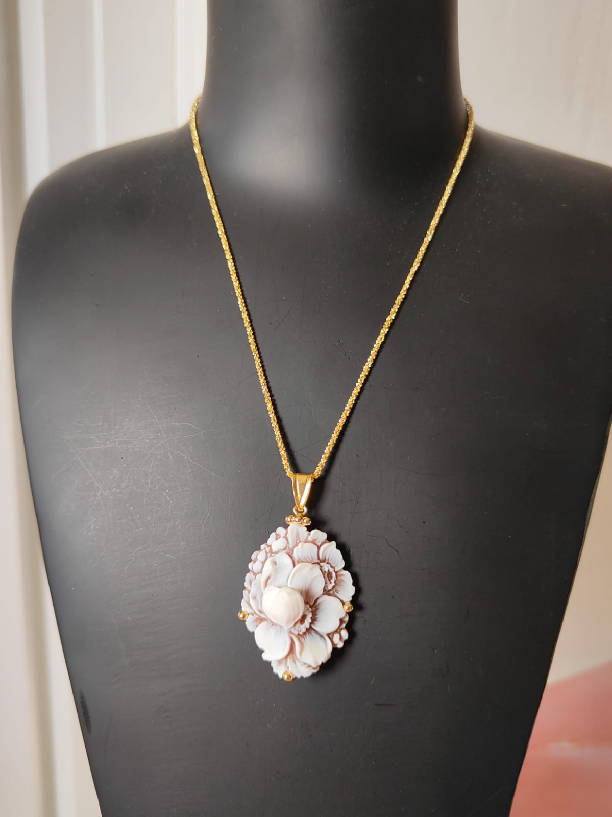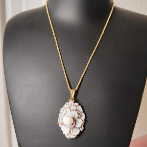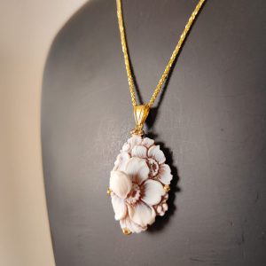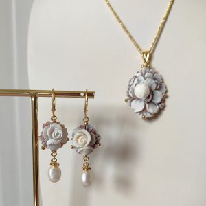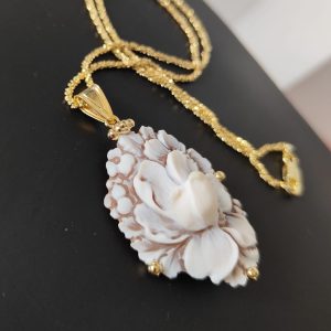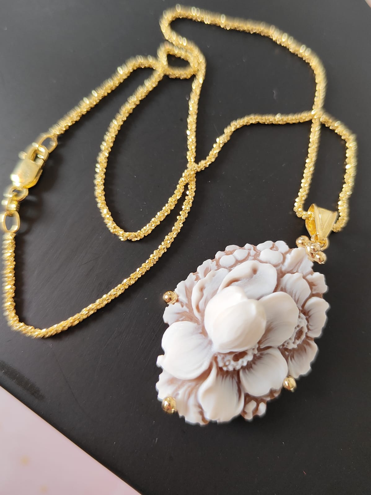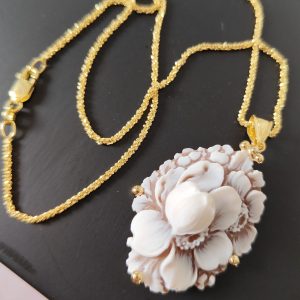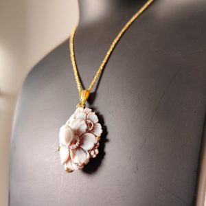 La collana riprende la delicatezza degli orecchini: il cammeo fiore sfioccato incorniciato dall’argento placcato oro diventa un punto luce delicato ma ricco di personalità. La catena sottile permette al ciondolo di essere protagonista senza risultare pesante, armonizzandosi con ogni tipo di outfit, da quello quotidiano a quello più elegante.